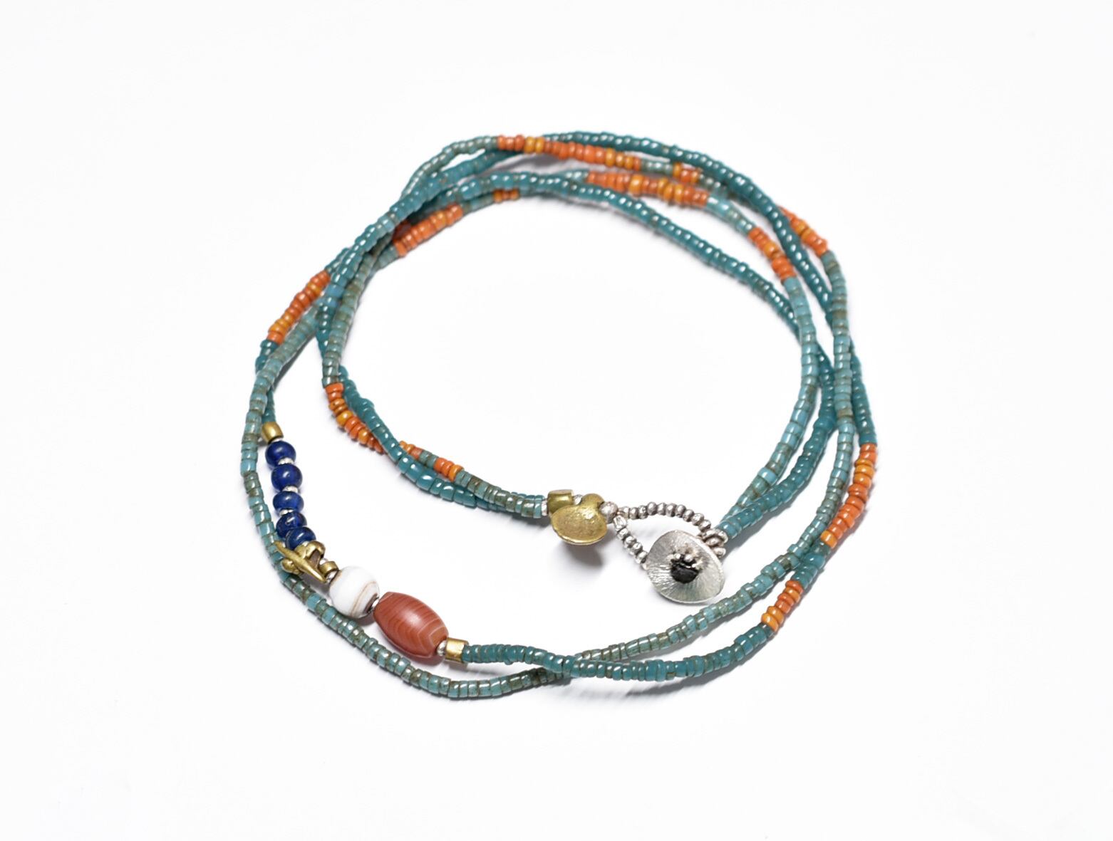 シャン族ヴィンテージカーネリアン&古代瑪瑙、ピーコックブルー&オレンジシードビーズ、アンティークブルービーズ、oldオリッサブラスなどを繋いだ華奢な2連ネックレスです。