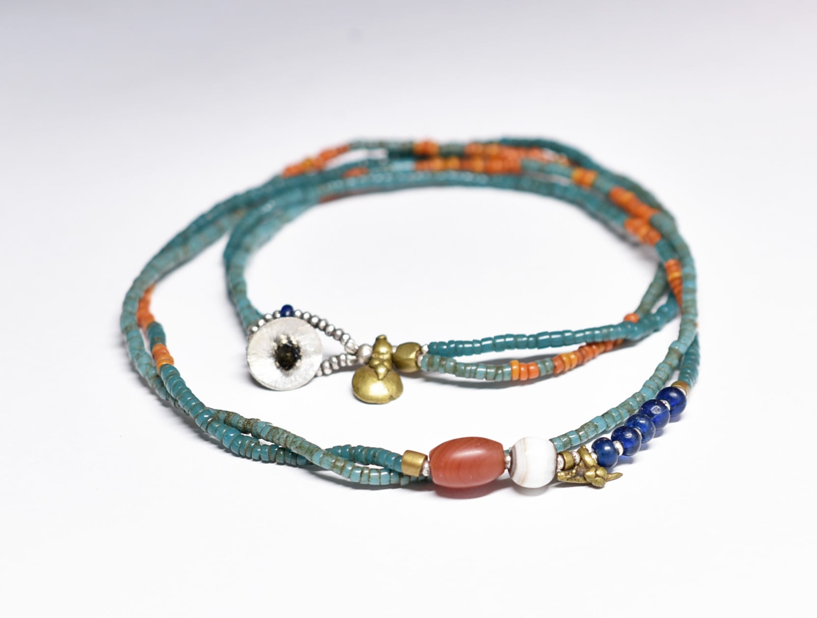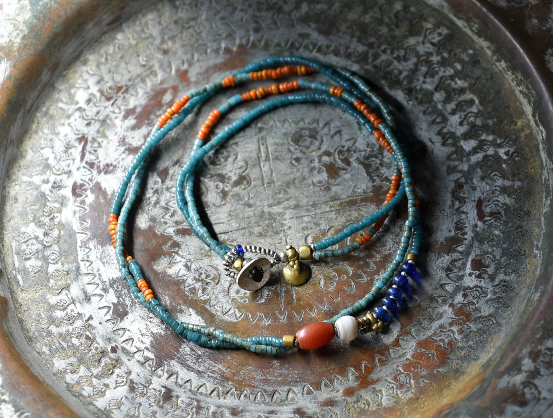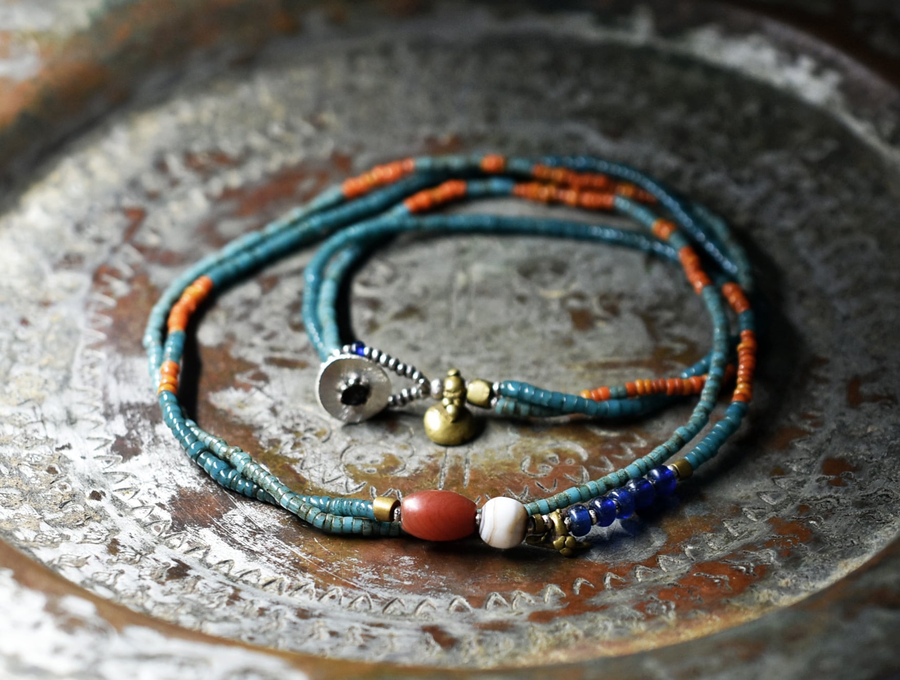 シャン族ヴィンテージカーネリアン&古代瑪瑙、ピーコックブルー&オレンジシードビーズ、アンティークブルービーズ、oldオリッサブラスの華奢な2連ネックレス