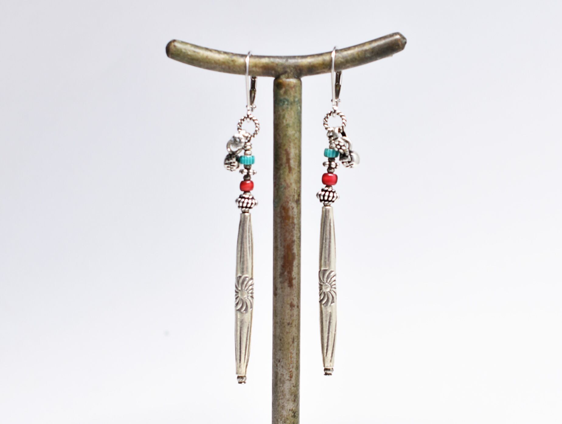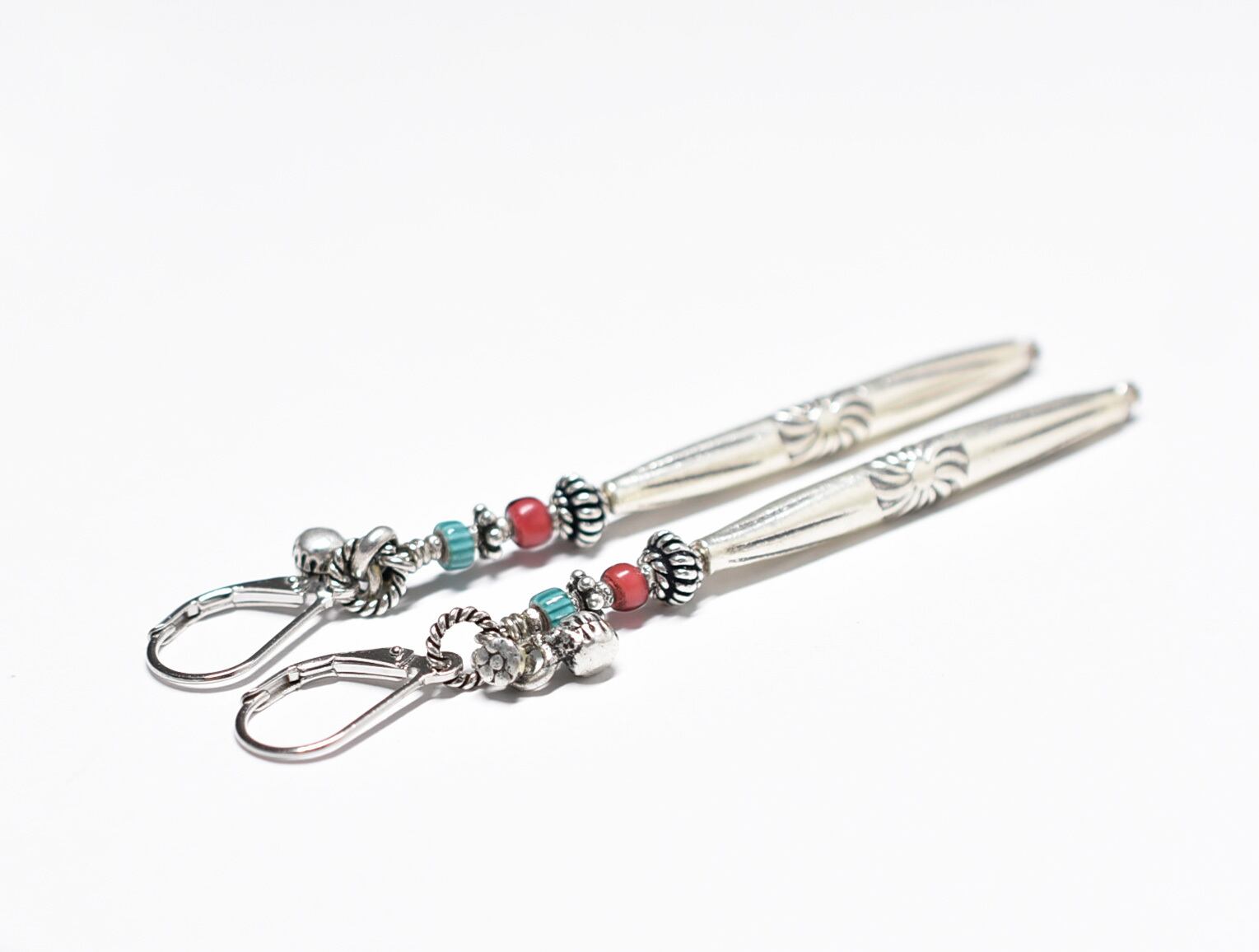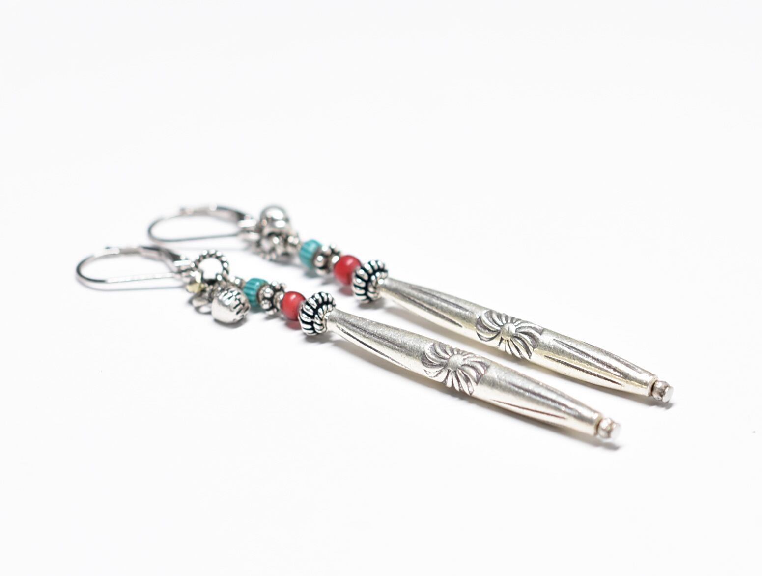 刻印入りロングカレンシルバーとハンドメイドシルバー、金赤ホワイトハーツ、ターコイズブルーシェブロン、インドシルバー鈴を繋いだちょっと長めなピアスです。