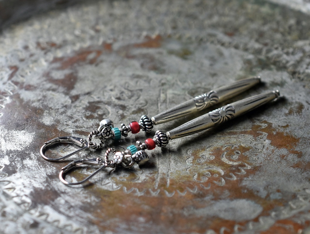刻印入りロングカレンシルバーとハンドメイドシルバー、金赤ホワイトハーツ、ターコイズブルーシェブロン、インドシルバー鈴のちょっと長めなピアス