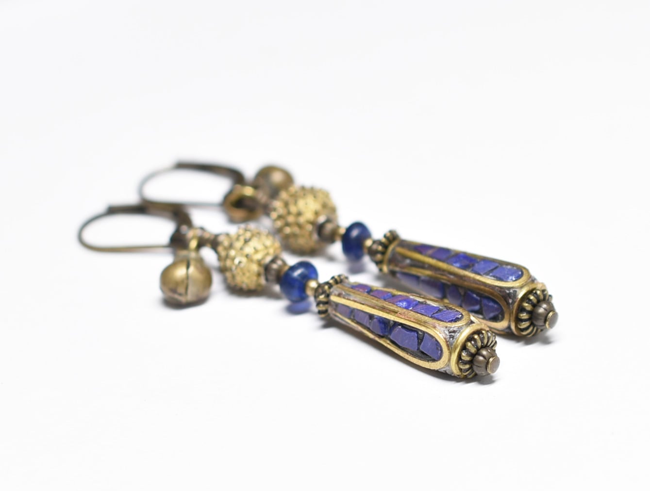 ラピス象嵌チベットビーズとブルーアンティークビーズ、つぶつぶブラス、民族鈴を繋いだピアスです。