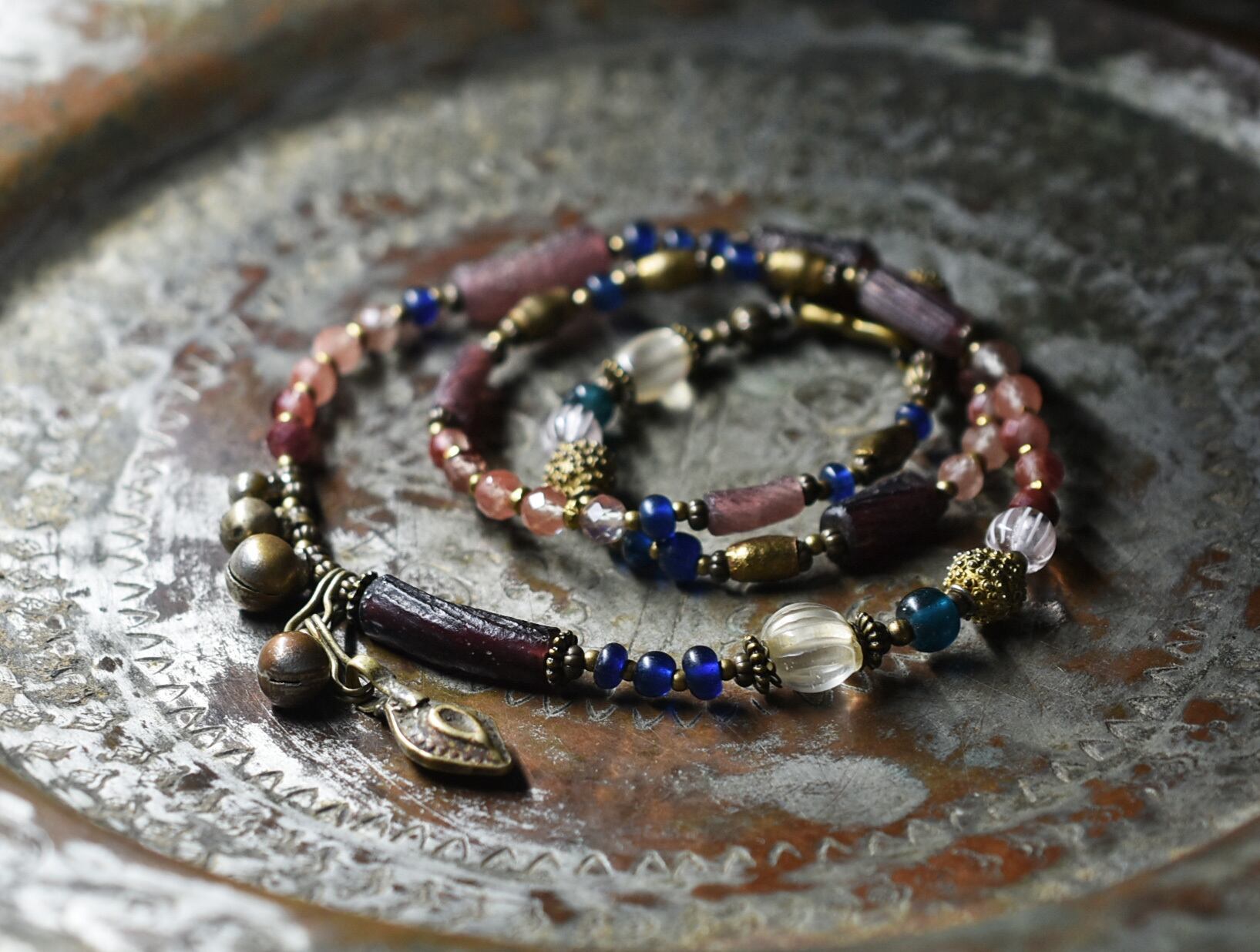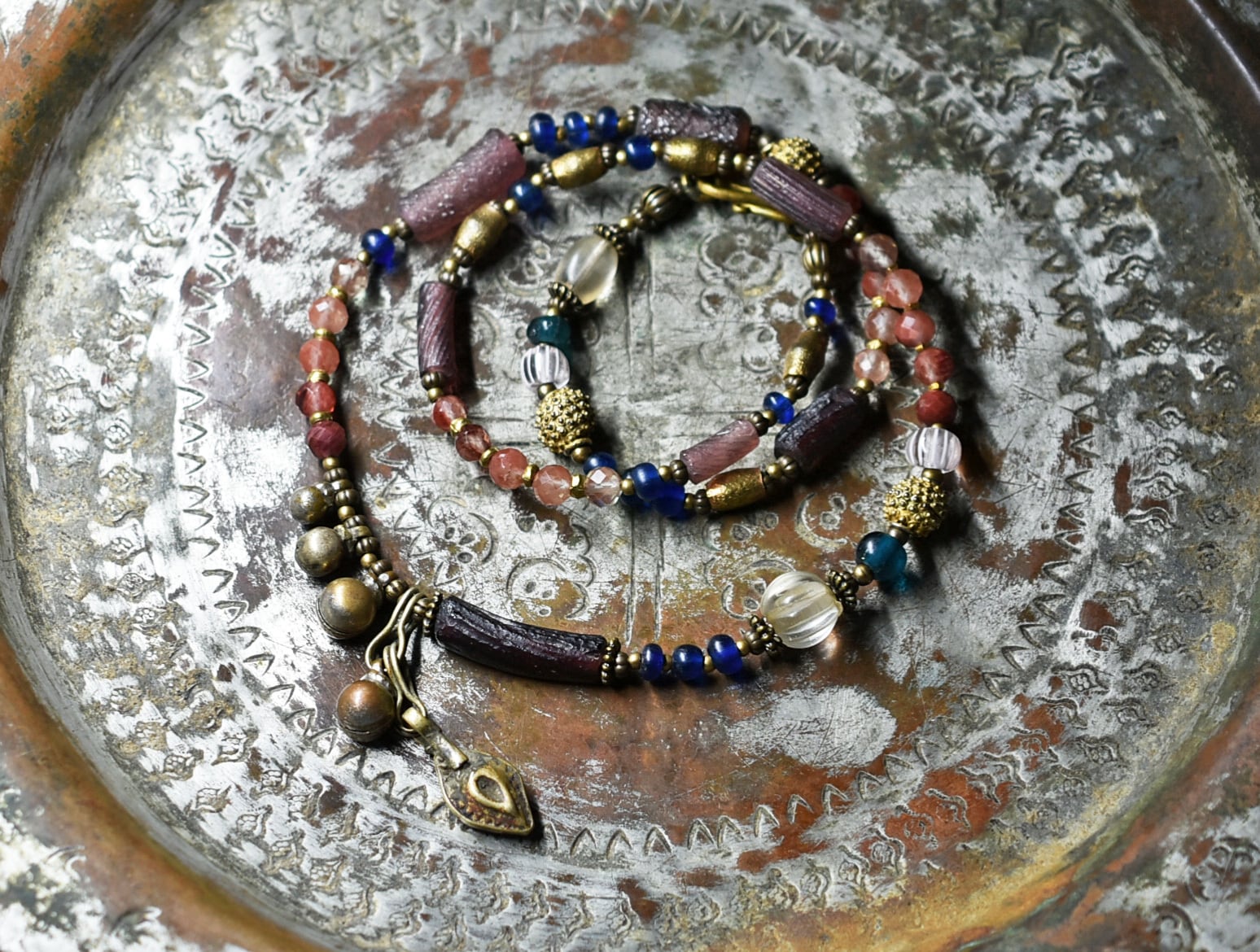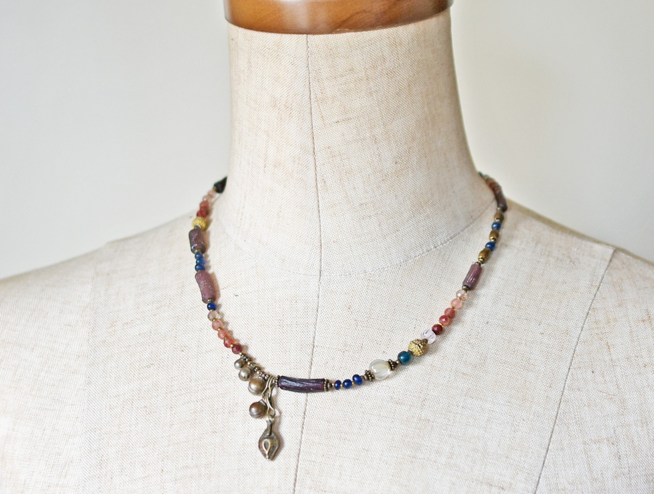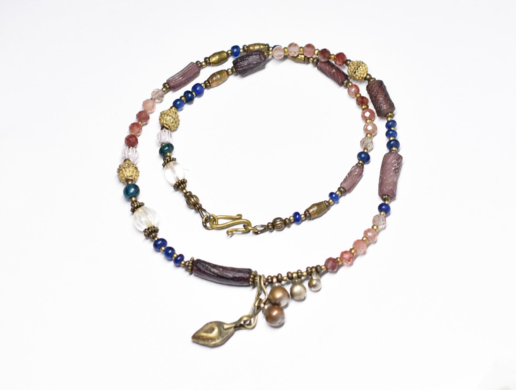 アフガンパーツ&民族鈴、ローマングラスとボヘミアビーズ、グーズベリー、アンデシン、多彩ブラス、ブルー&インディゴブルービーズなどを繋いだネックレスです。
