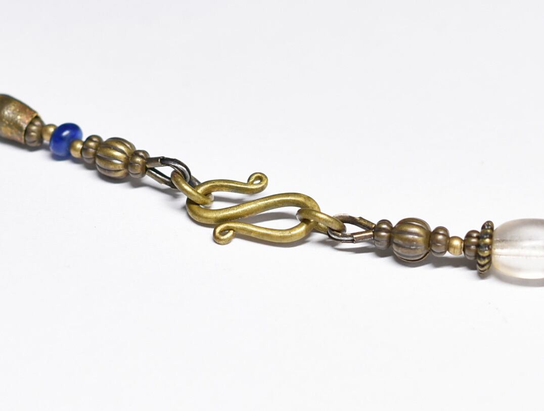 楕円型のビーズはアフリカから届いたブラスビーズです。その他にも古いネックレスに使われていたメタルパーツを散りばめました。