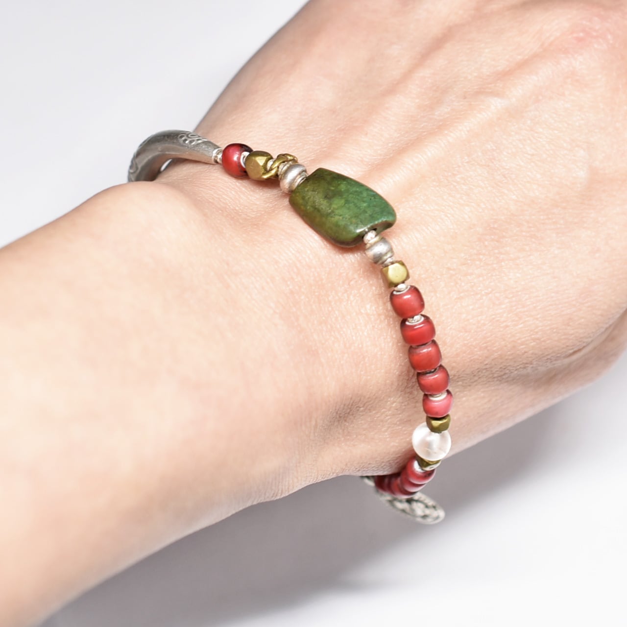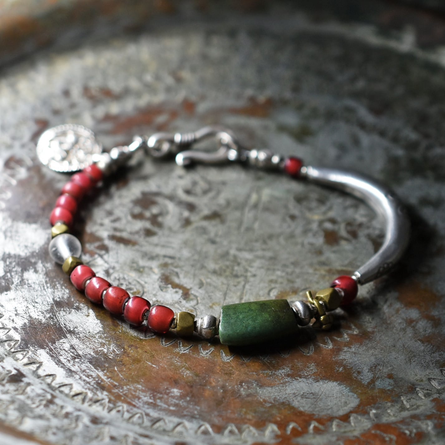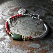 oldチベタンターコイズと金赤ホワイトハーツ、古代水晶、oldインドシルバーチャーム、oldチンシルバー&オリッサブラス、湾曲カレンシルバーをブレス