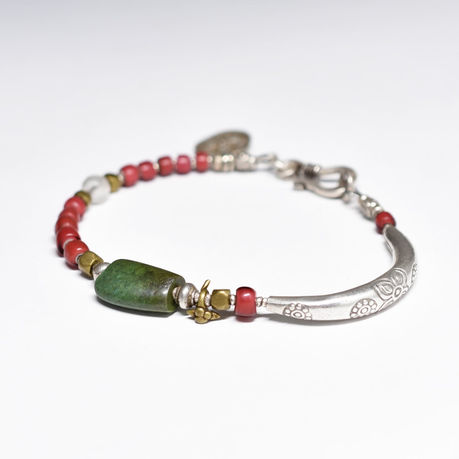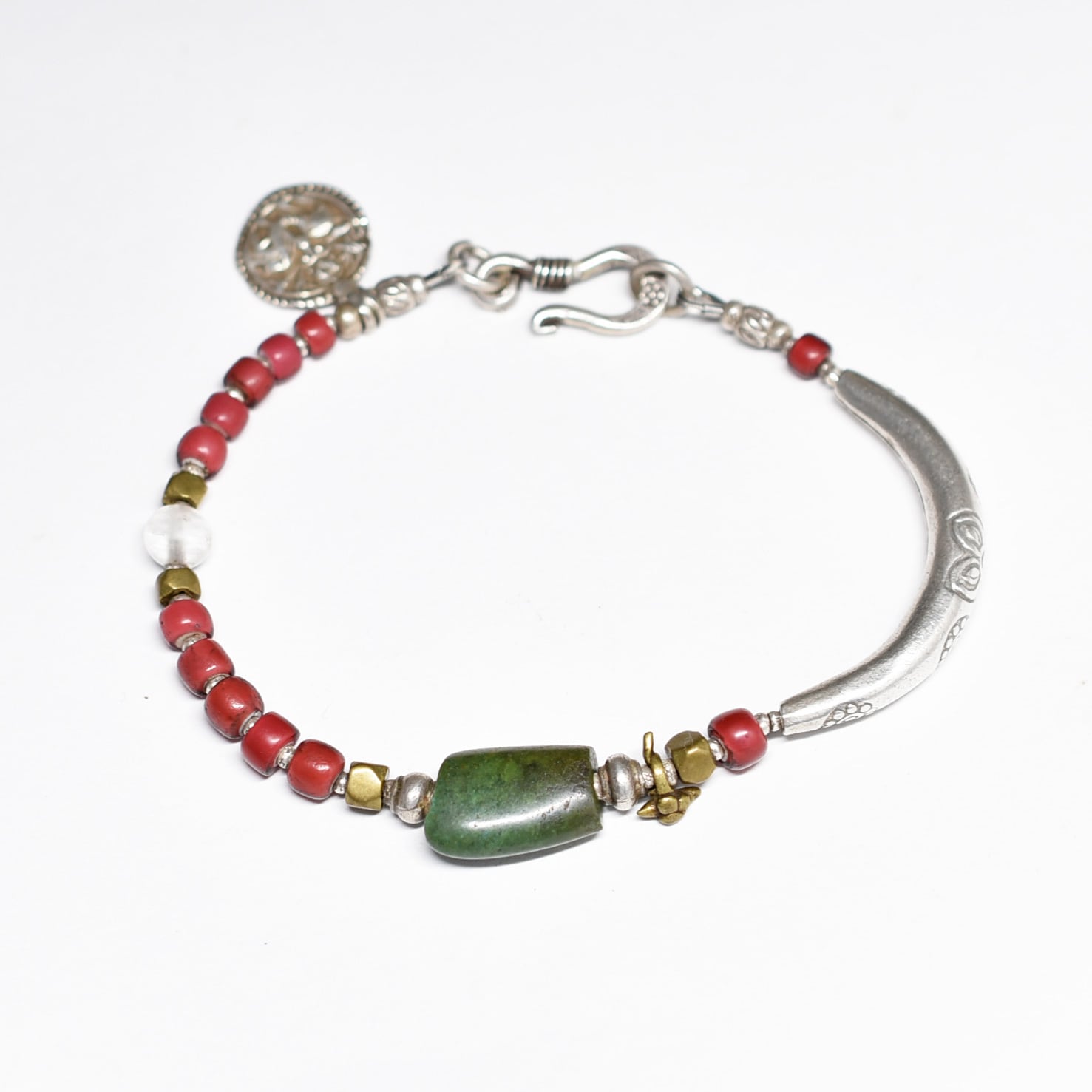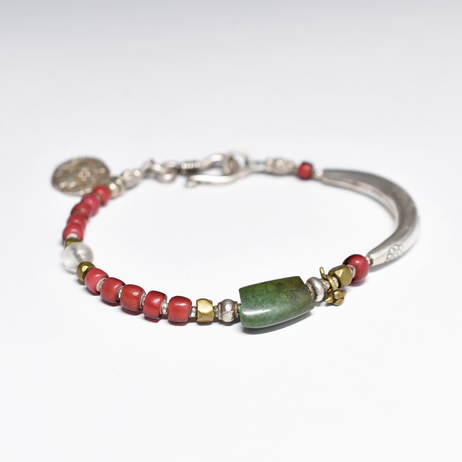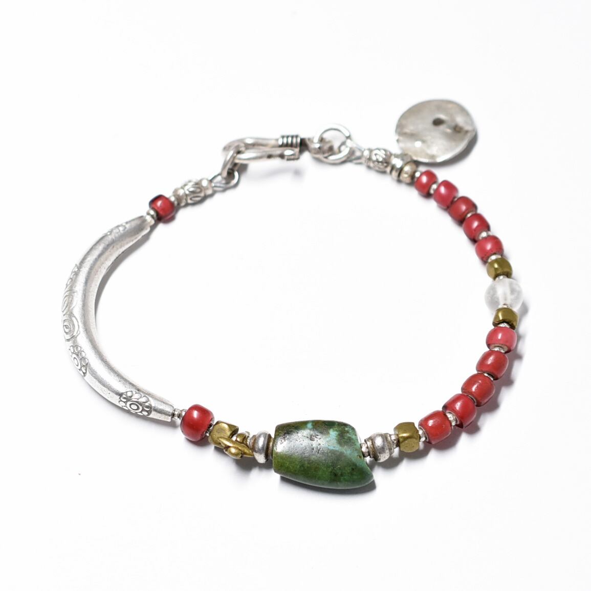 oldチベタンターコイズと金赤ホワイトハーツ、古代水晶、oldインドシルバーチャーム、oldチンシルバー&オリッサブラス、湾曲カレンシルバーのブレス