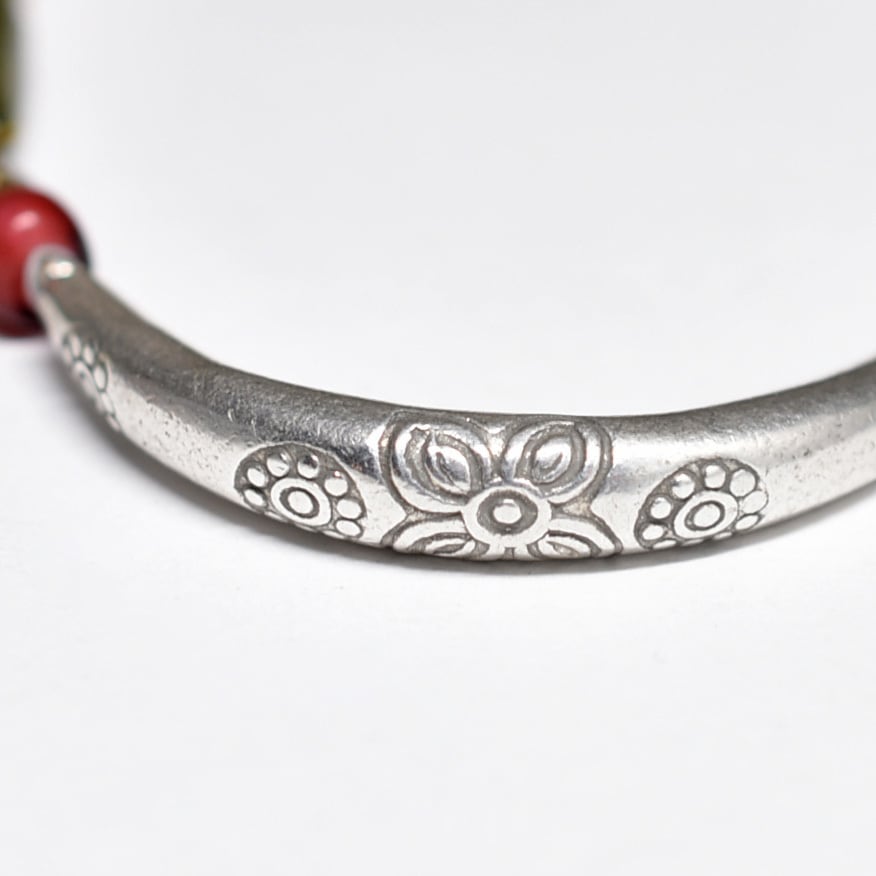 oldチベタンターコイズを挟んでいる壺型のシルバービーズは、oldチンシルバーです。18~19世紀頃の伝世品です。こちらはビルマから届いたものです。