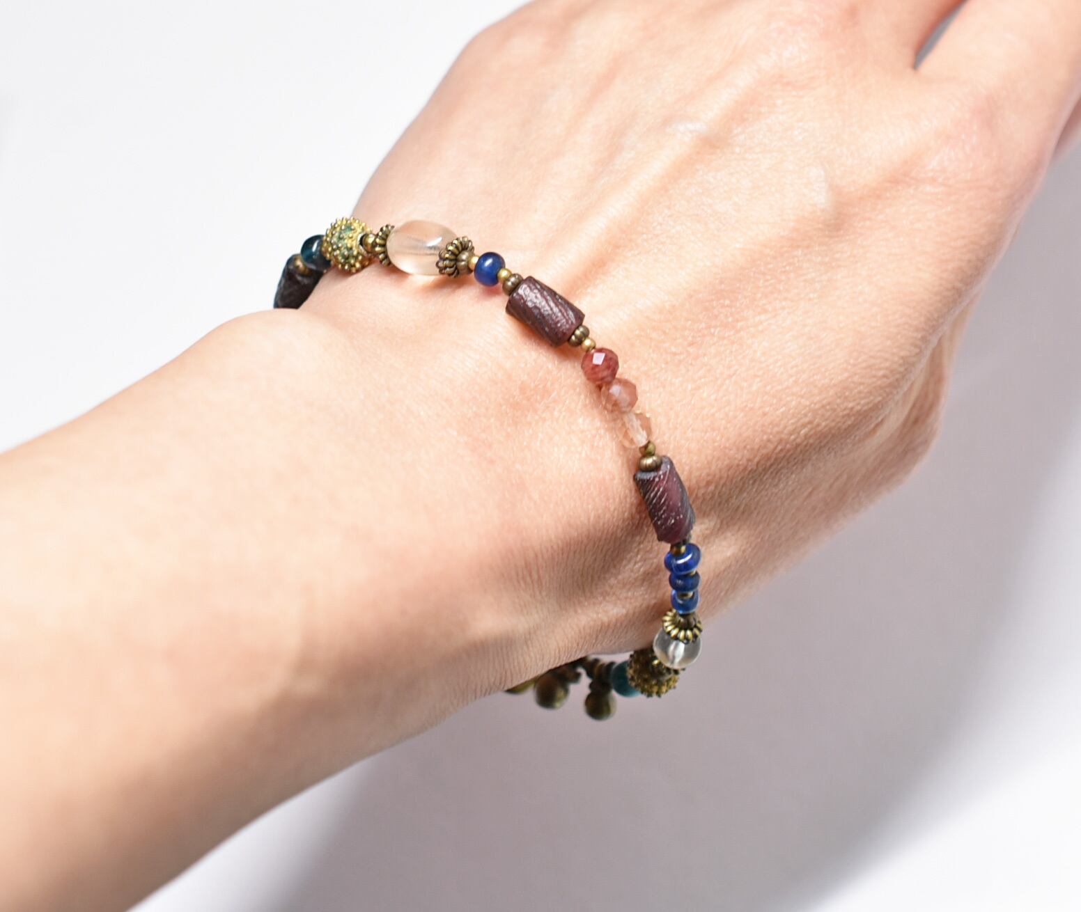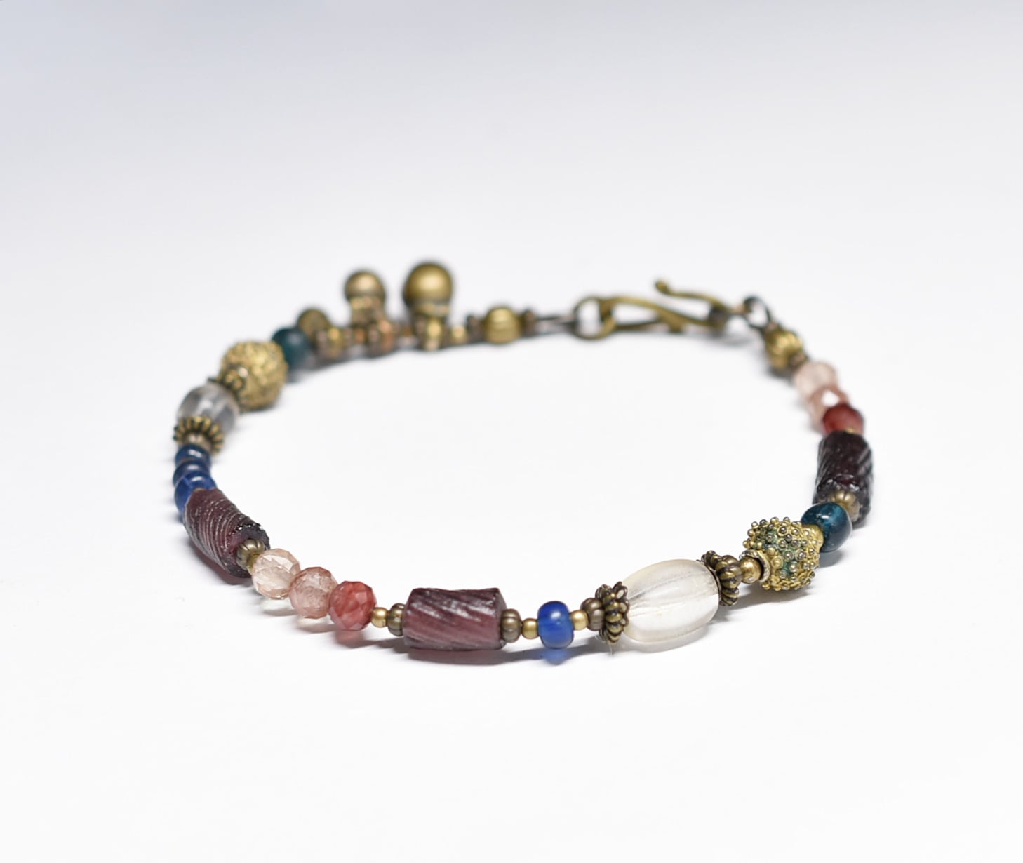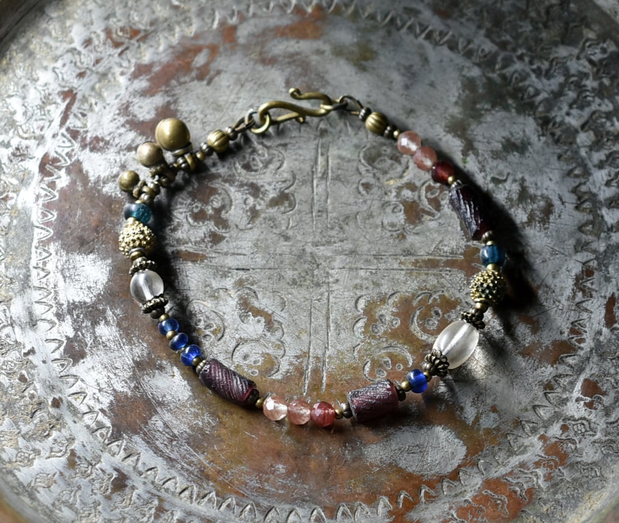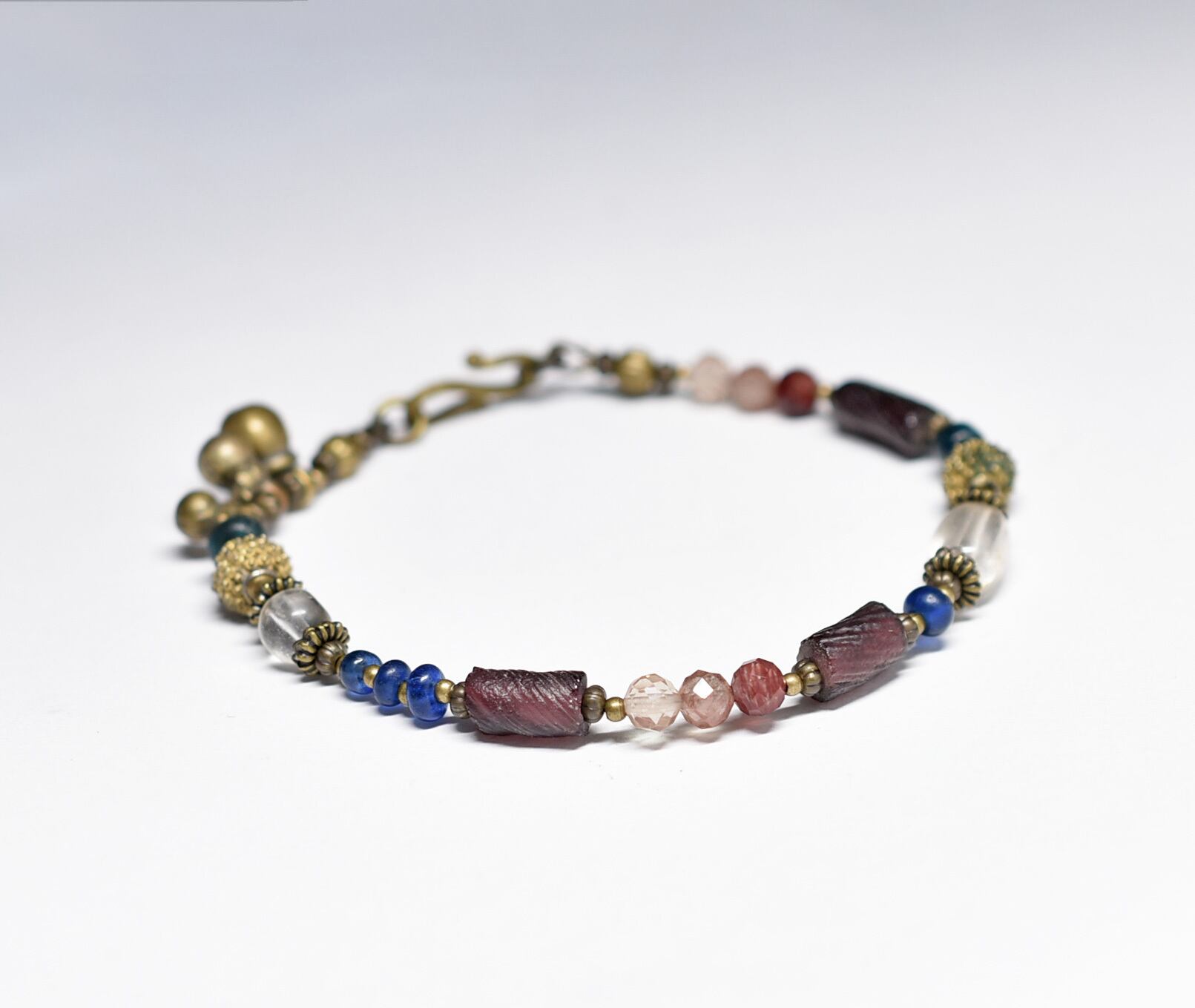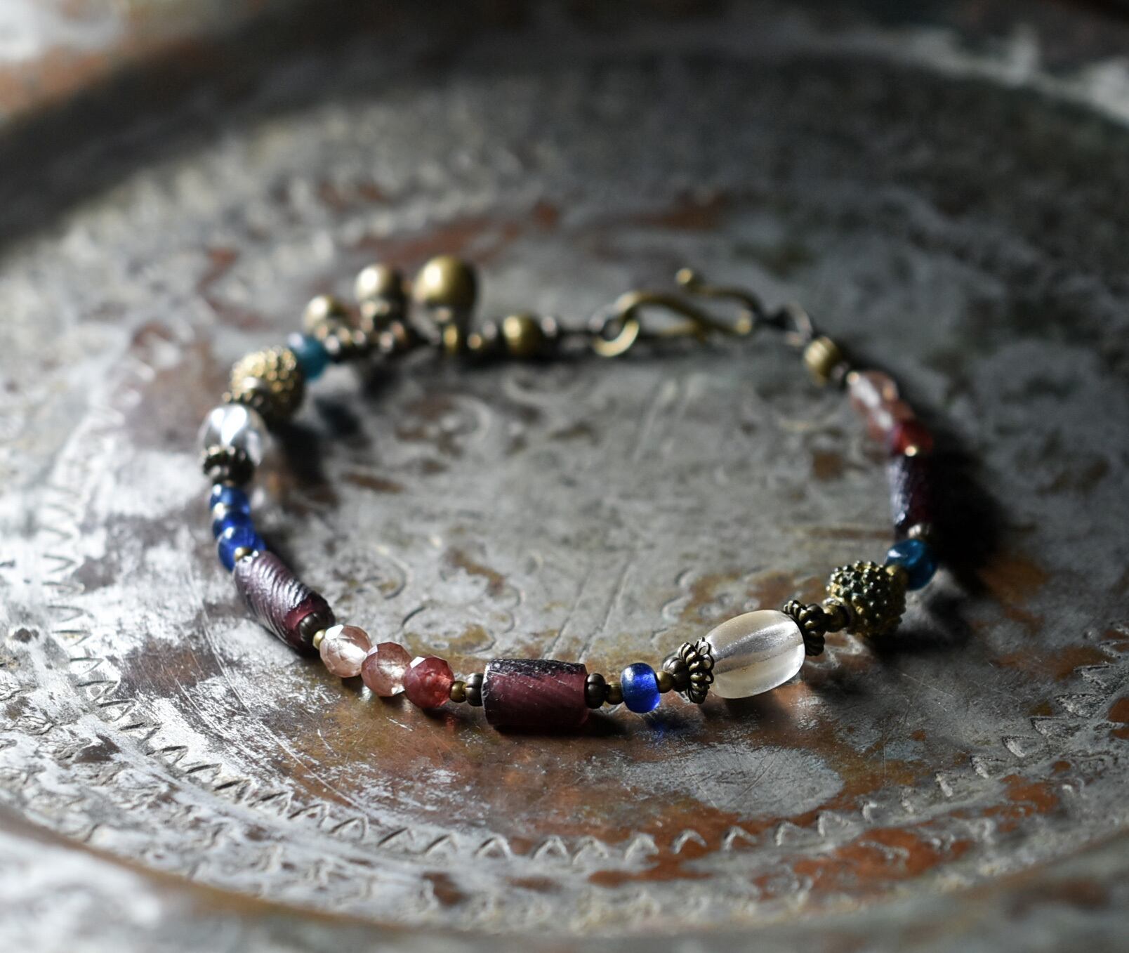アンティークボヘミアビーズ、ローマングラスとアンティークブルー&インディゴブルービーズ、アンデシン、ブラスビーズ、民族鈴を繋いだブレスです。