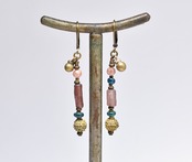 パープルローマングラスとインディゴブルービーズ、アンデシン、つぶつぶブラス、民族鈴を繋いだピアスです。