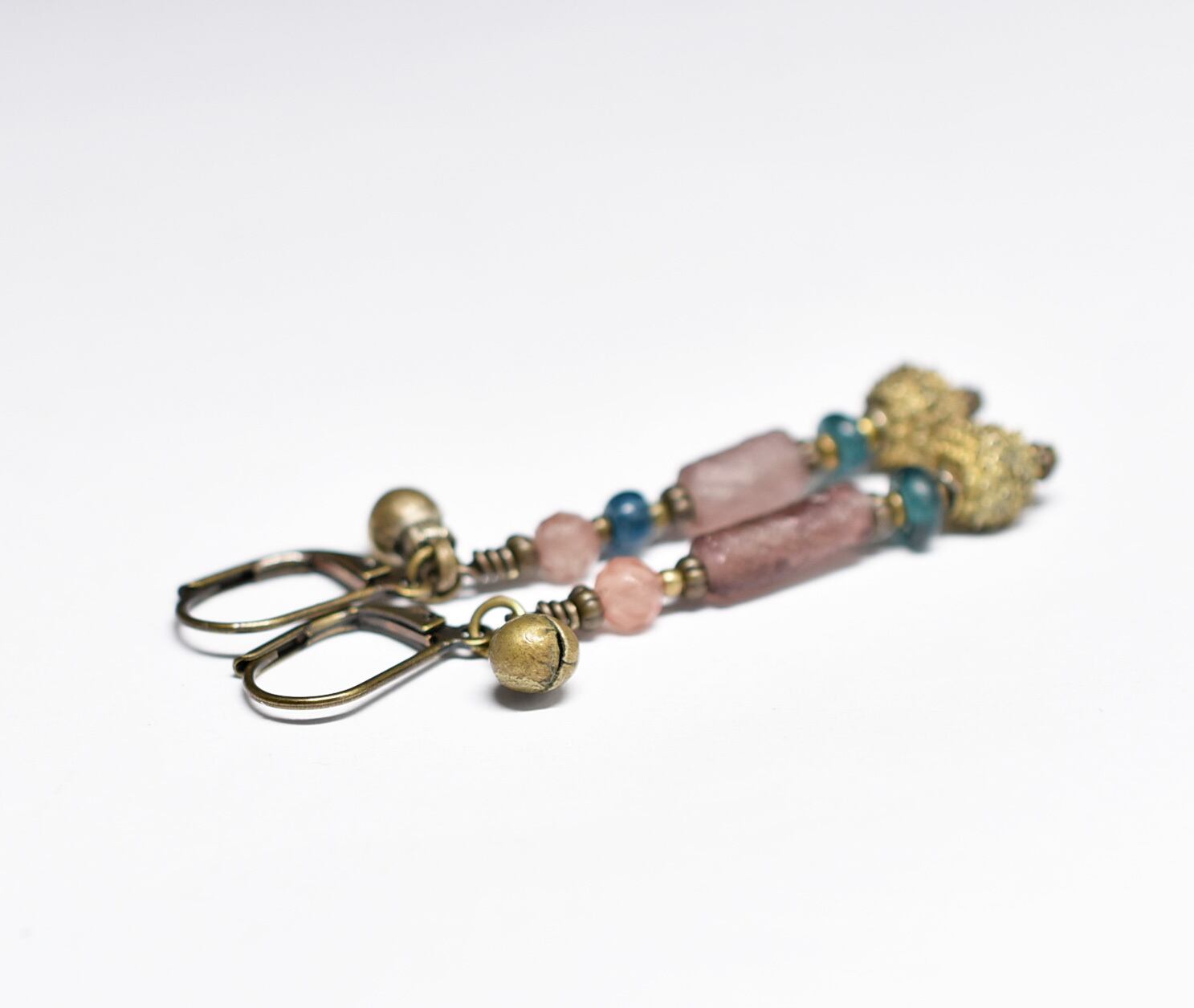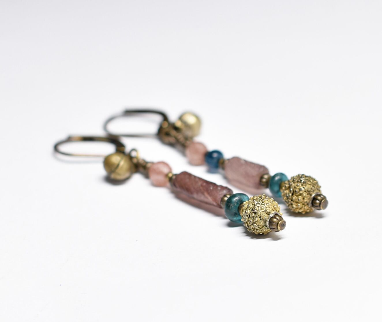 パープルローマングラスとインディゴブルービーズ、アンデシン、つぶつぶブラス、民族鈴のピアス