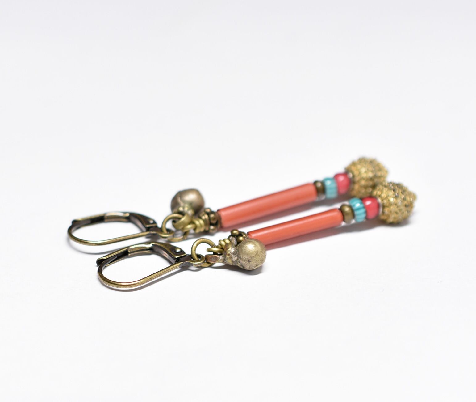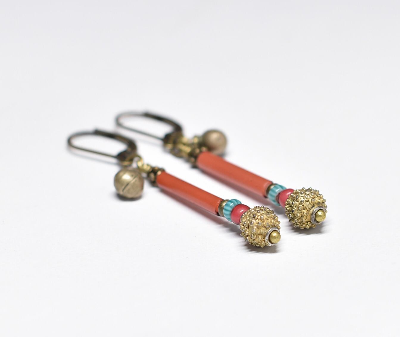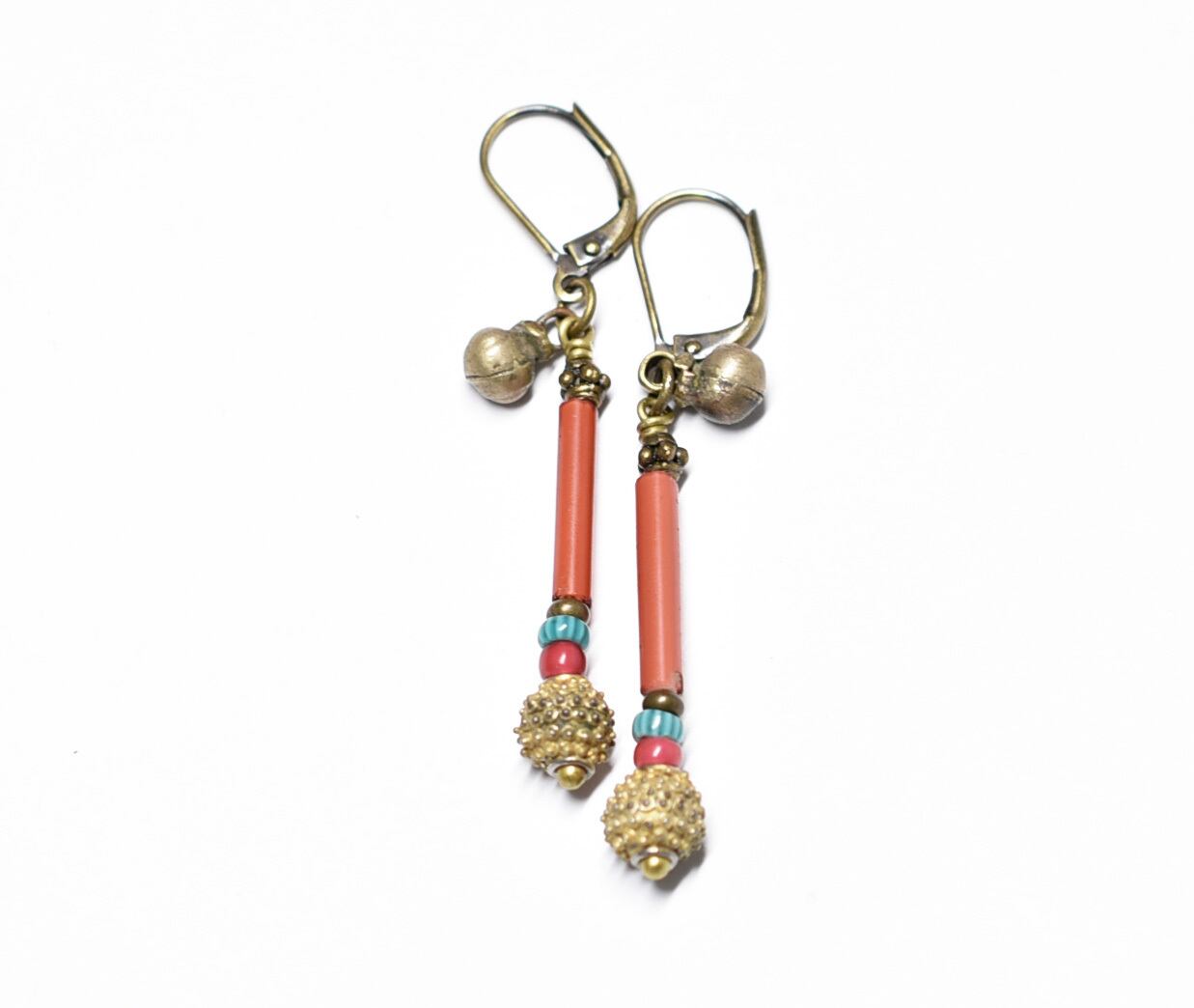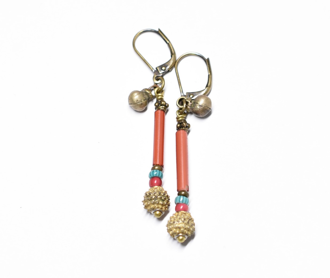 筒型&お饅頭型金赤ホワイトハーツとターコイズブルーシェブロン、つぶつぶブラス、民族鈴のピアス