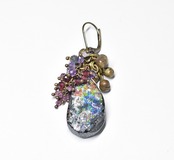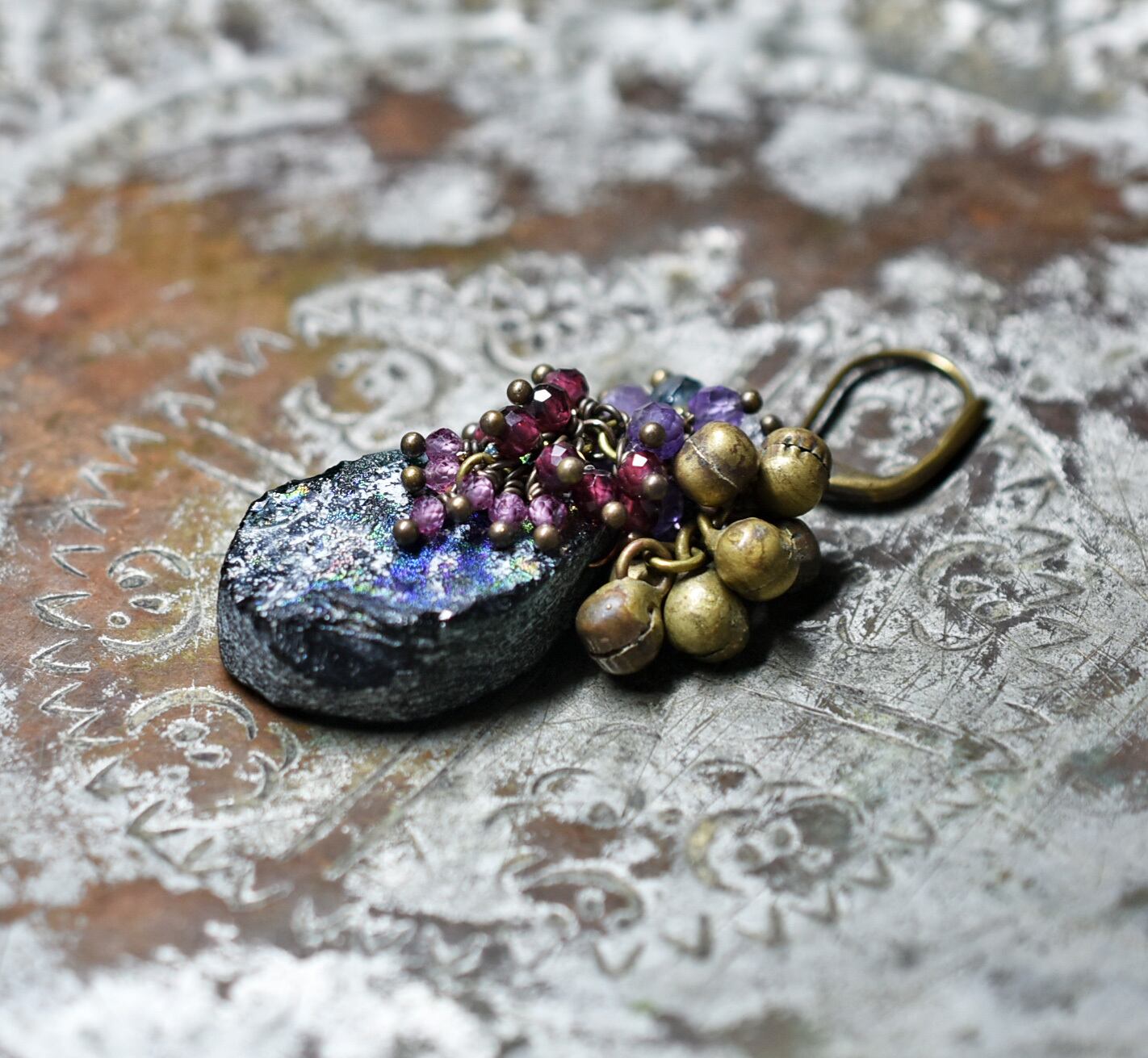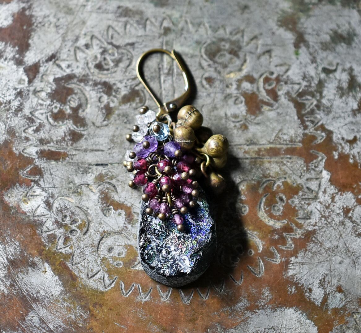 ブルーグリーン銀化のローマングラスとアメジスト、たわわなストーンビーズ&民族鈴の片耳ピアス
