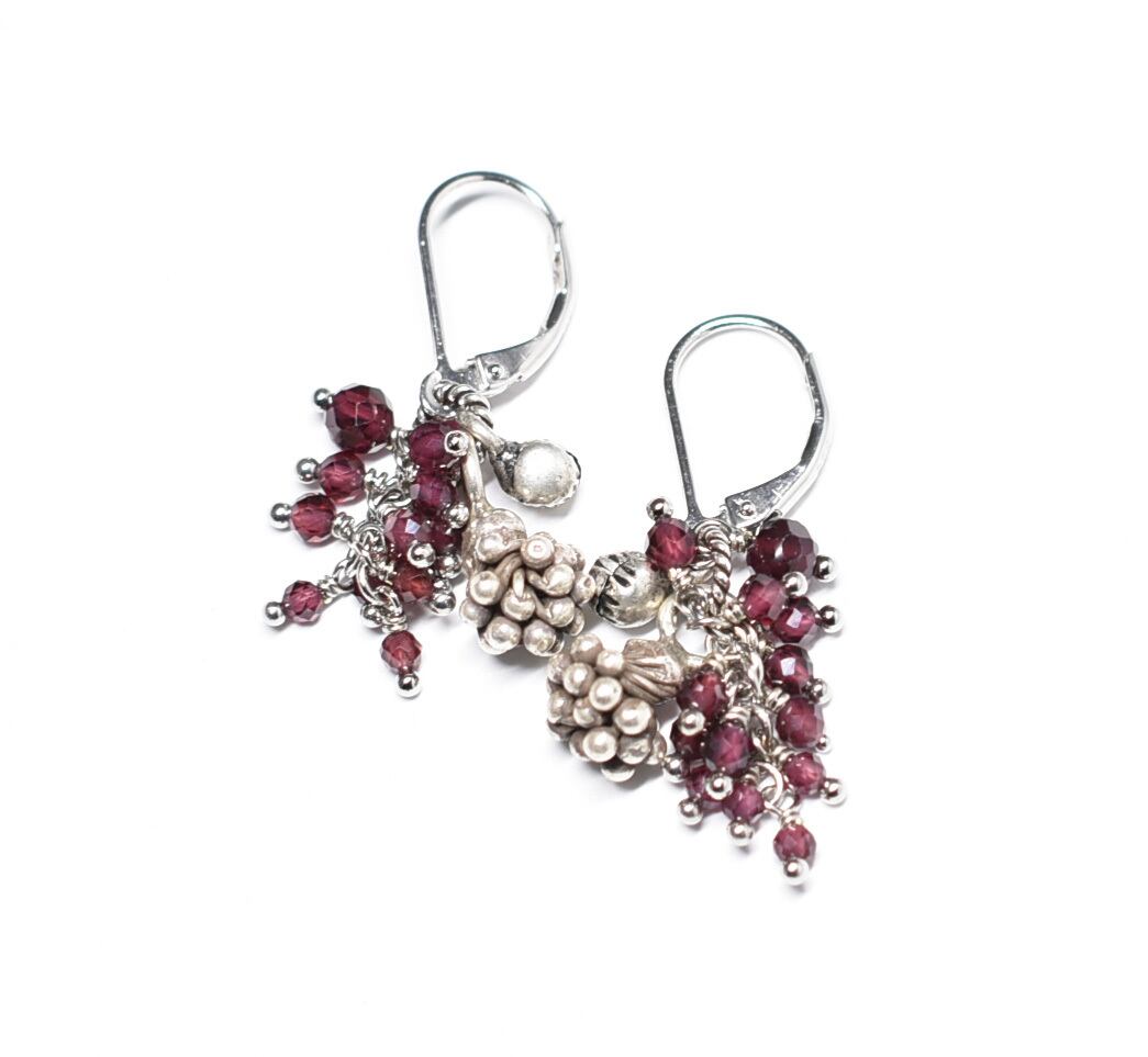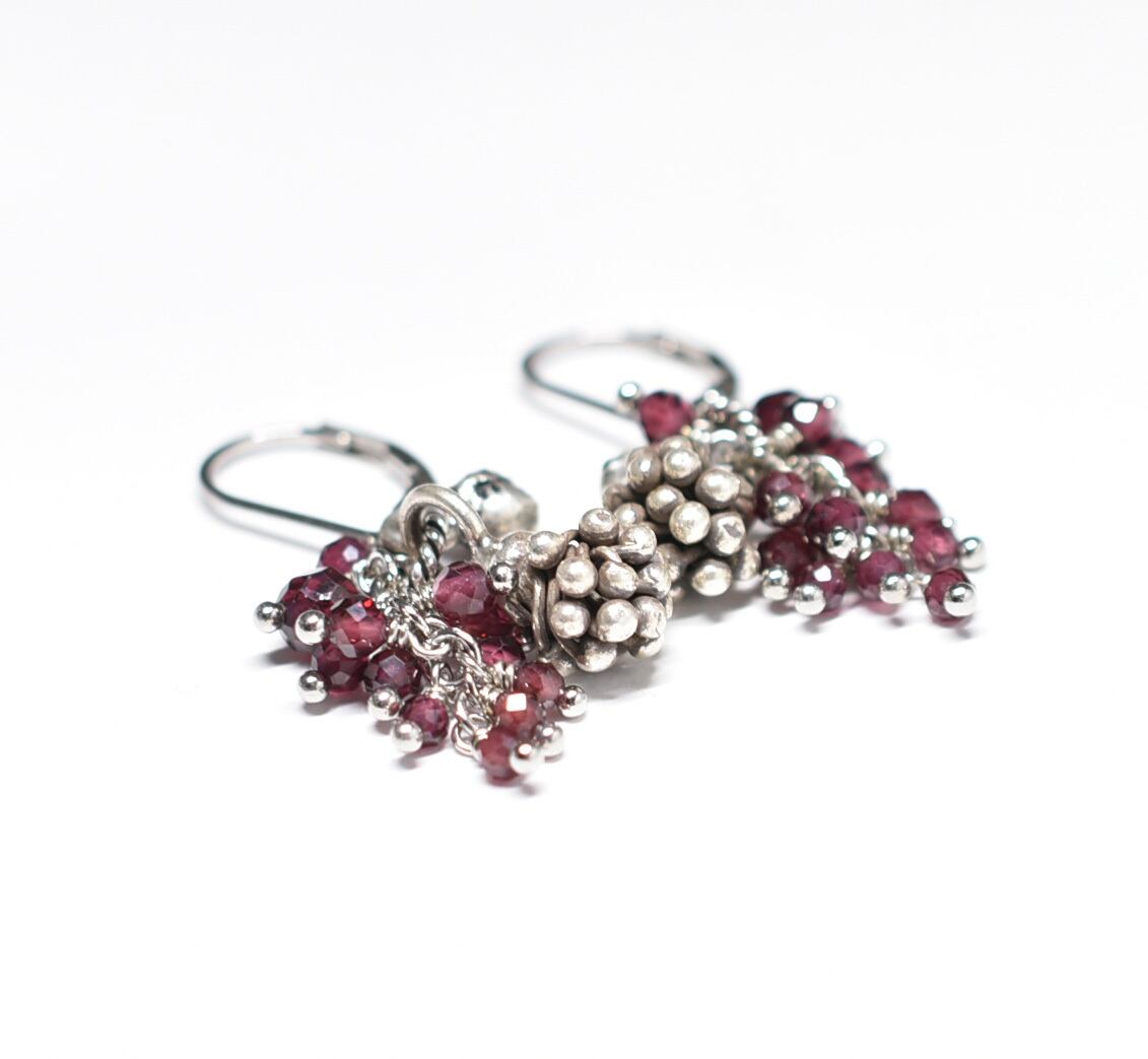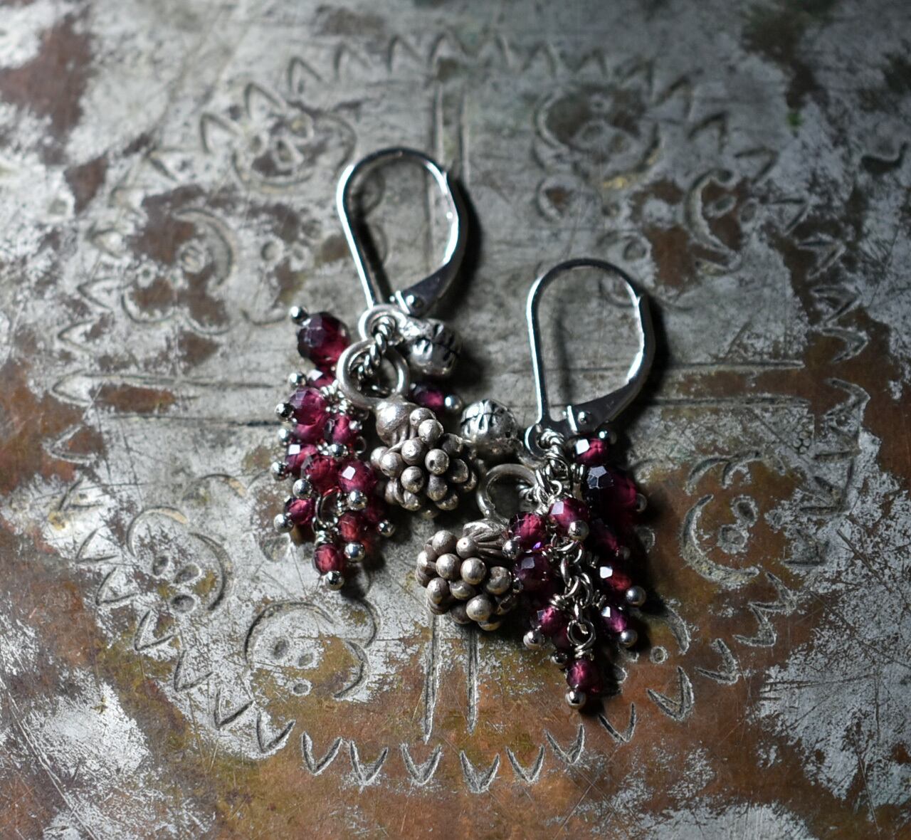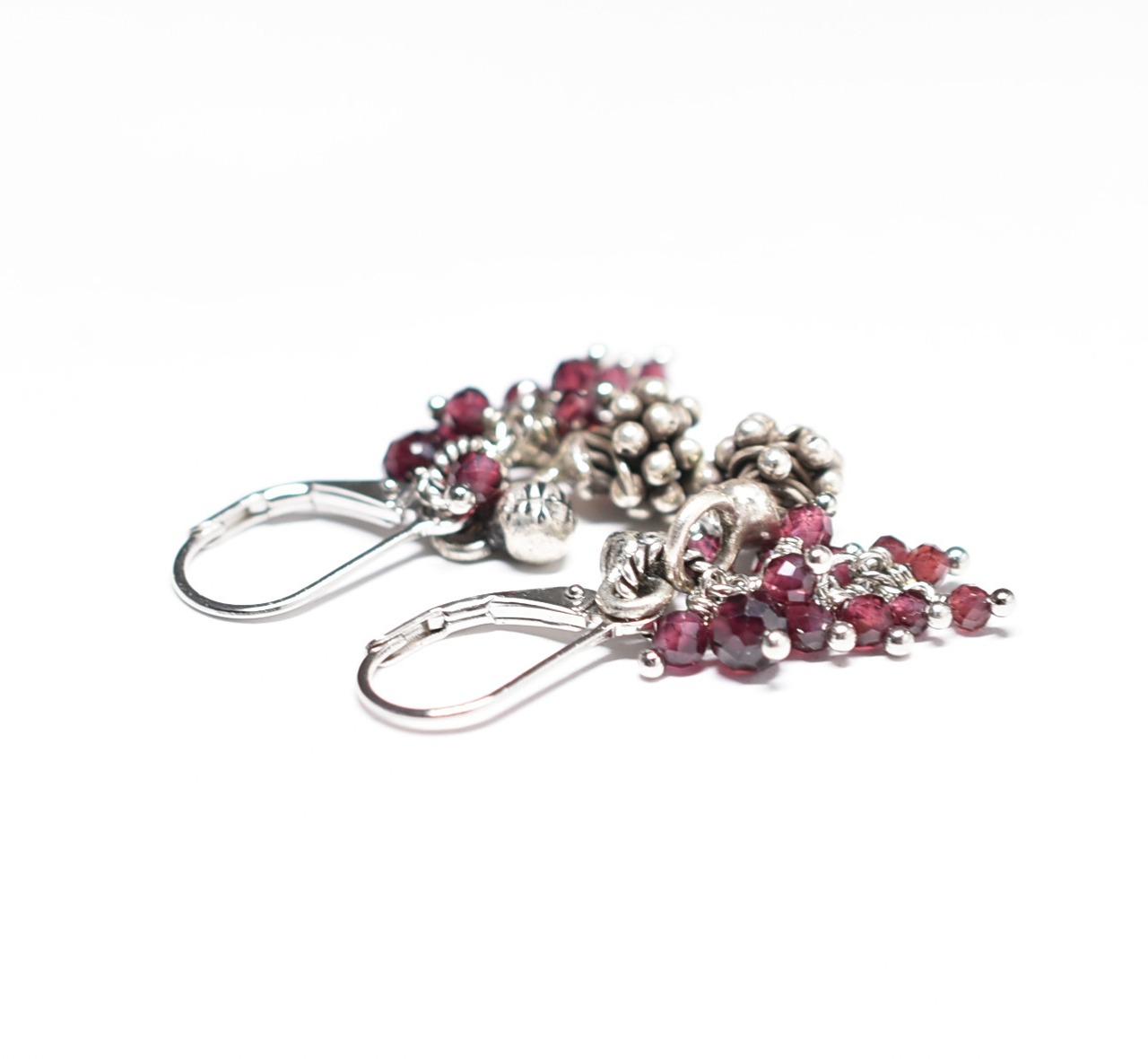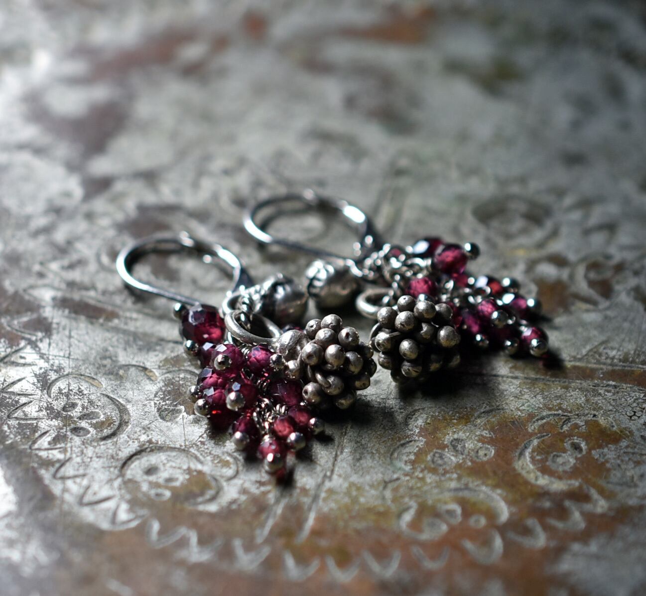 蕾カレンシルバーとたわわなガーネット、インドシルバー鈴のピアス