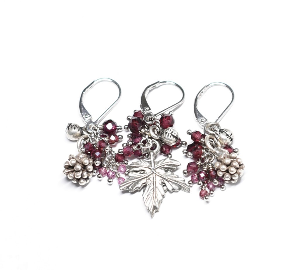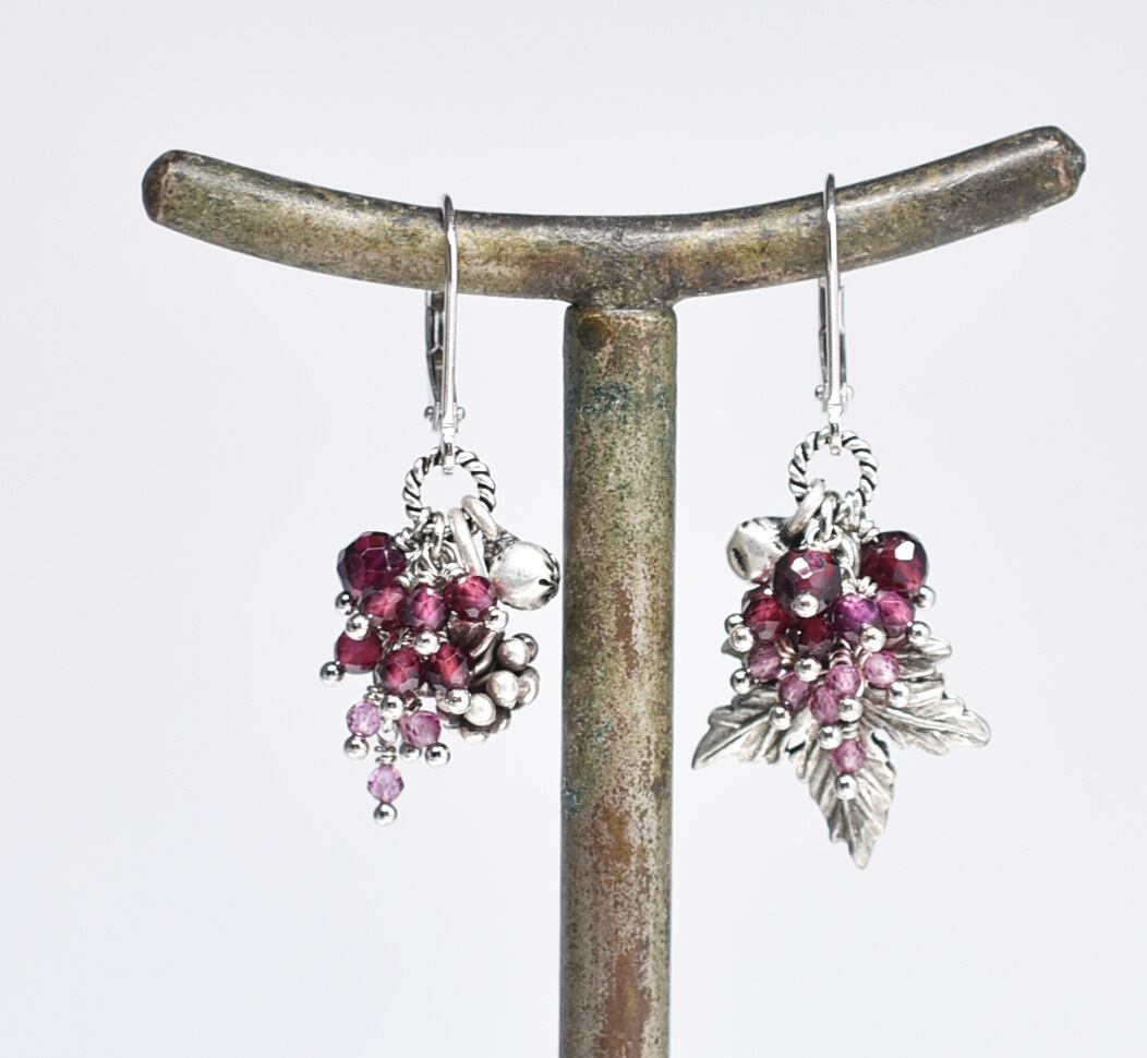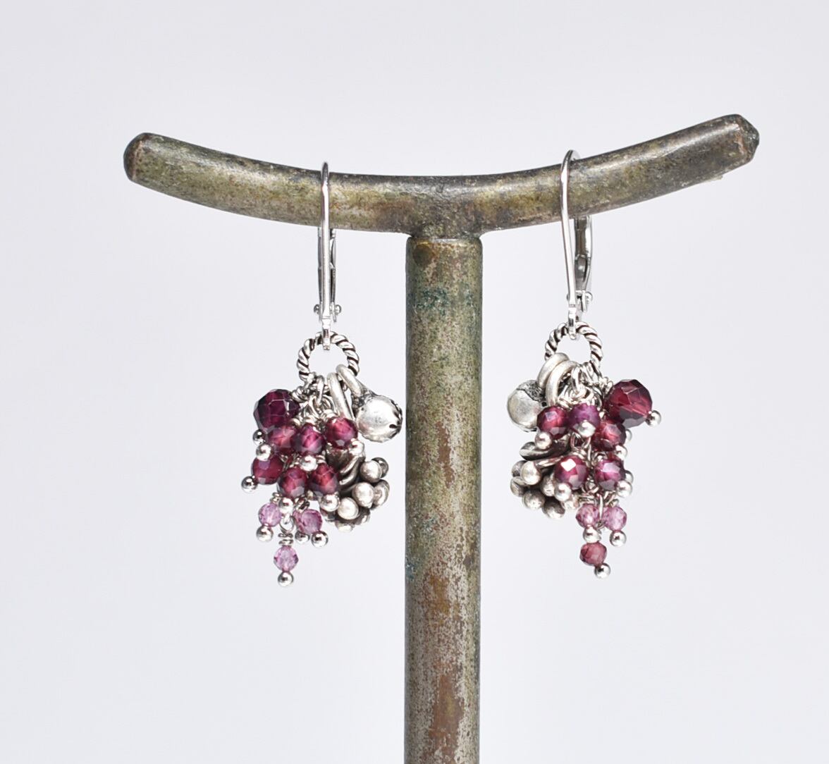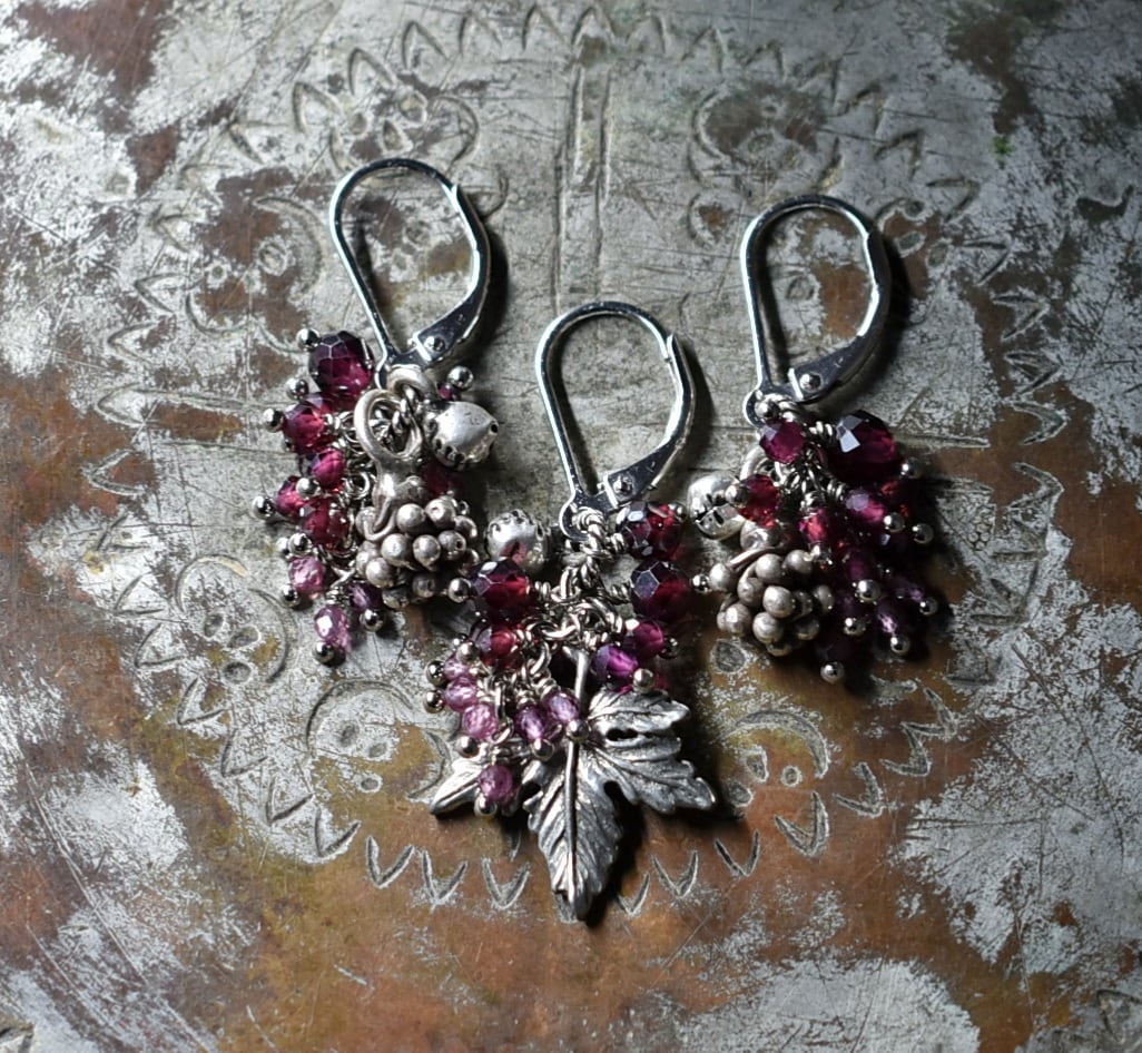 蕾カレンシルバー&リーフ型ヴィンテージピュータとたわわなガーネット、インドシルバー鈴の3点ピアス