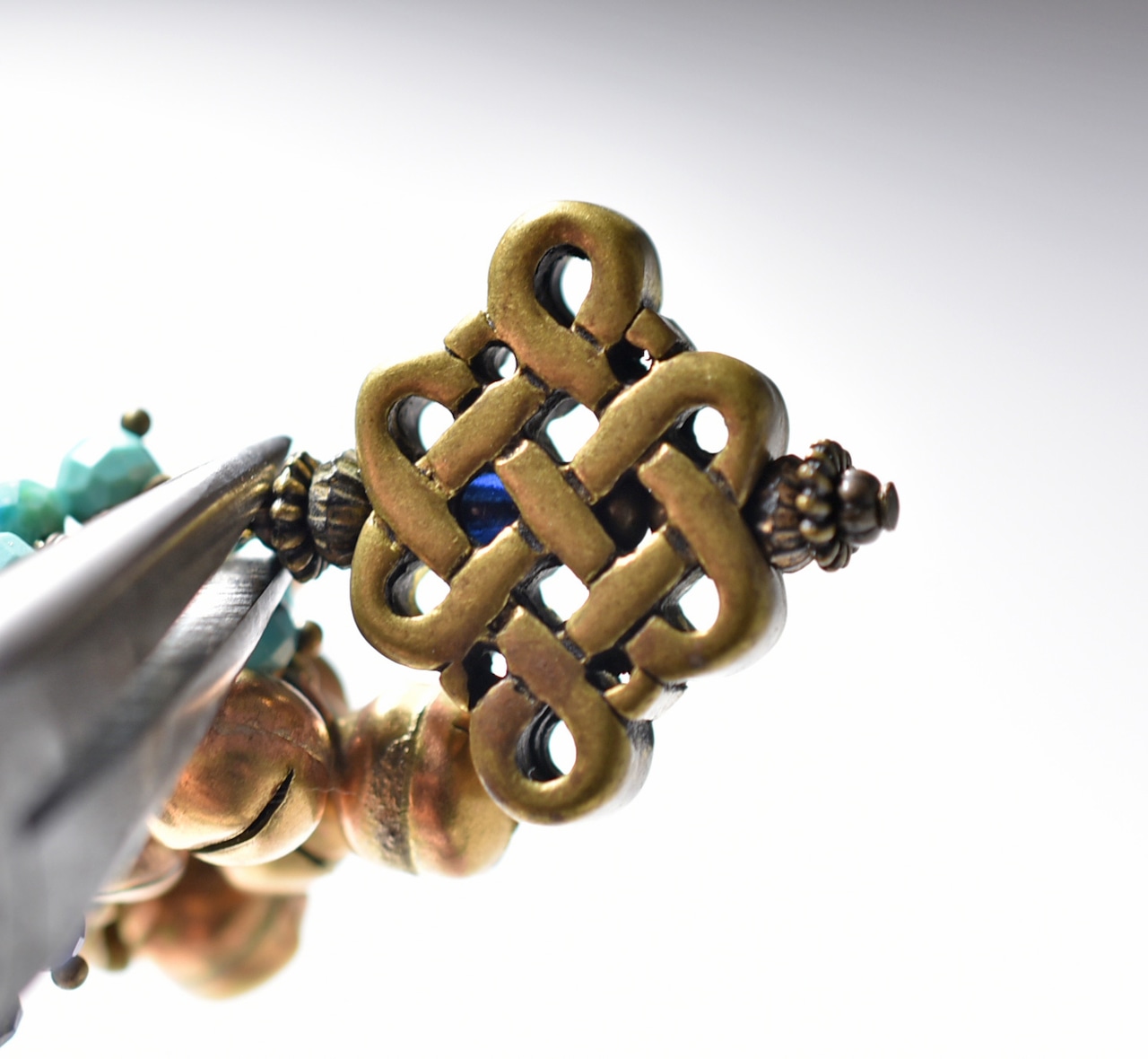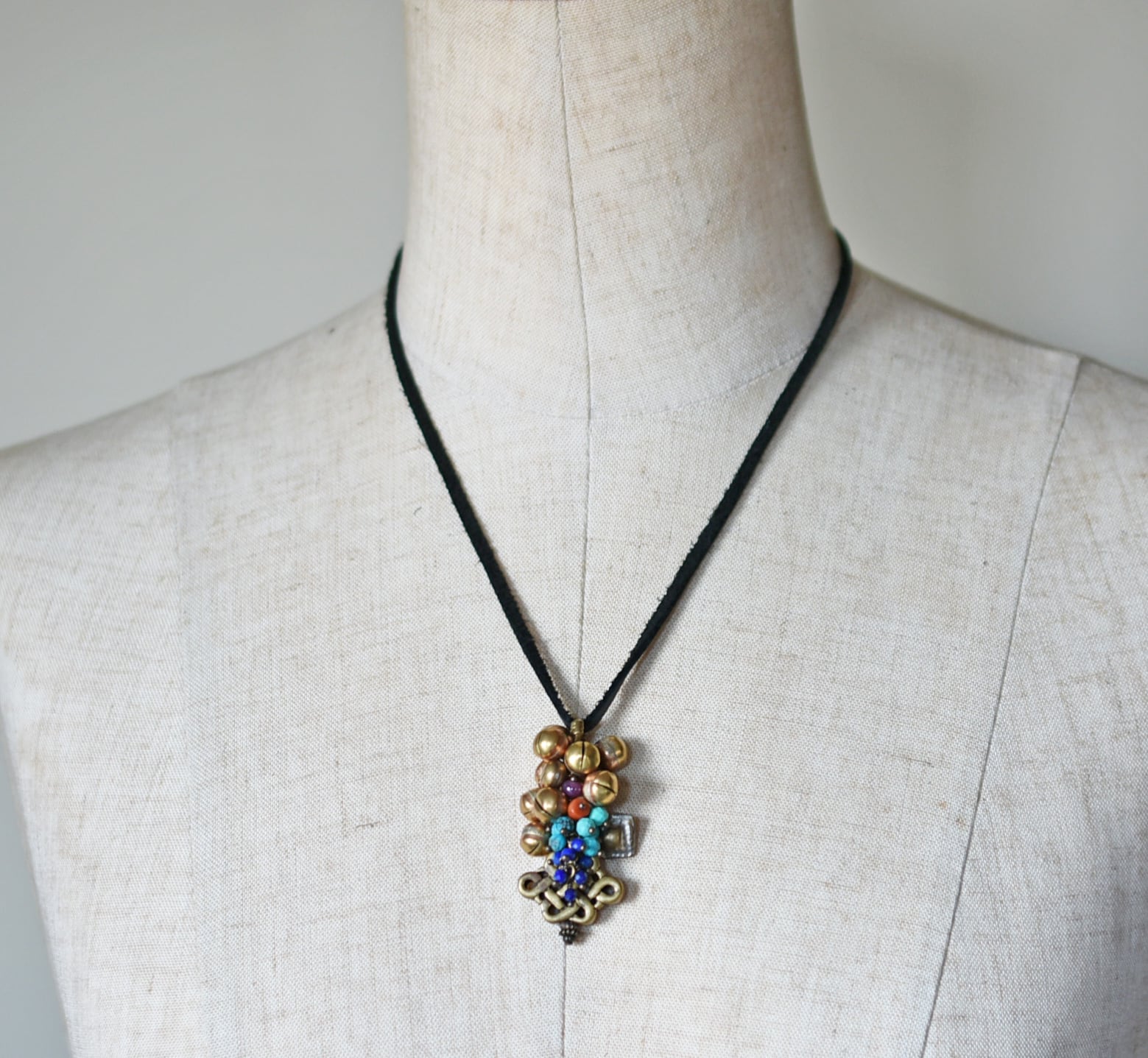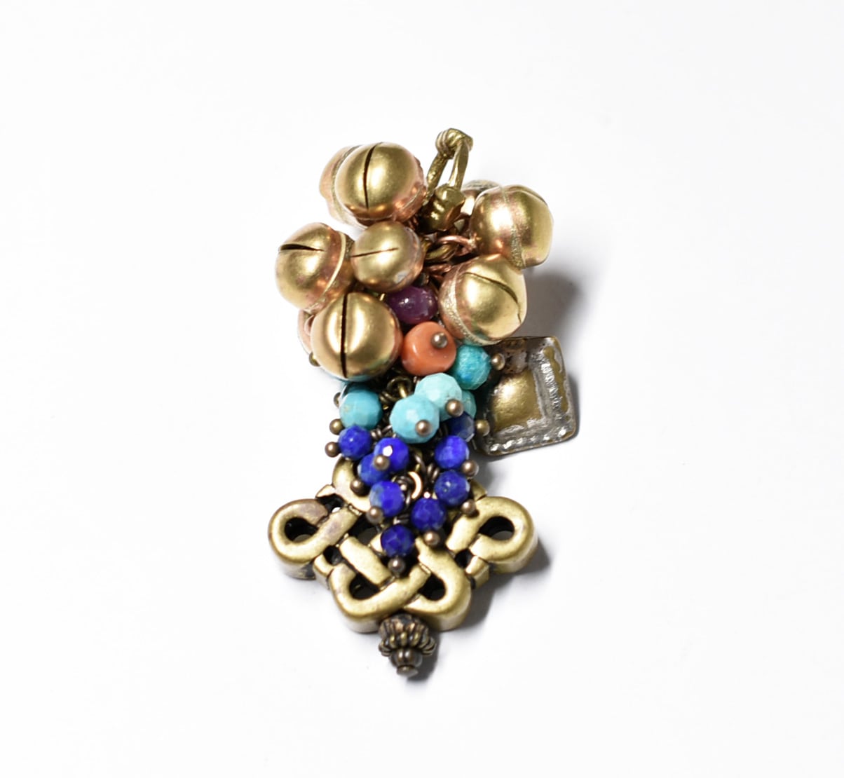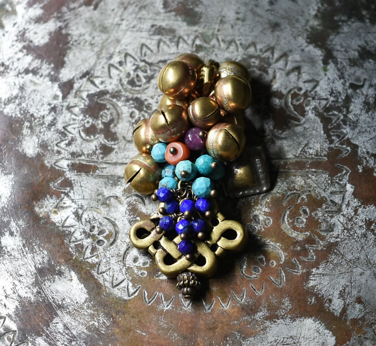 エンドレスノットとたわわな鈴とストーンビーズ、アフガンパーツを繋いだペンダントトップです。