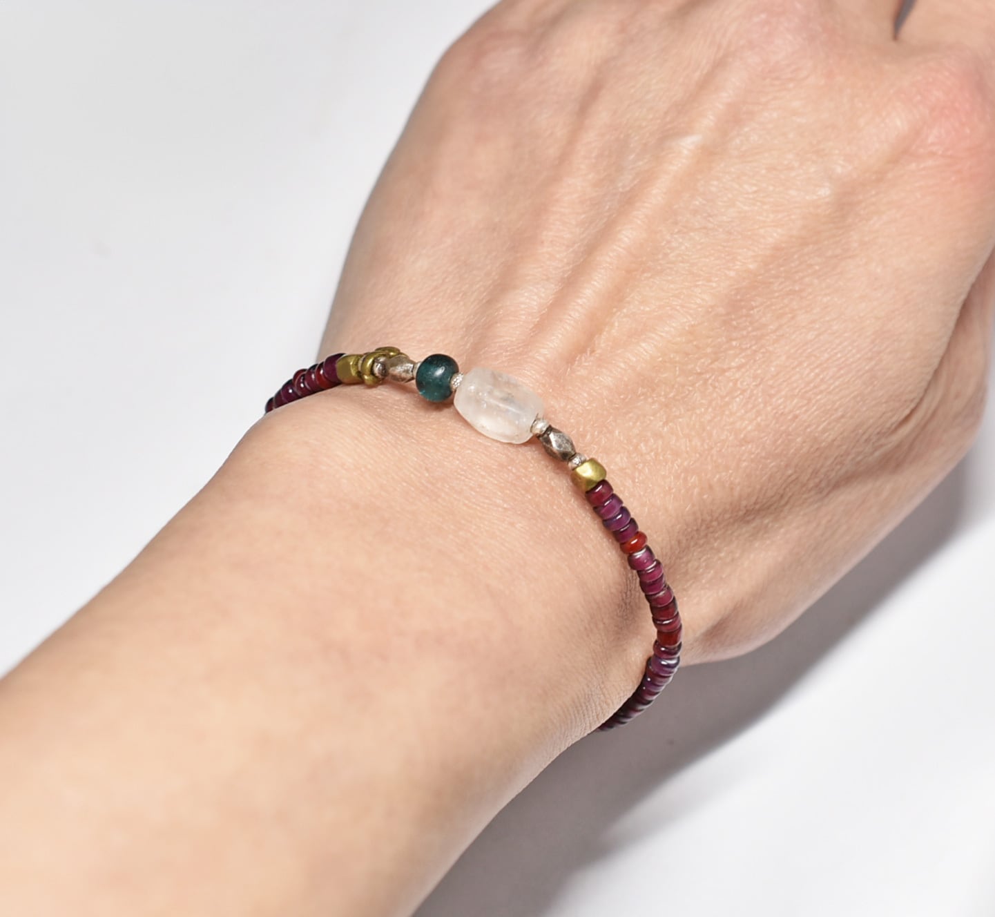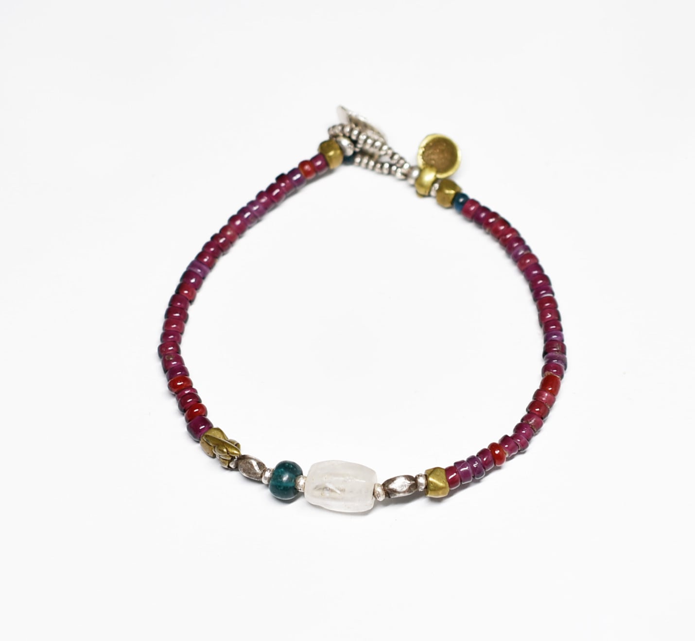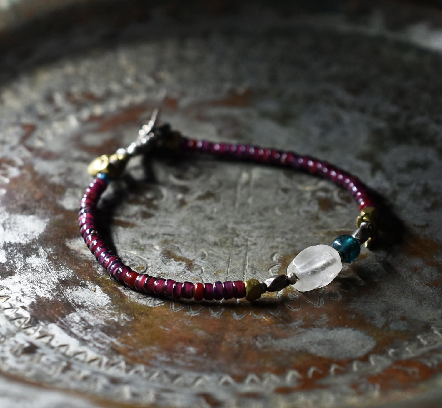古代水晶とインディゴブルービーズ、葡萄色&濃赤ホワイトハーツ、oldチンシルバー&オリッサブラスの華奢なブレス
