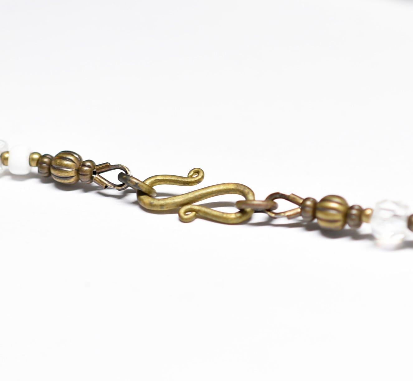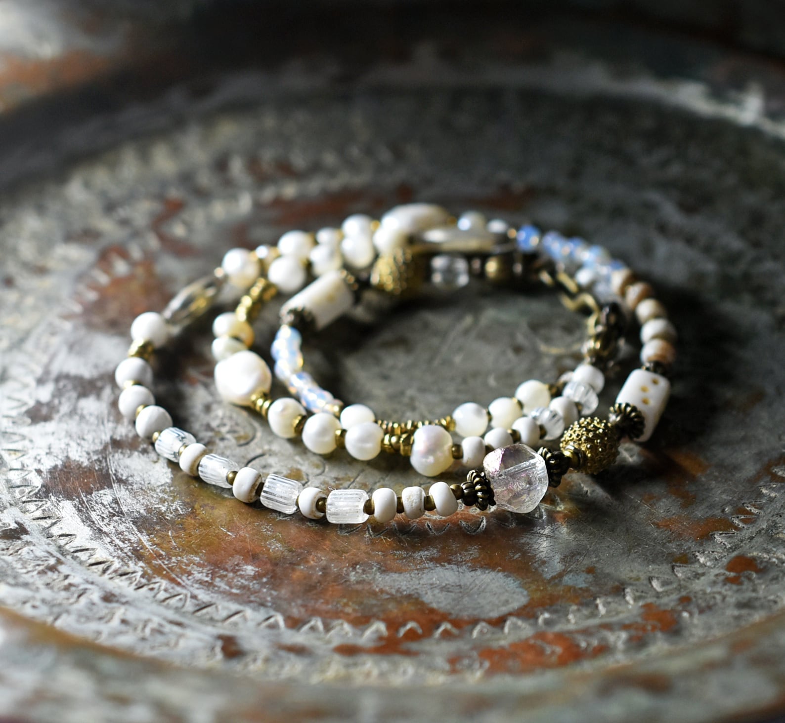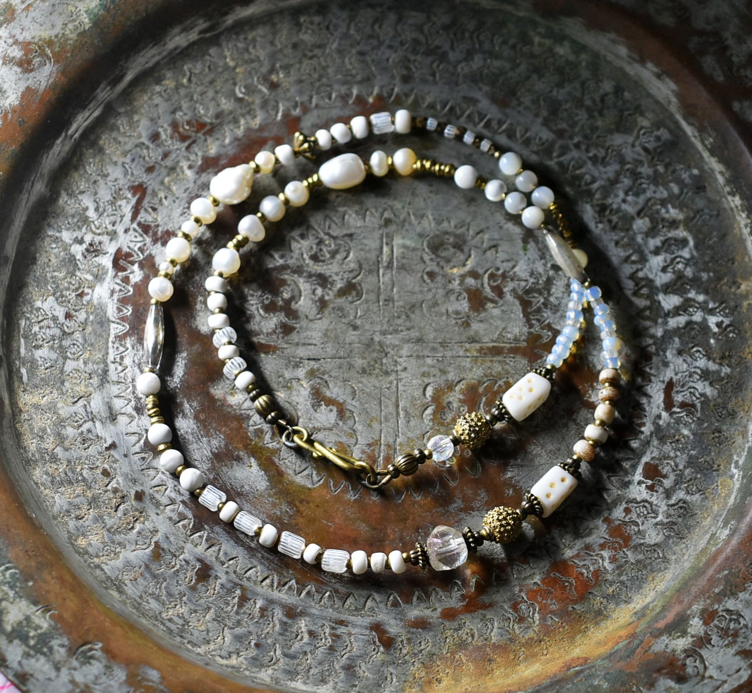 白いビーズはヴェネチアのアンティークビーズです。こちらも一粒一粒、形状が異なり、表情豊かです。