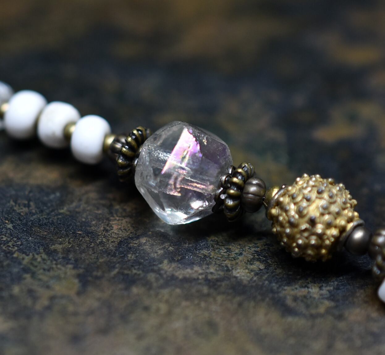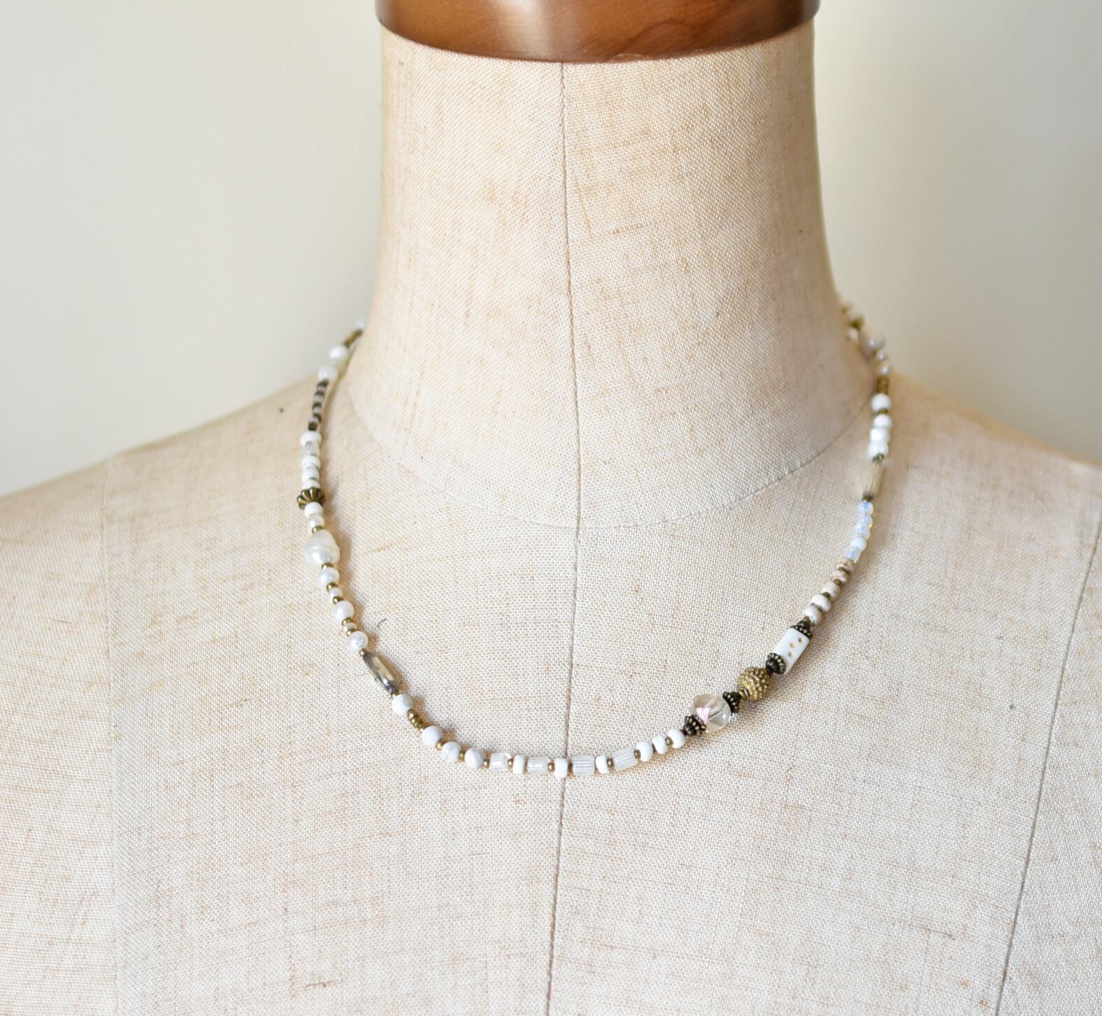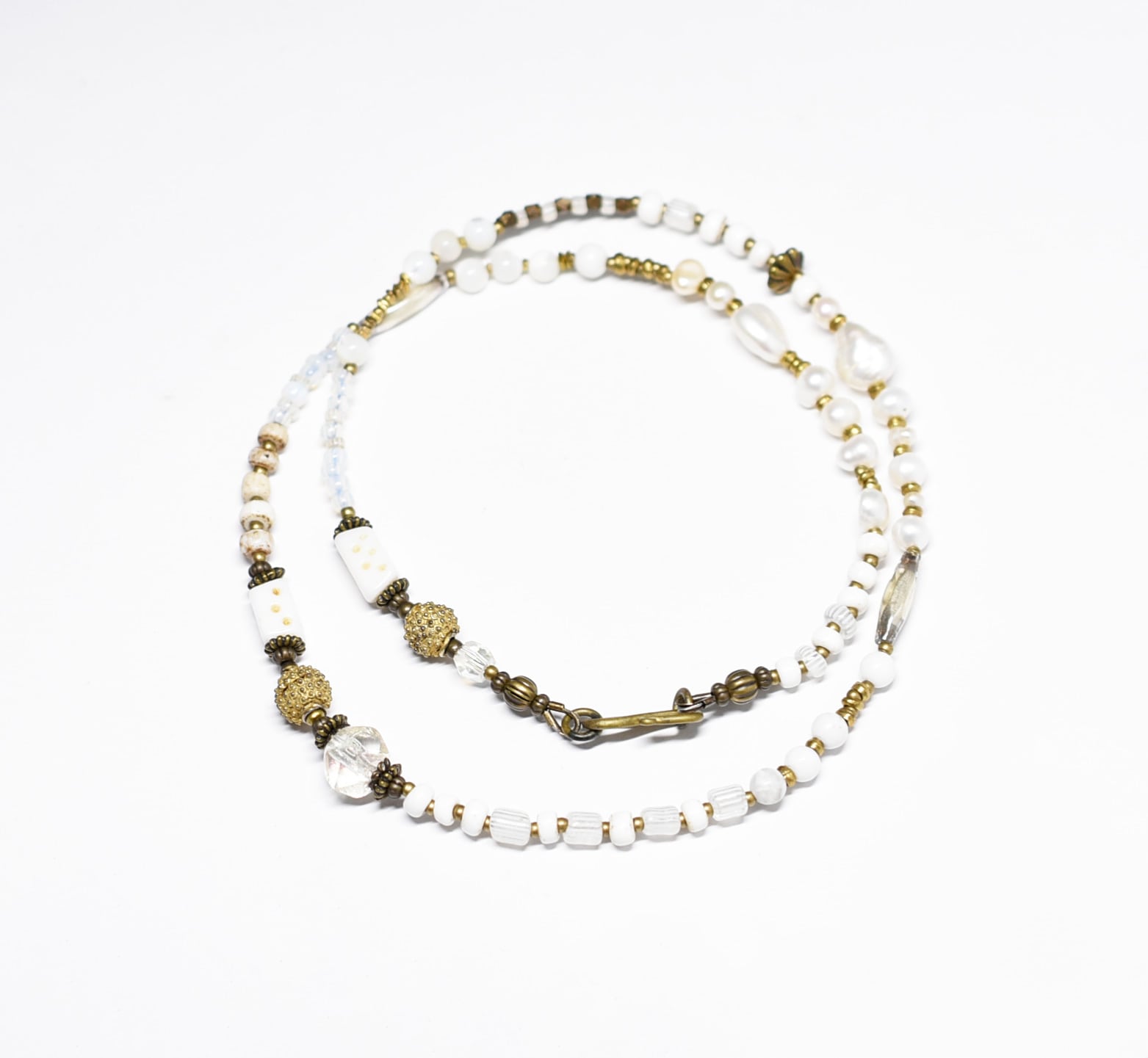 ヴィンテージオーロラビーズ、ホワイトダイスビーズ、つぶつぶブラス、淡水パール、多彩ホワイトビーズのネックレス