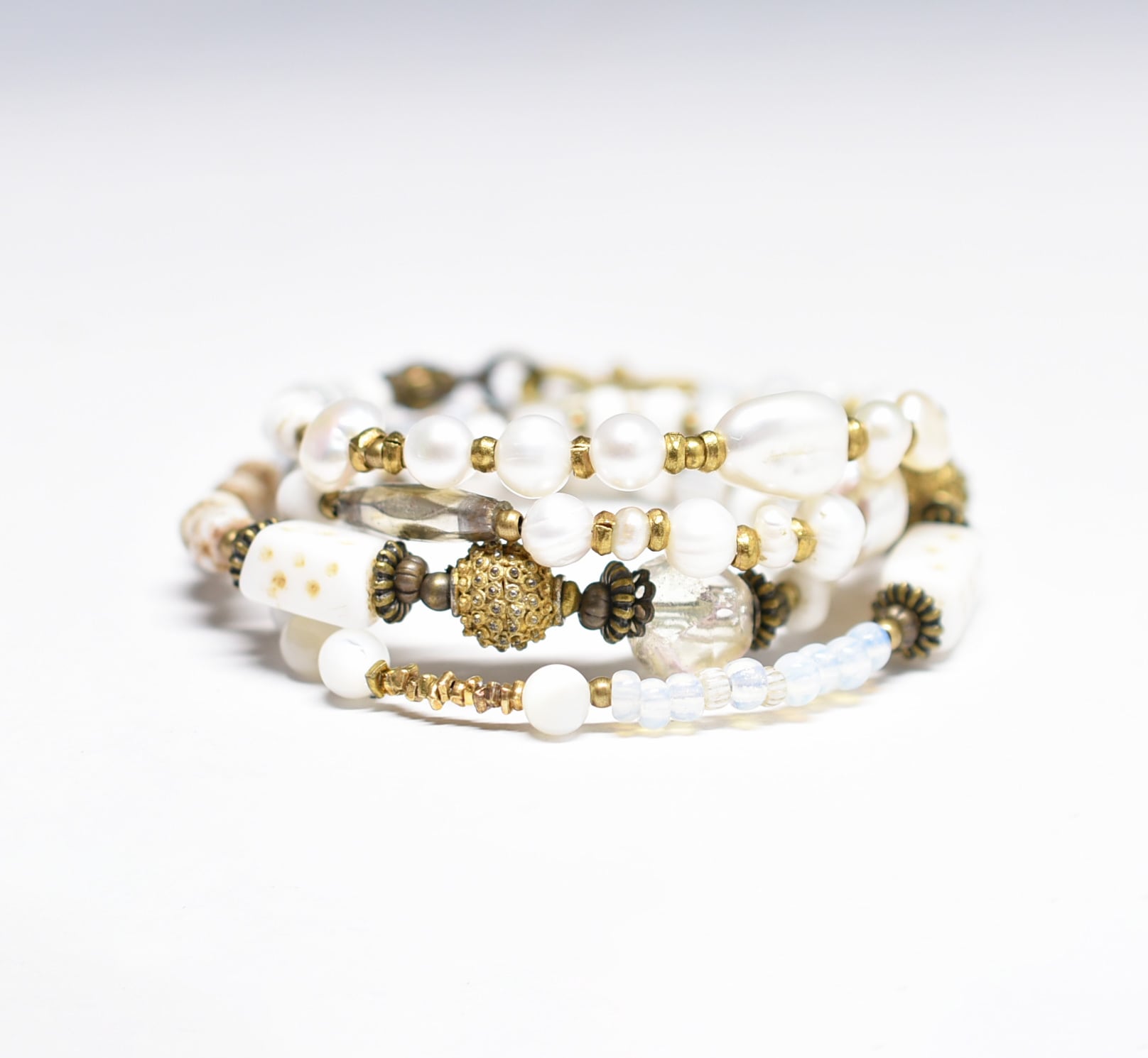 素材:ガラス、真鍮、淡水パール、ハウライトトルコ、白蝶貝、ワイヤー