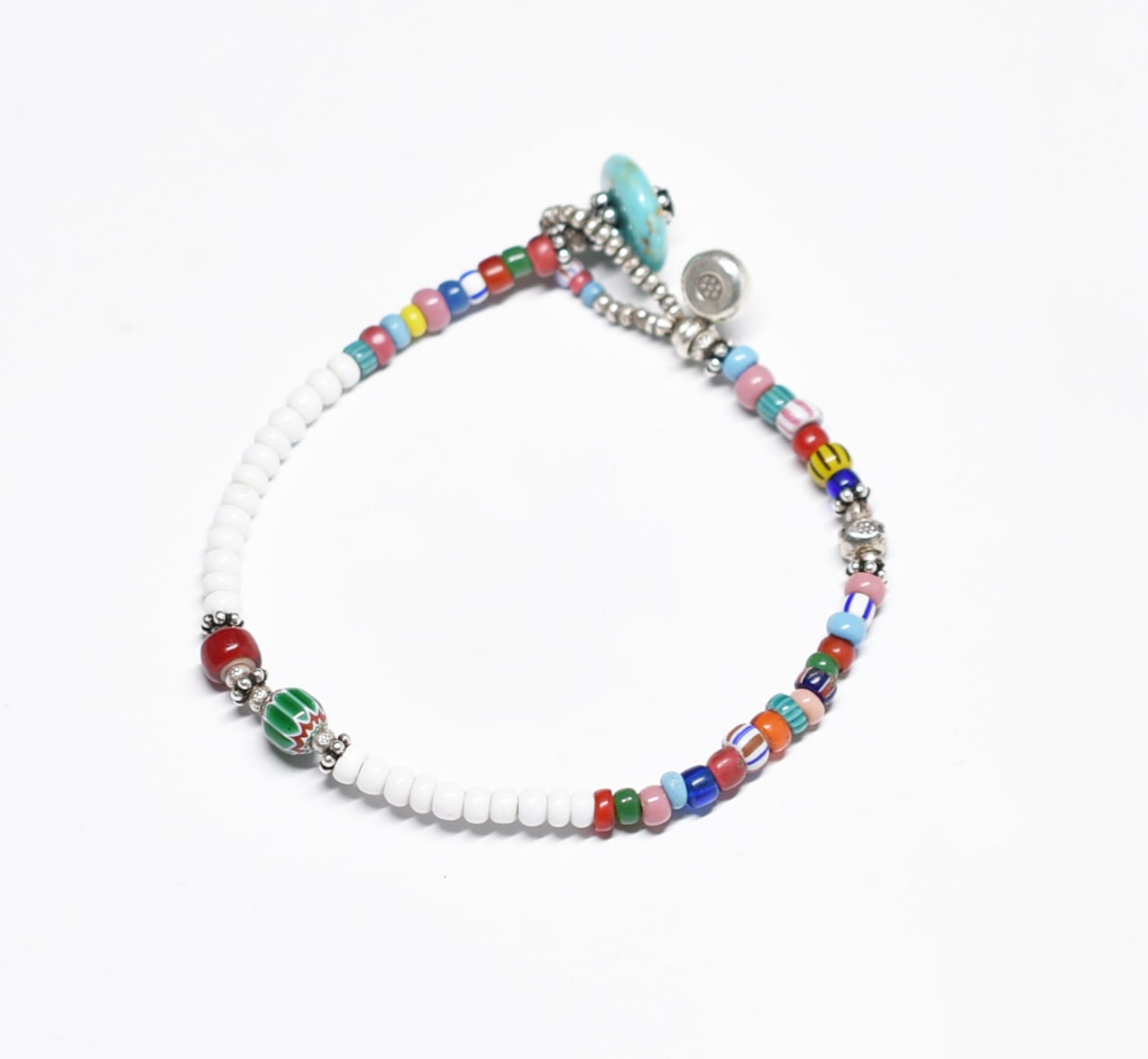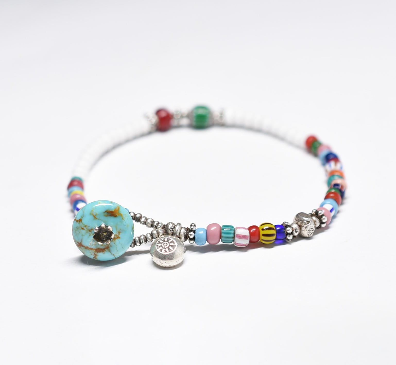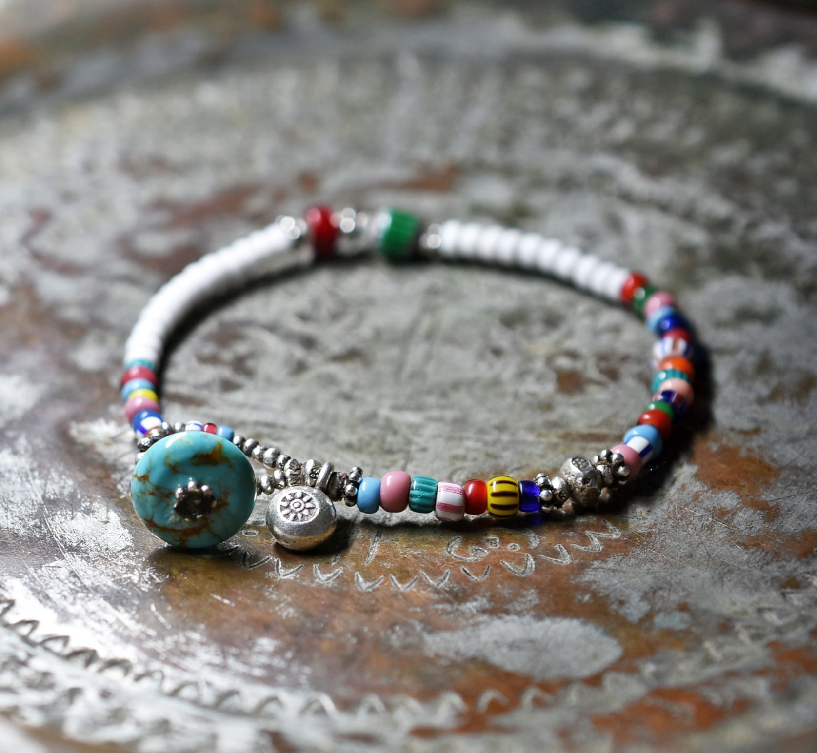 グリーンシェブロン、カレンシルバー、多彩ヴェネチアアンティークビーズのカラフルブレス(ターコイズ留め金)