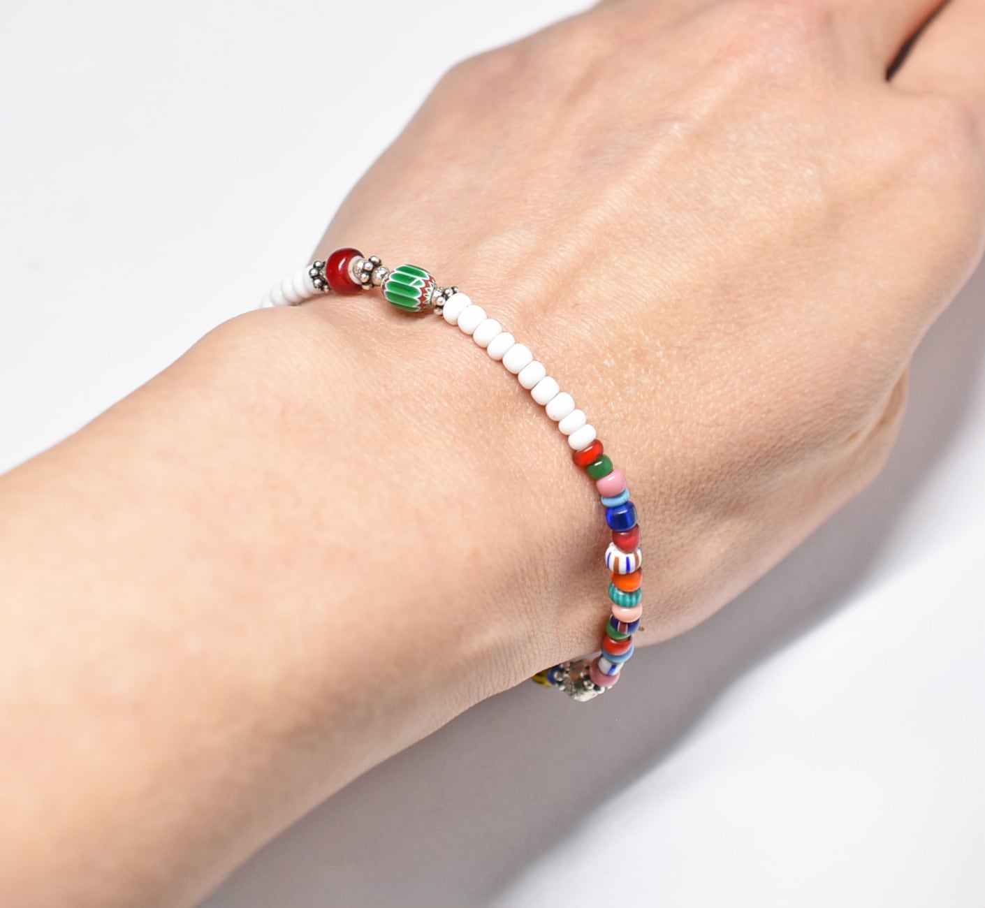 グリーンシェブロン、カレンシルバー、多彩ヴェネチアアンティークビーズを繋いだカラフルブレスです。