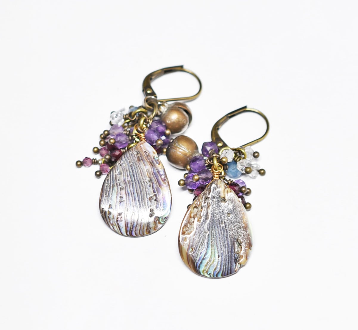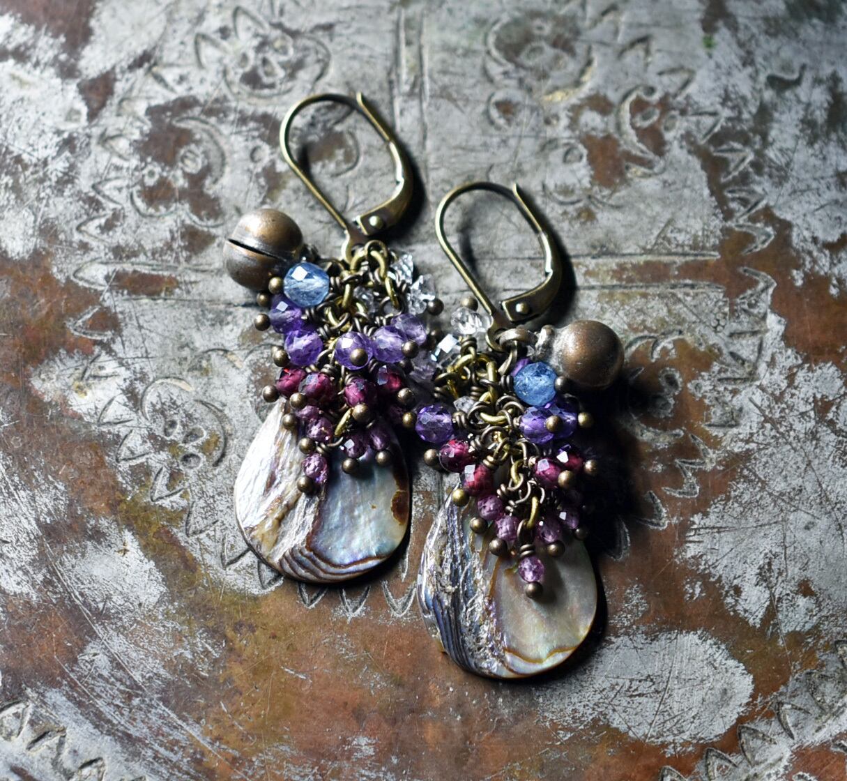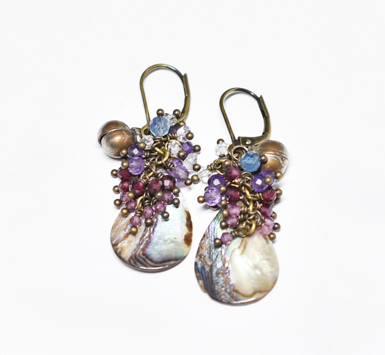 アバロンシェルとたわわなアメジスト&ガーネット&ハーキマーダイヤモンド、アクアマリン、民族鈴のピアス