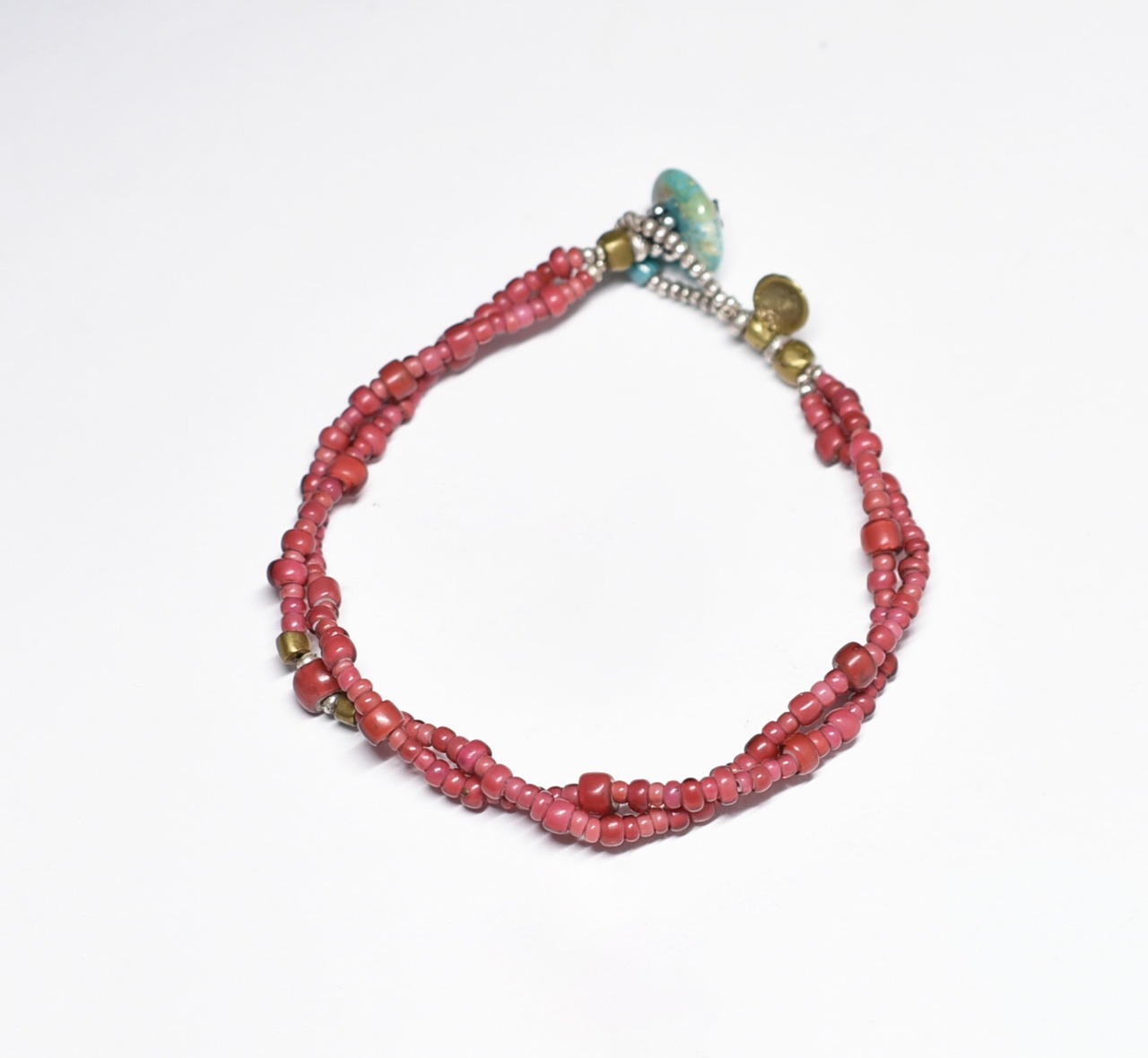 渋いピンク色のビーズはホワイトハーツと呼ばれるアンティークビーズです。芯(ハート)部分が白いことからこう呼ばれています。こちらは19~20世紀頃のヴェネチア産のビーズです。特にこちらは金で赤色を発色させているため、金赤ホワイトハーツと呼ばれる希少なビーズです。