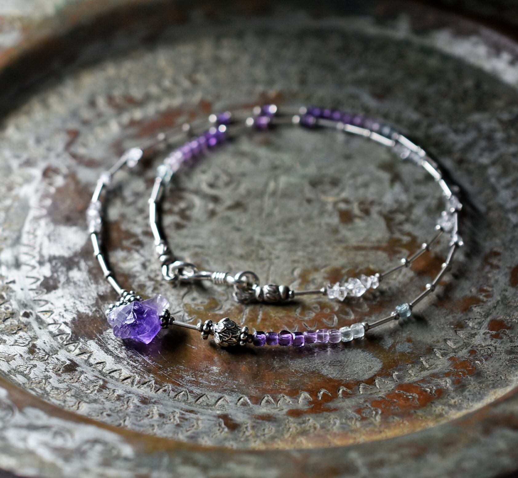 素材:ラフロックアメジスト、インドシルバー、フローライト、ハーキマーダイヤモンド、シルバー、カレンシルバー、ワイヤー