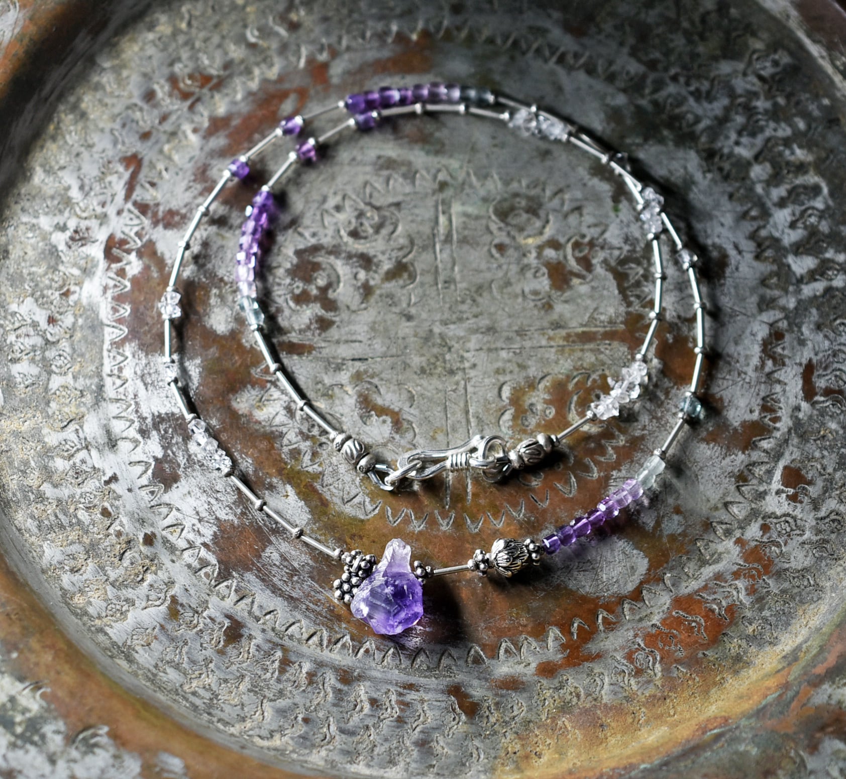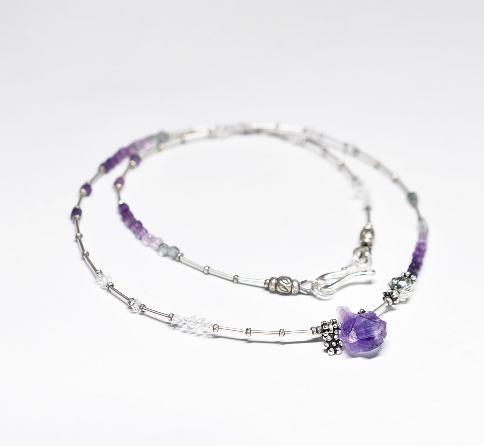 ラフロックアメジストと蓮花シルバーインドシルバー小花、フローライトとハーキマーダイヤモンド、繊細筒型シルバービーズの華奢なネックレス