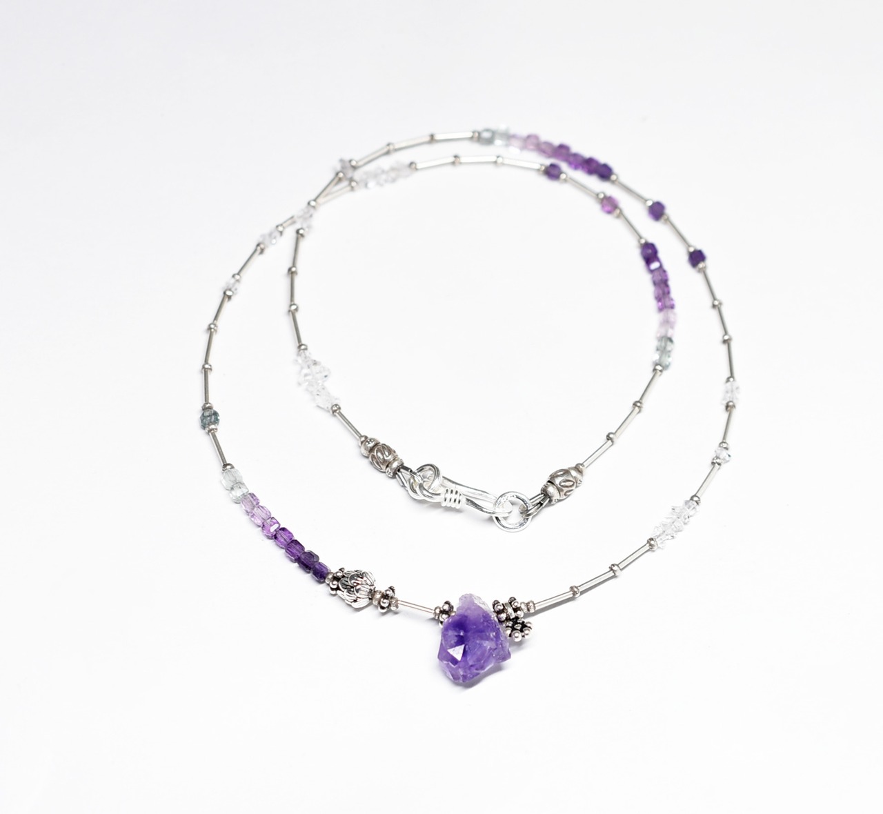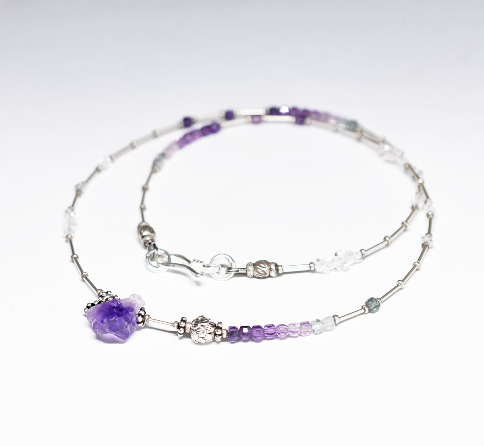 ラフロックアメジストと蓮花シルバーインドシルバー小花、フローライトとハーキマーダイヤモンド、繊細筒型シルバービーズなどを繋いだ華奢なネックレスです。
