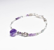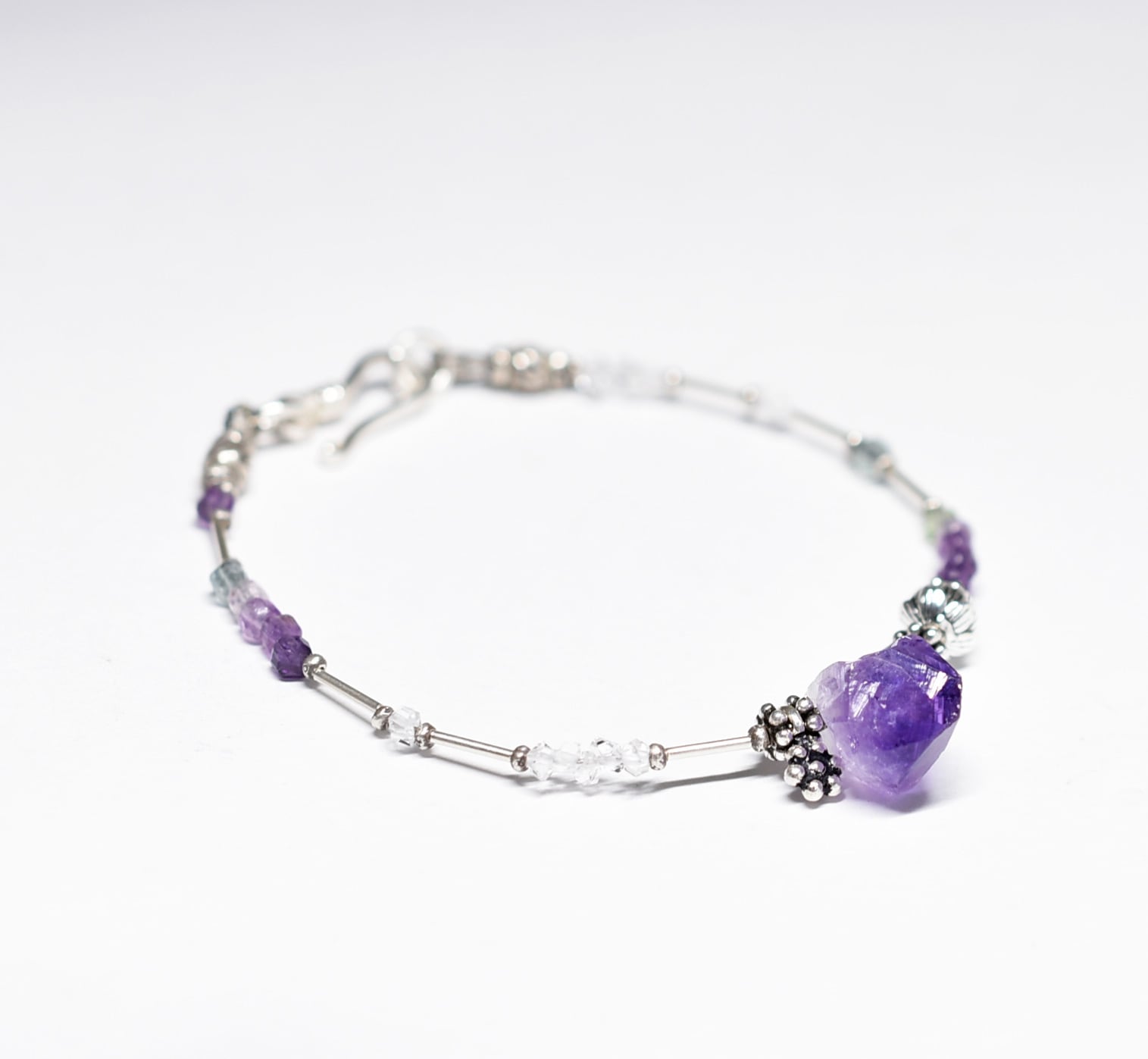 ラフロックアメジストと蓮花シルバーインドシルバー小花、フローライトとハーキマーダイヤモンド、繊細筒型シルバービーズなどを繋いだ華奢なブレスです。