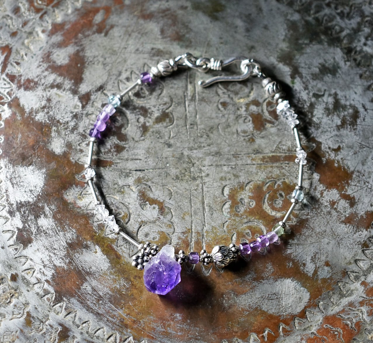 ラフロックアメジストと蓮花シルバー&インドシルバー小花、フローライトとハーキマーダイヤモンド、繊細筒型シルバービーズの華奢なブレス