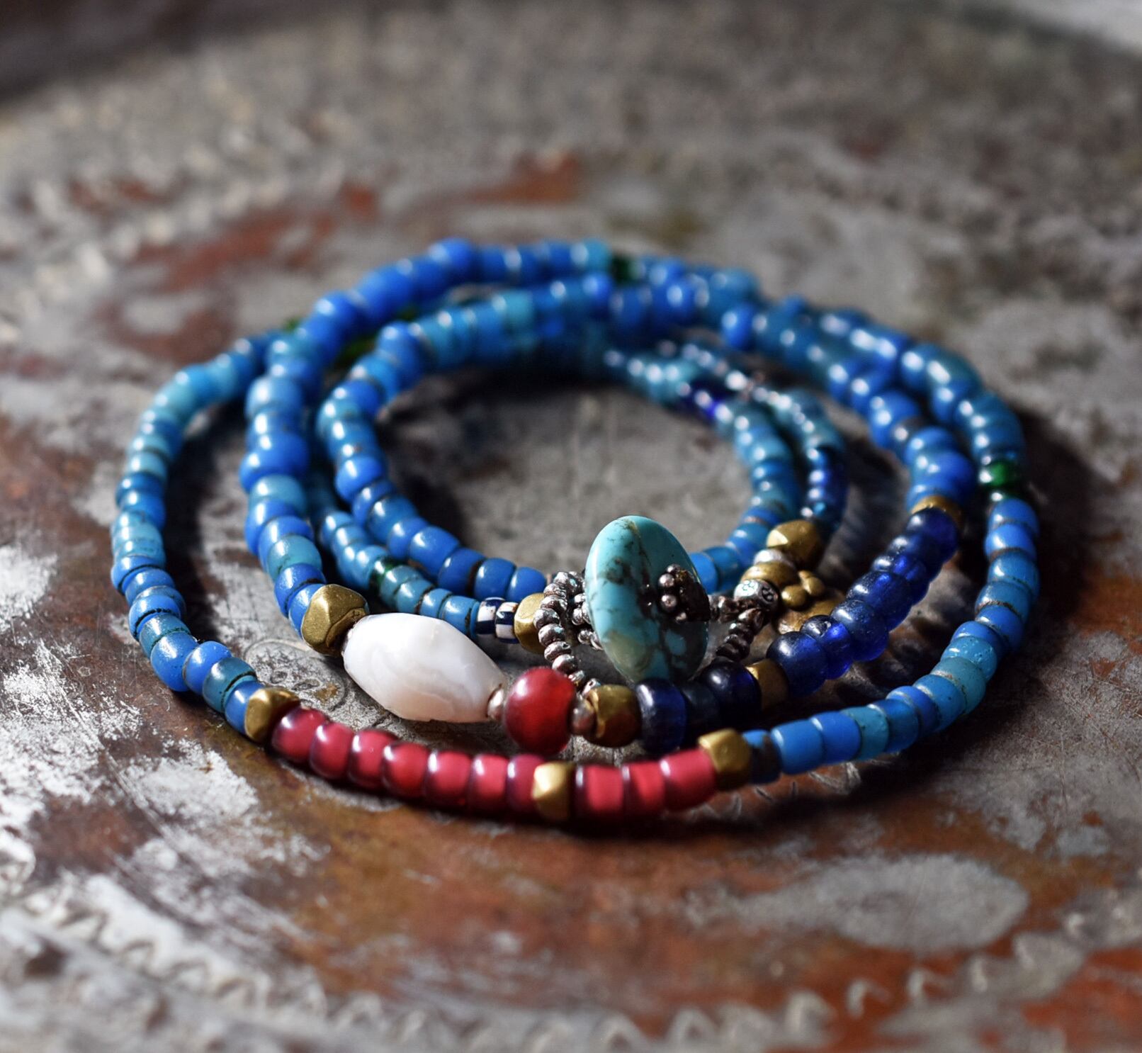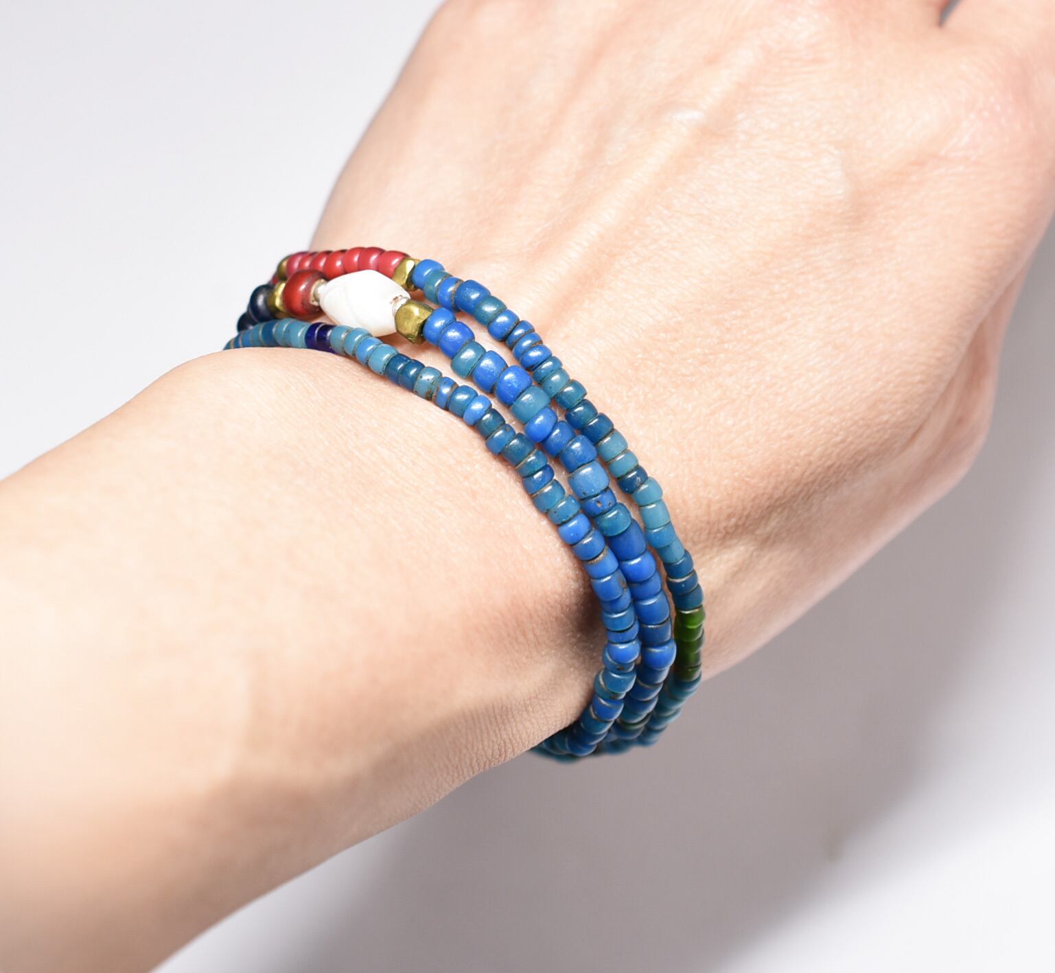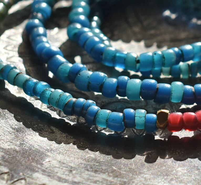 サックスブルーや瑠璃色、縞模様入りやグリーンインドのナガ族に渡った、古いヴェネチアビーズです。