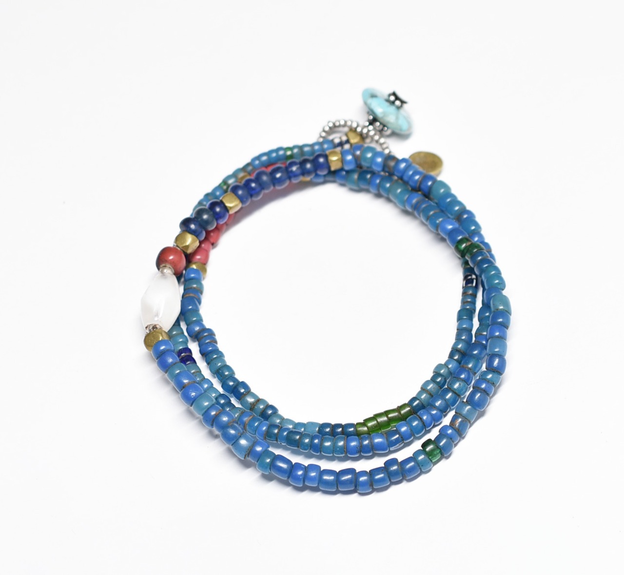 素材:アフリカ出土瑪瑙、ガラス、カレンシルバー、oldオリッサブラス、ロウビキ紐、貝ビーズ、ミックスメタル