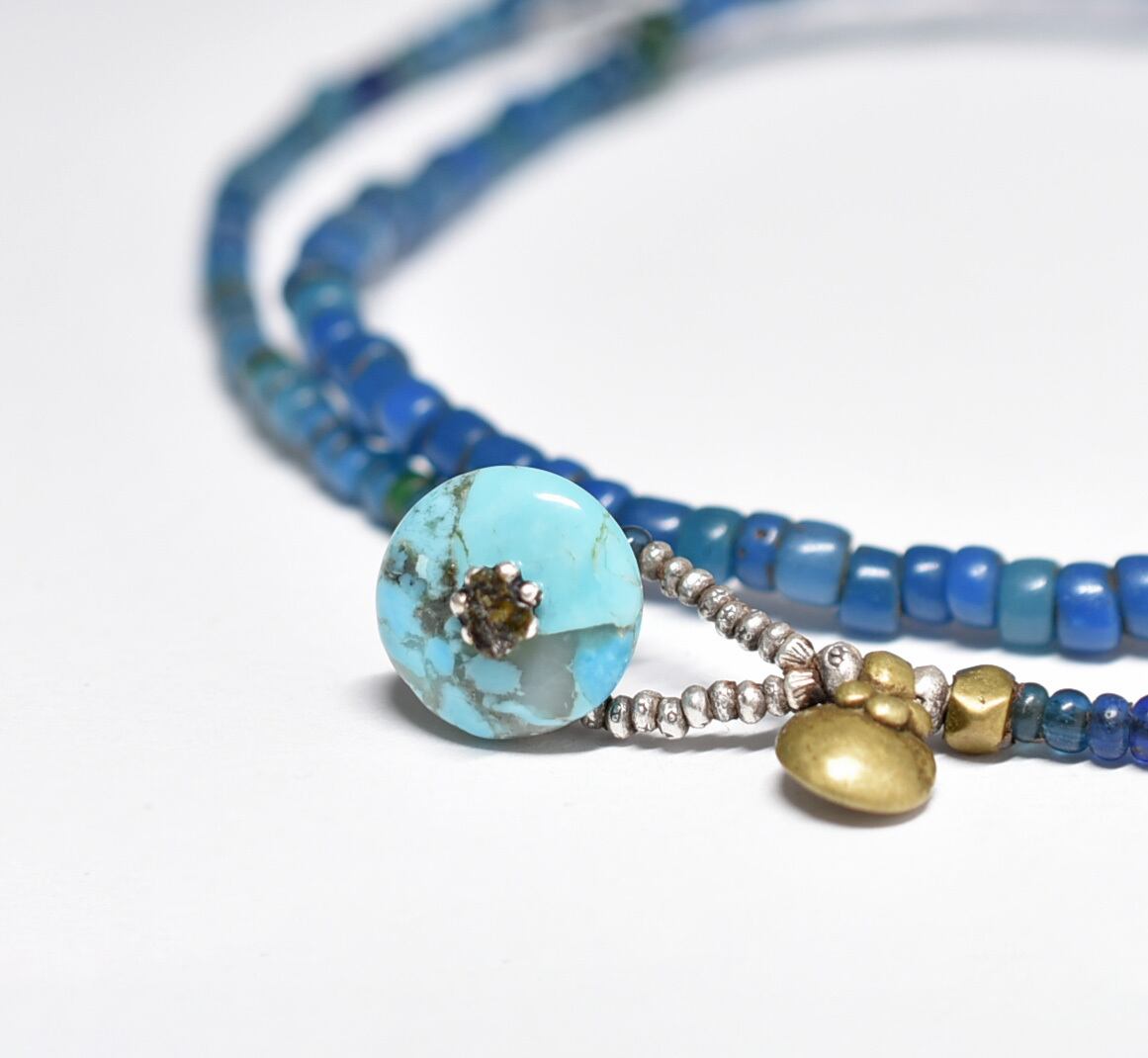 ナガ族アンティークビーズとアフリカ出土瑪瑙、金赤ホワイトハーツ、ブルー&インディゴブルービーズ、oldオリッサブラスのネックレス(ターコイズ留め金)