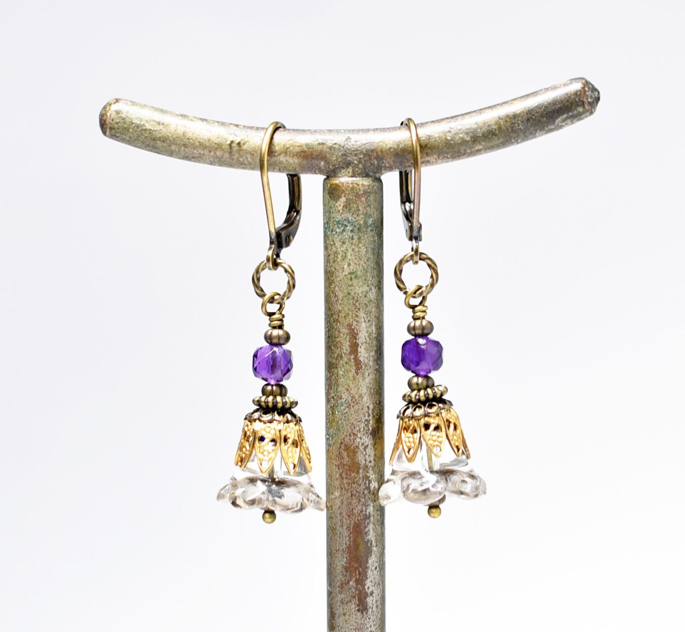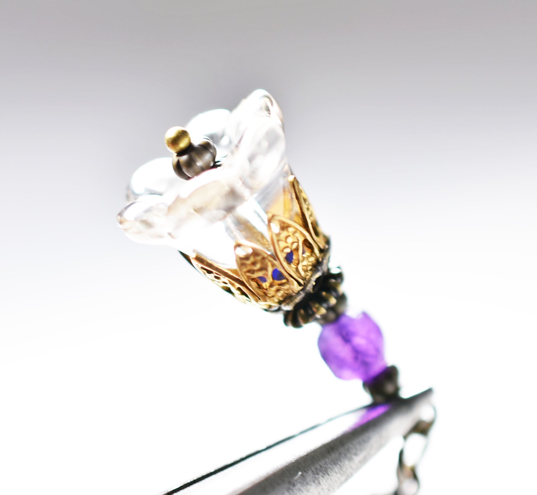 お花japanヴィンテージビーズとアメジスト、隠しブルービーズを繋いだピアスです。