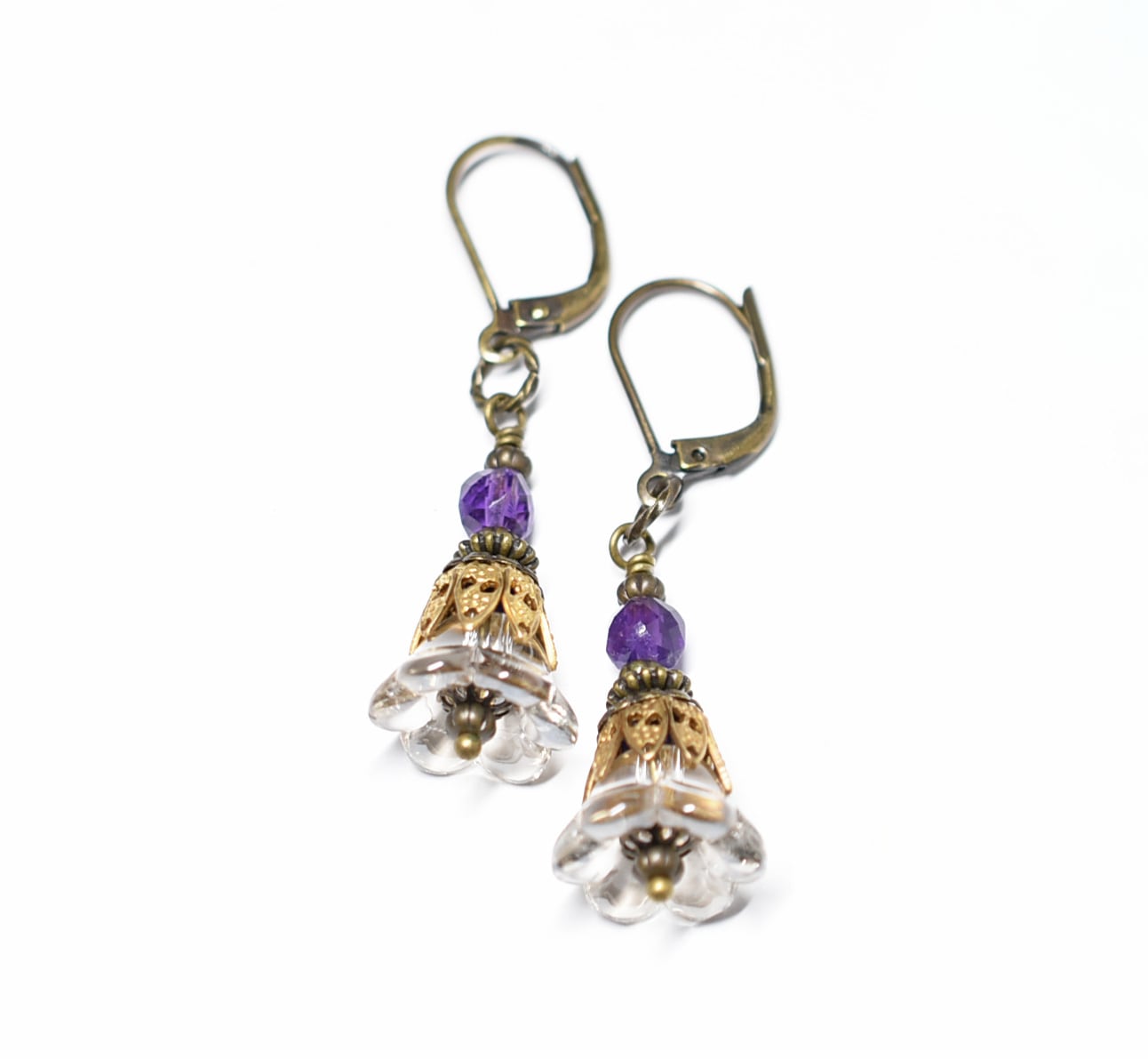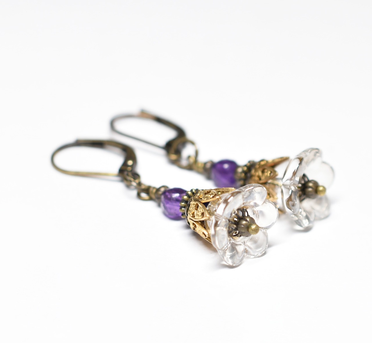 お花japanヴィンテージビーズとアメジスト、隠しブルービーズのピアス