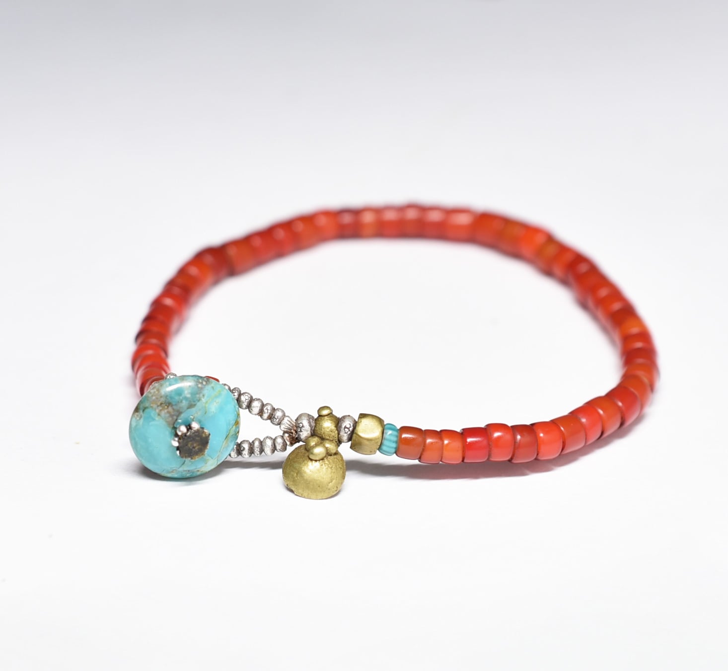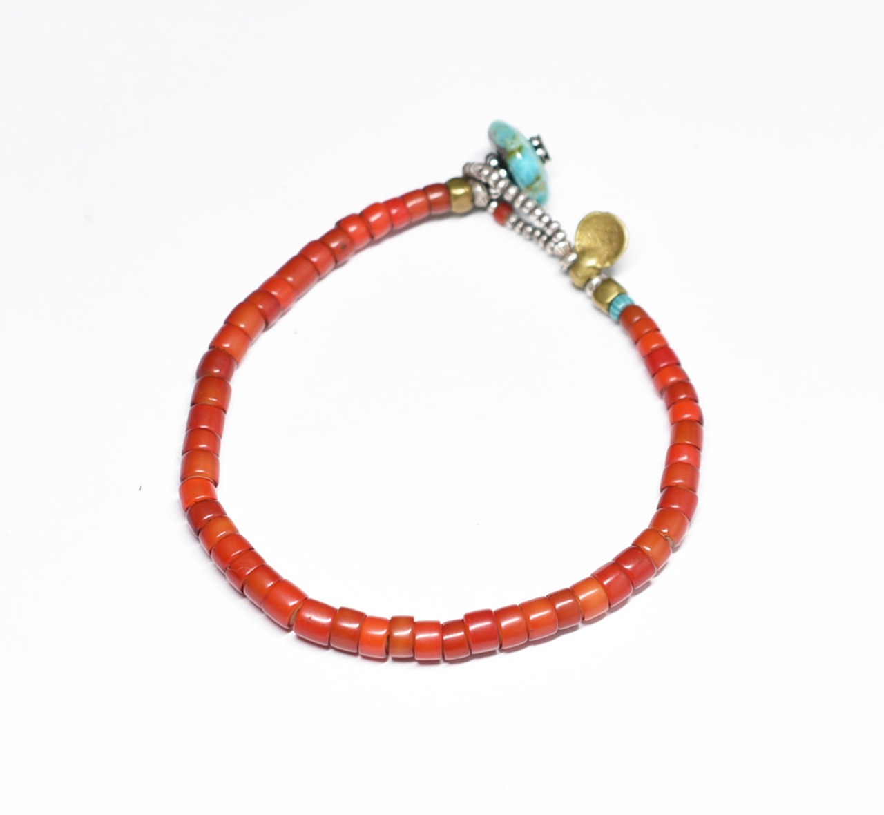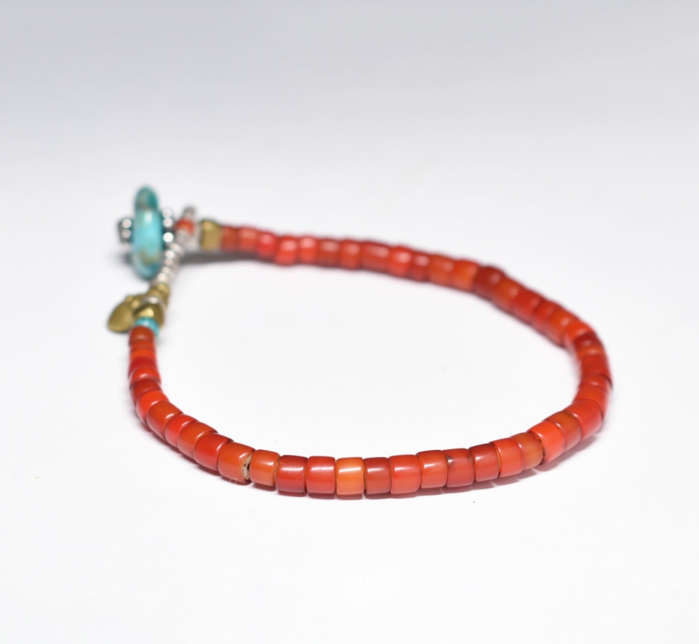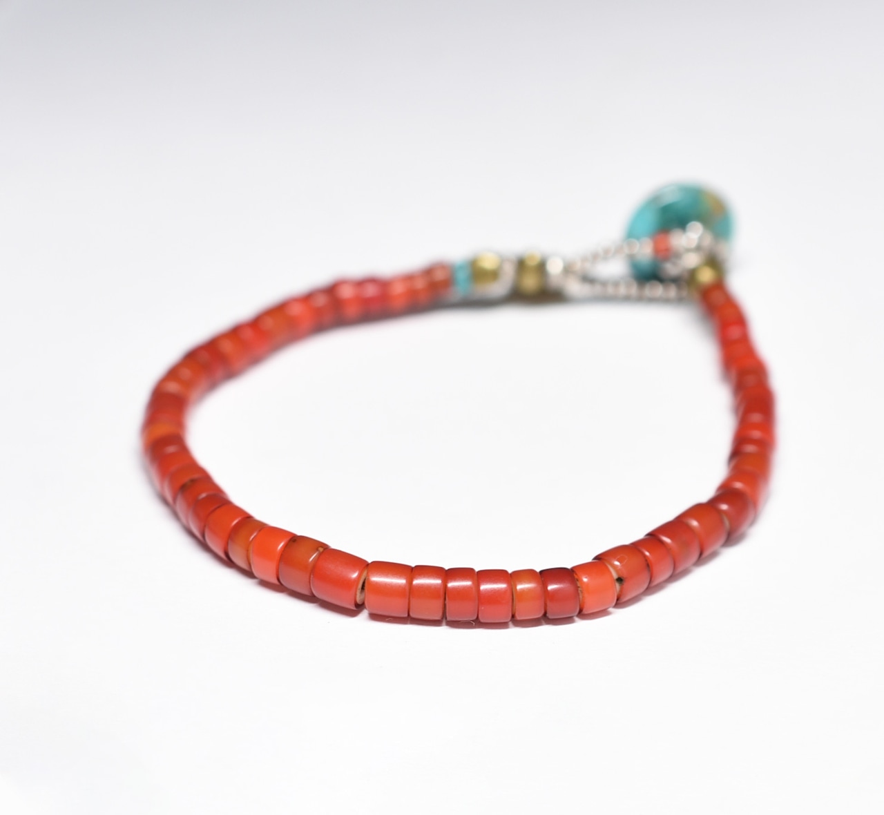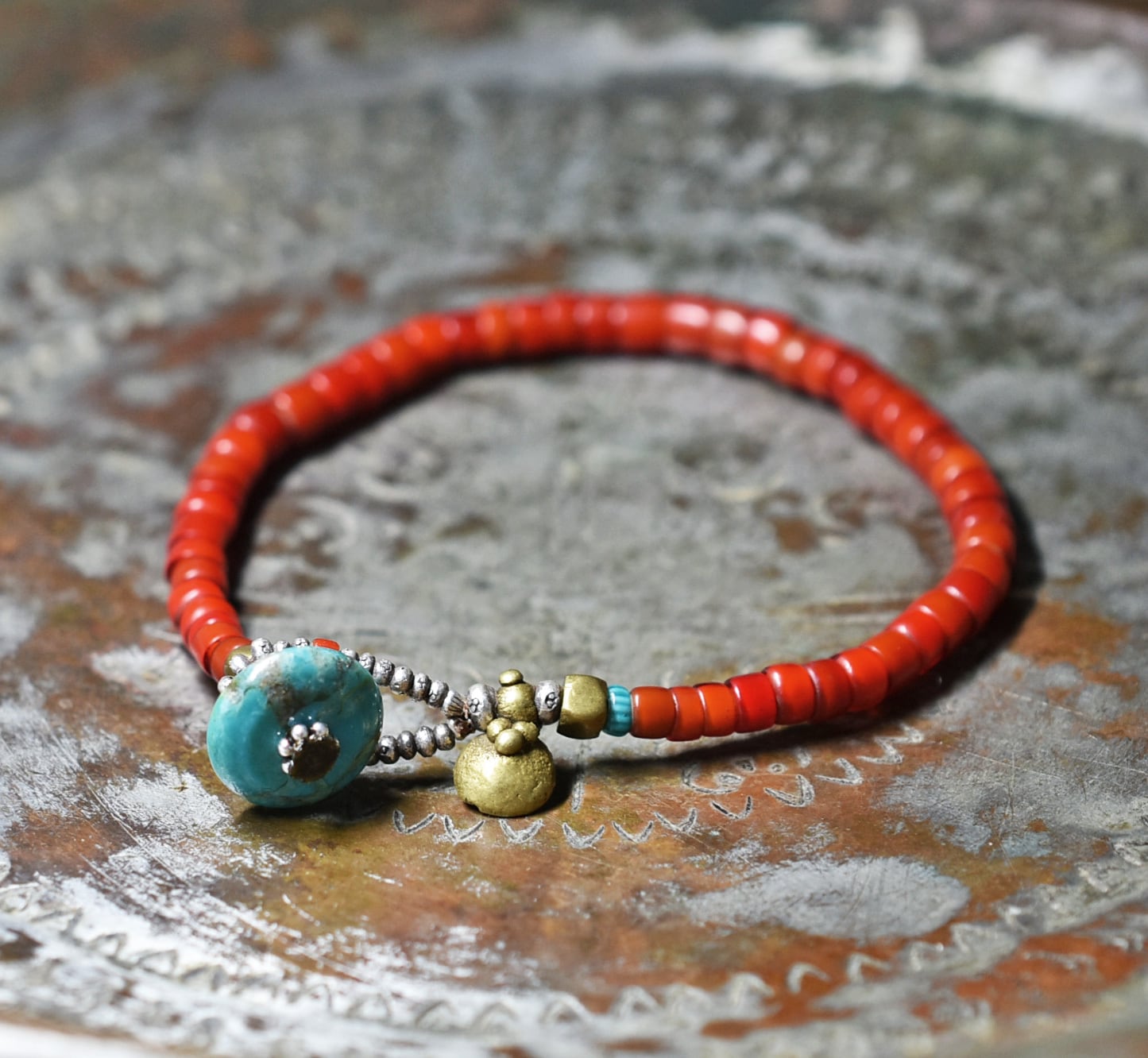 アンティーク飴色と朱赤色ホワイトハーツと一粒ターコイズブルーシェブロンを繋いだブレスです。
