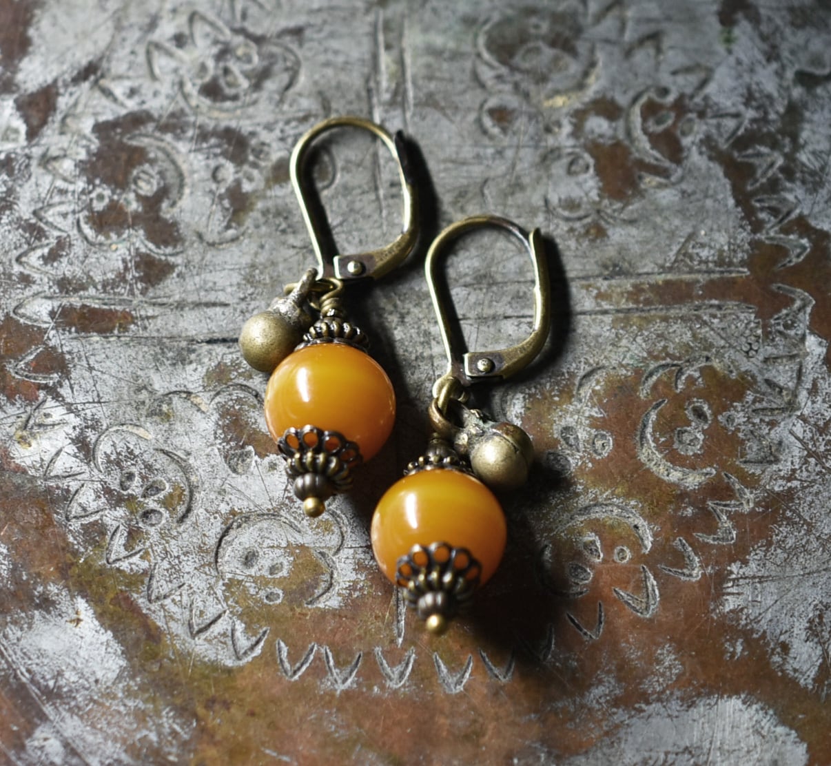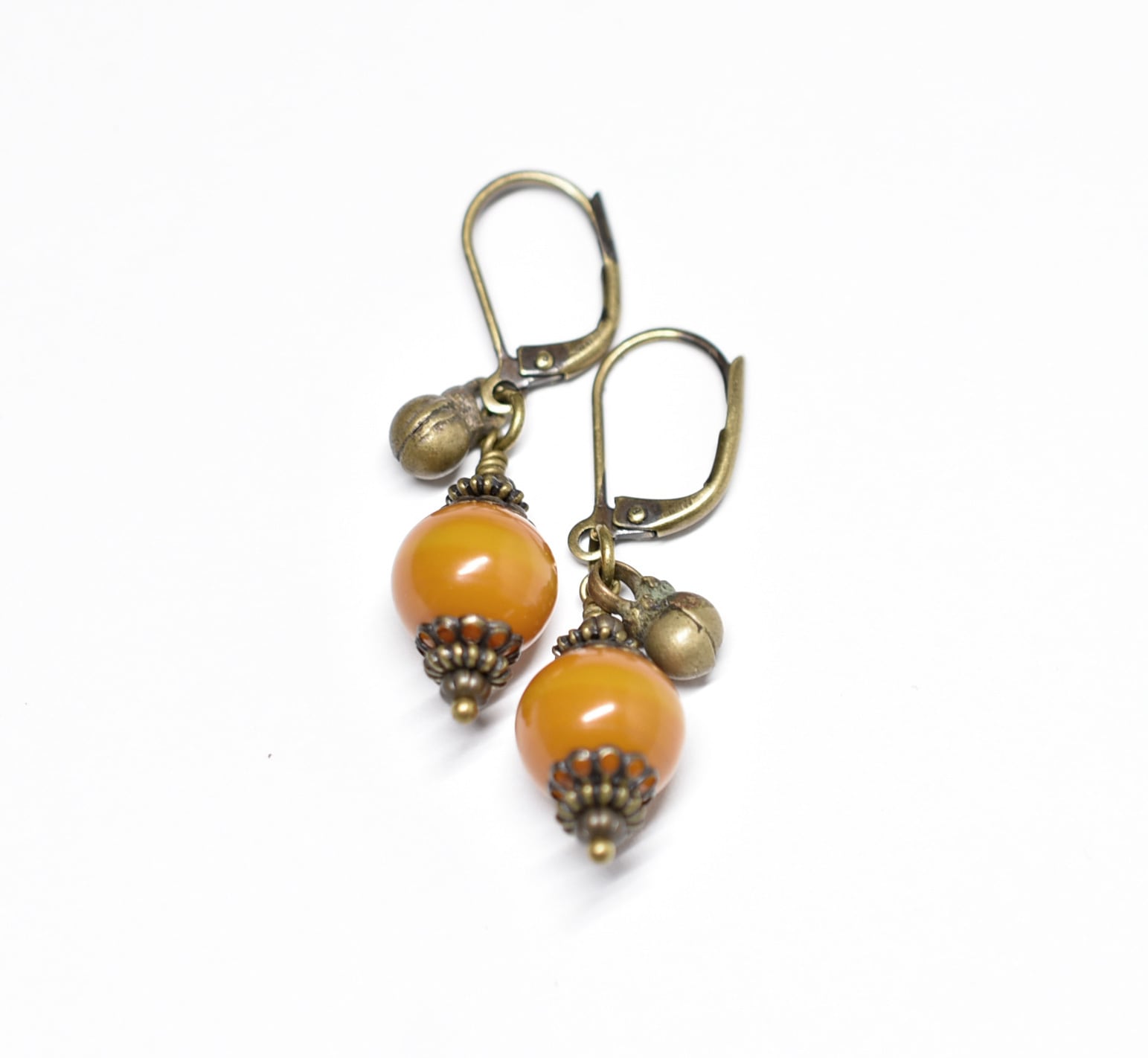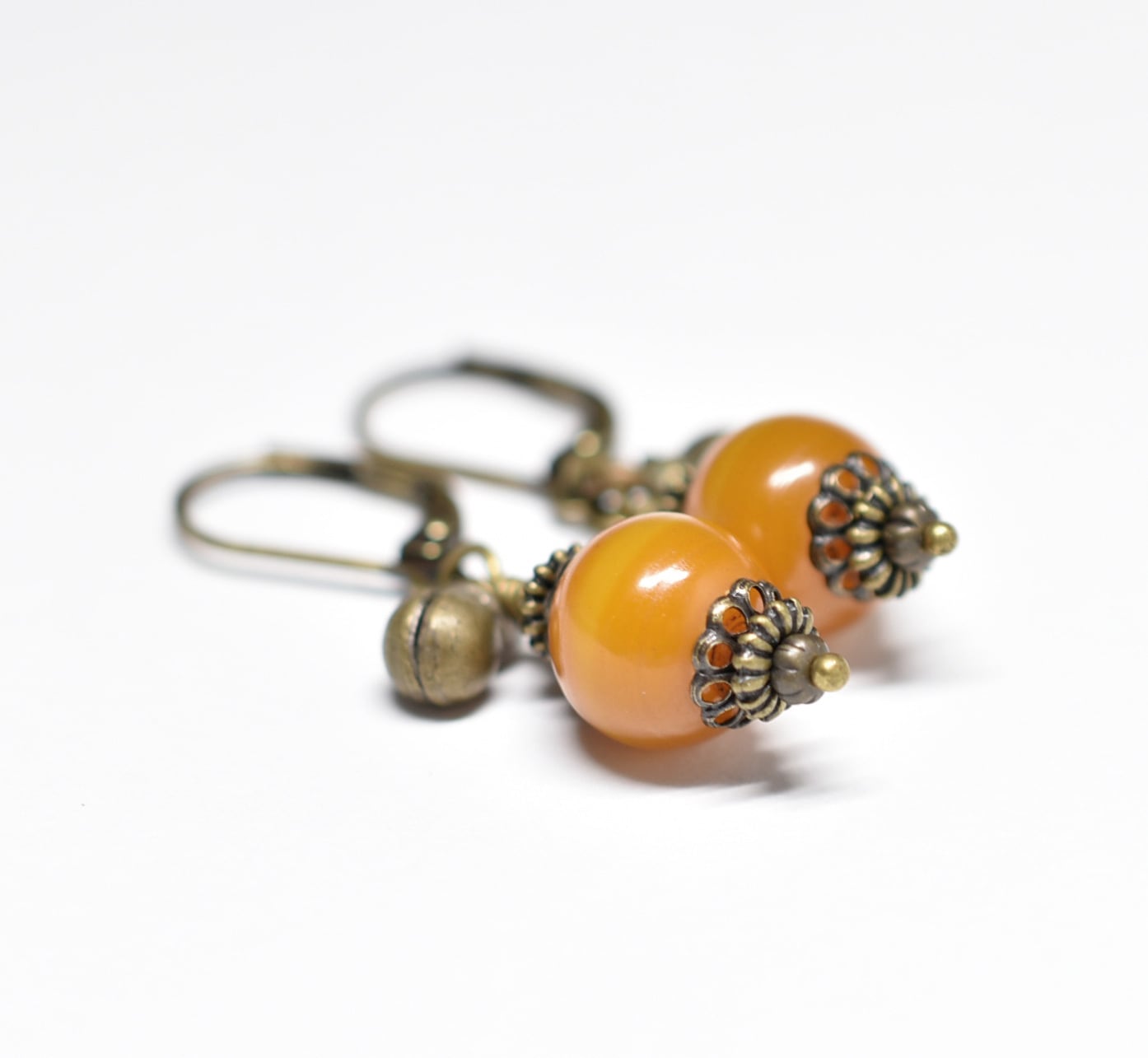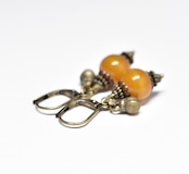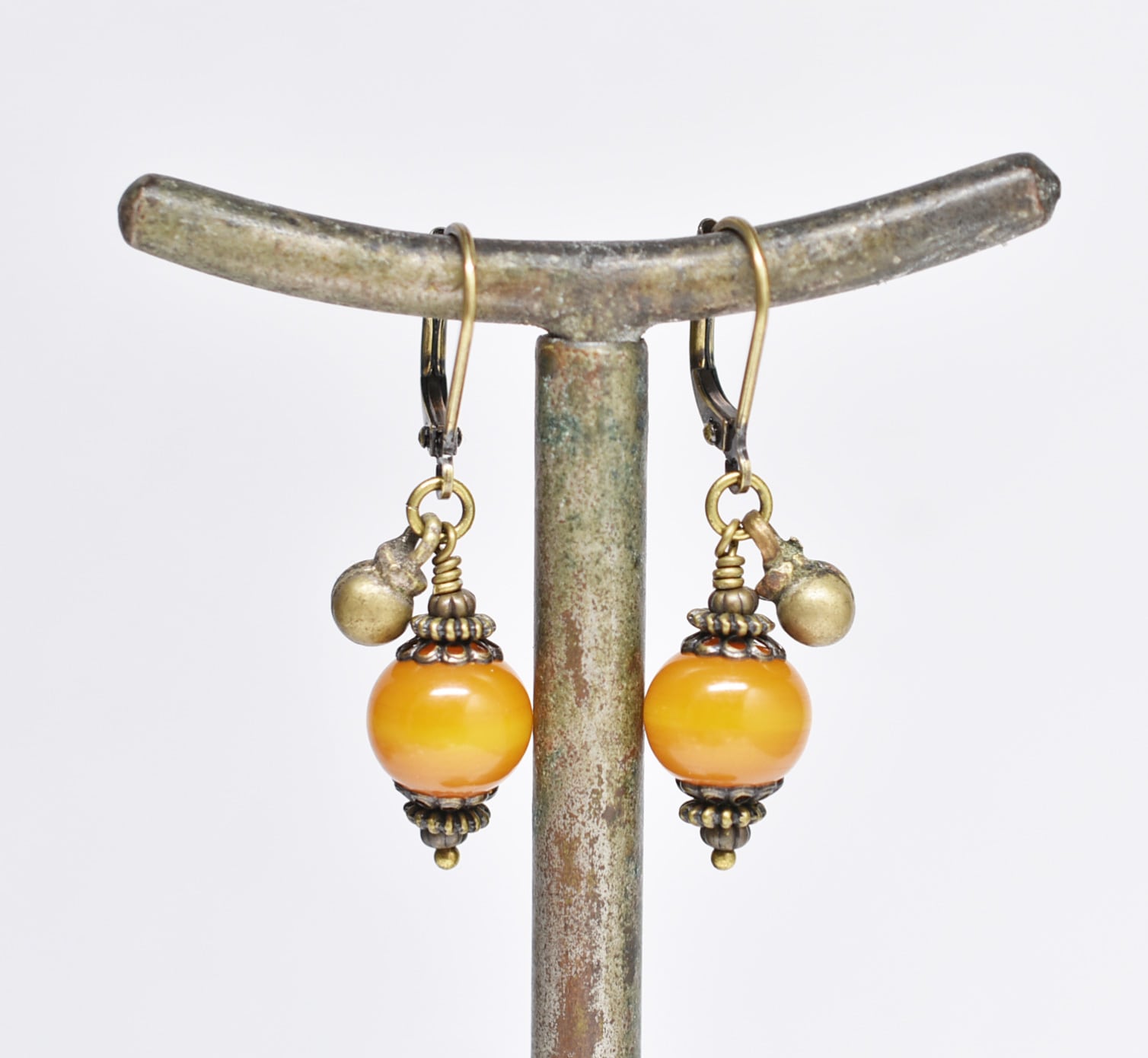 ツートン琥珀色アフリカンアンバーと民族鈴を繋いだピアスです。