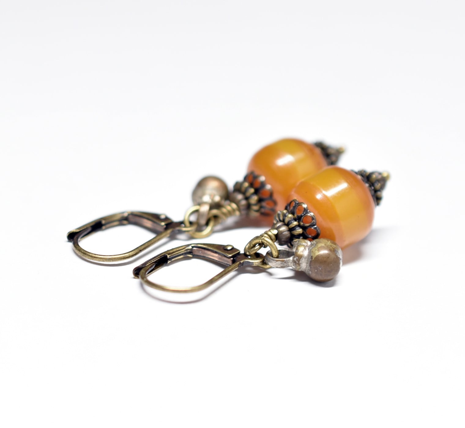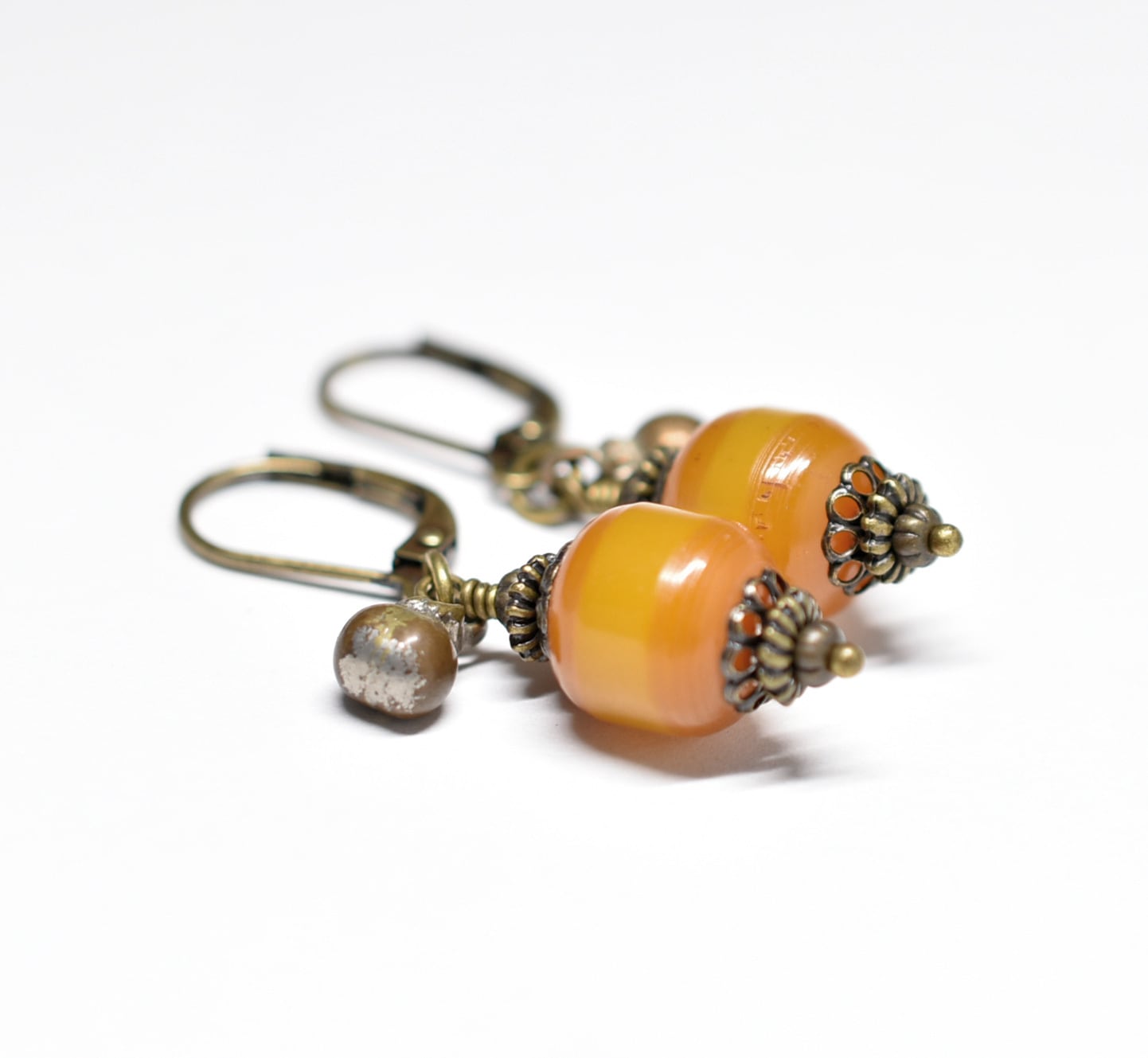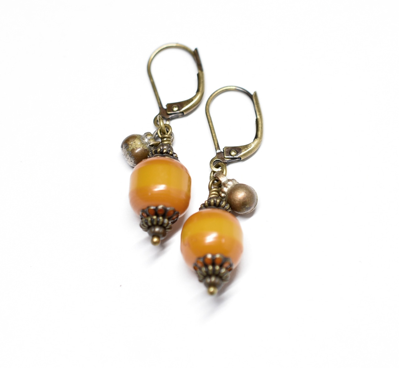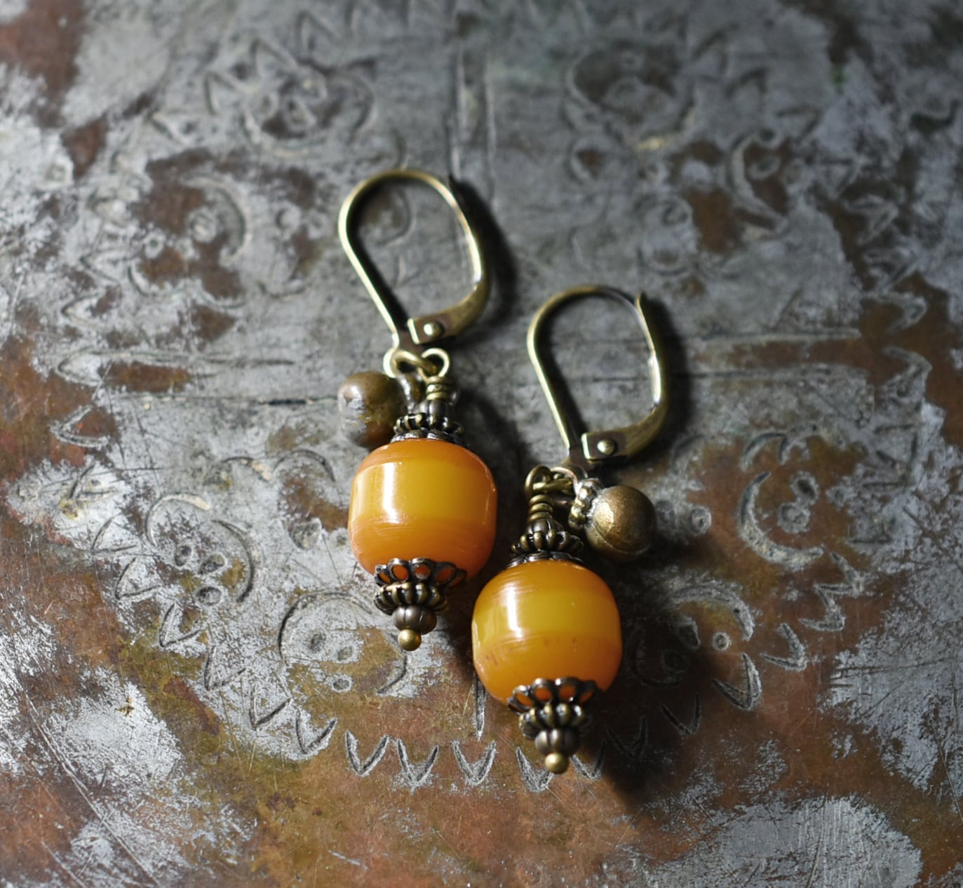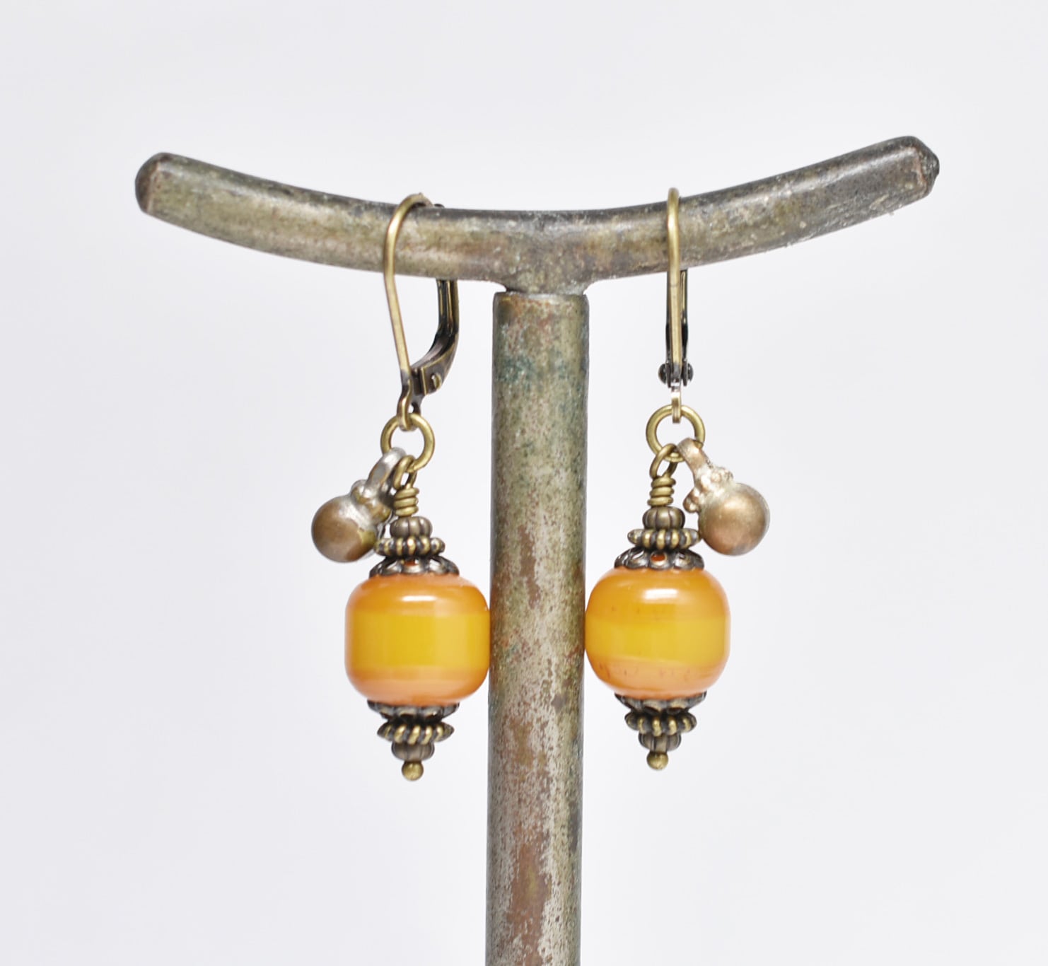 ツートン琥珀色アフリカンアンバーと民族鈴を繋いだピアスです。