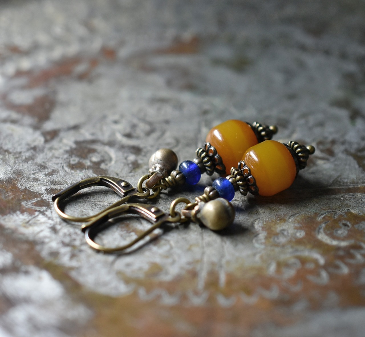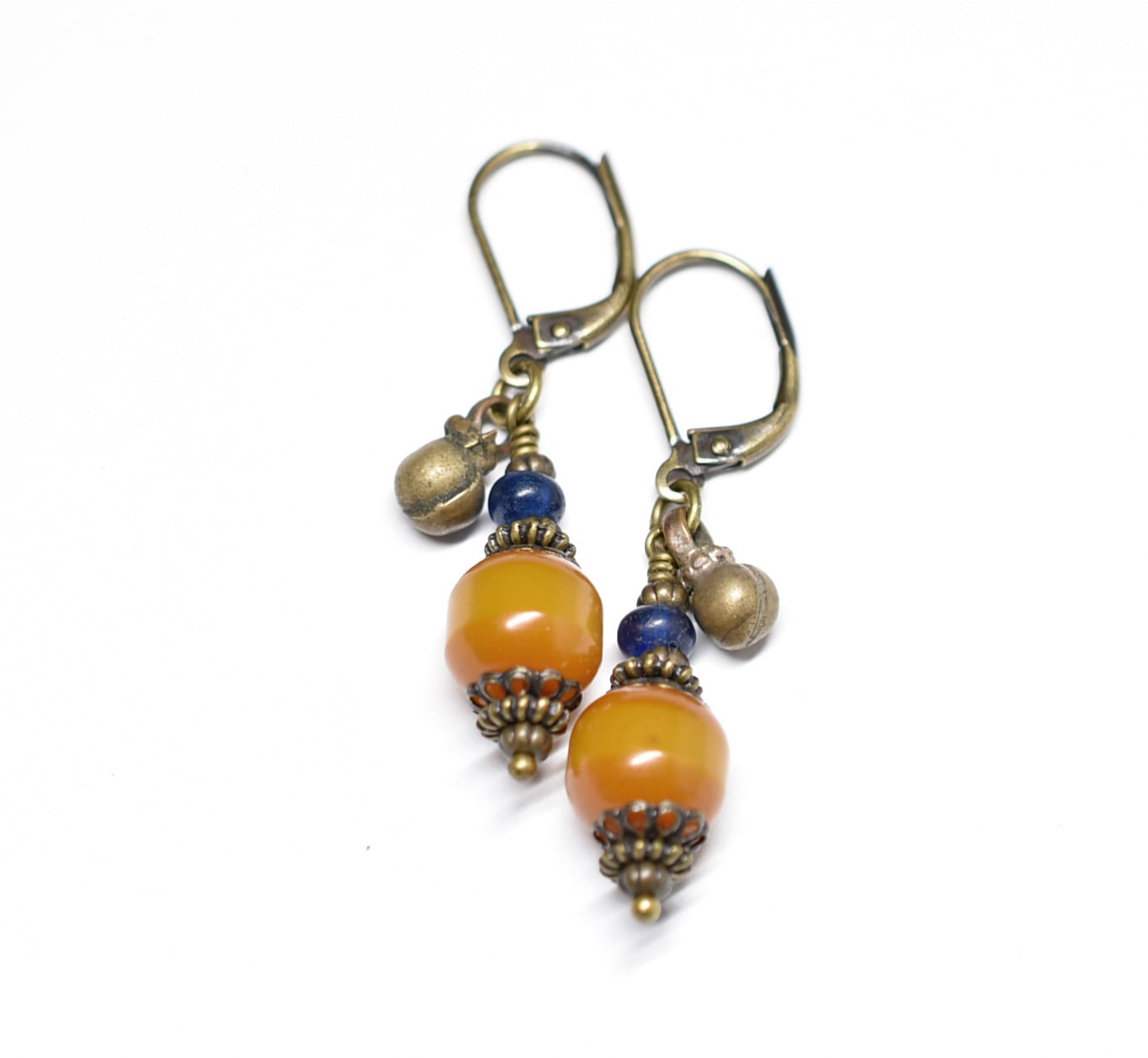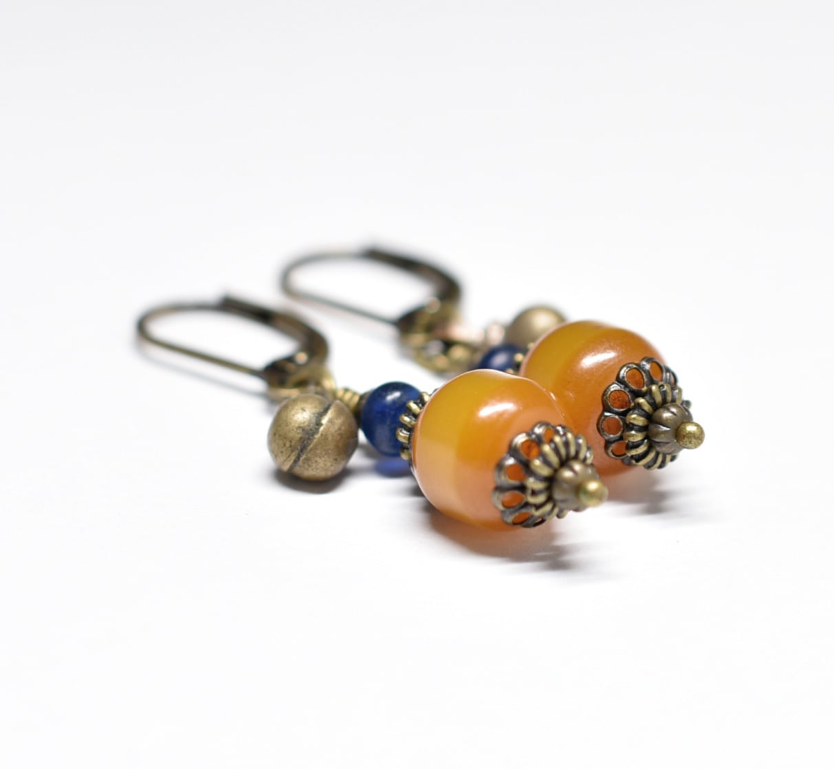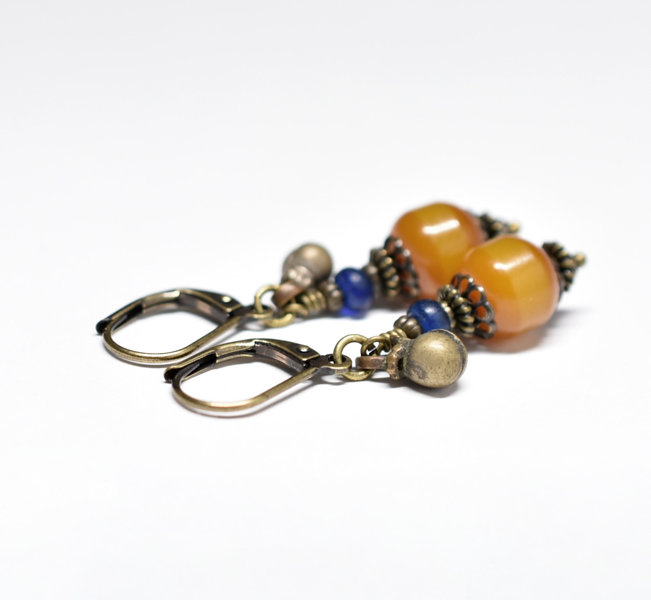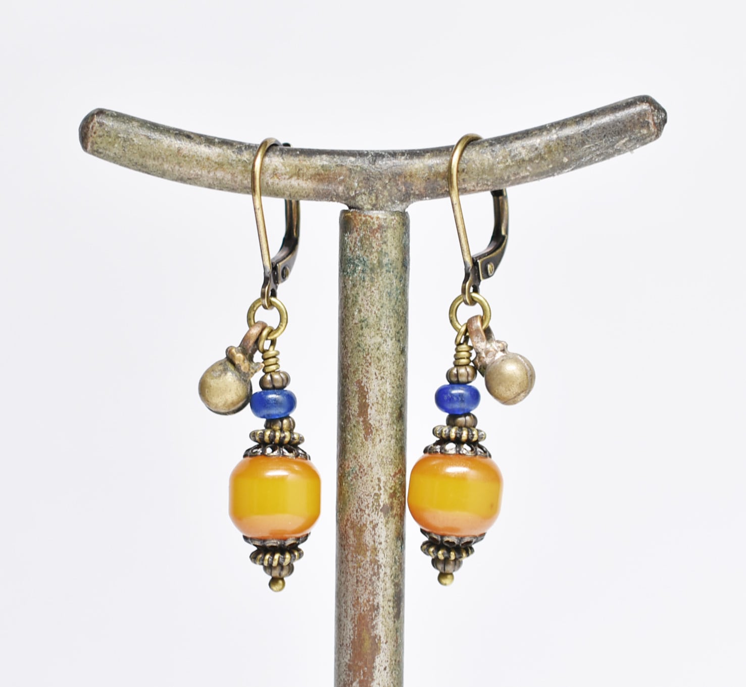 ツートン琥珀色アフリカンアンバーとブルービーズ、民族鈴を繋いだピアスです。