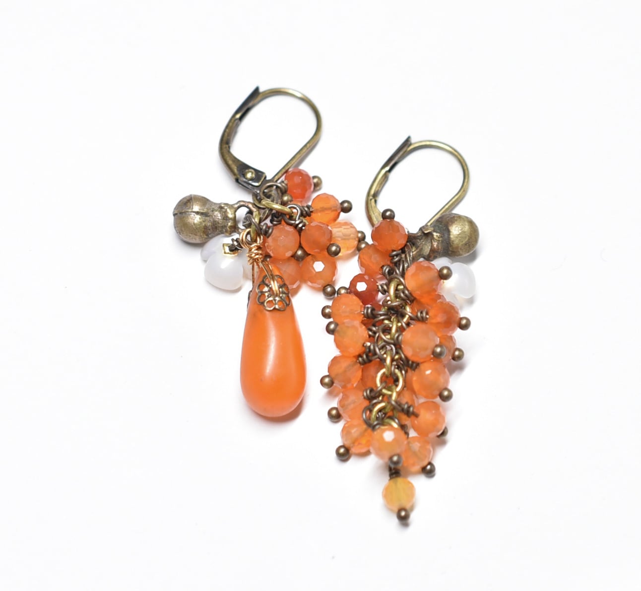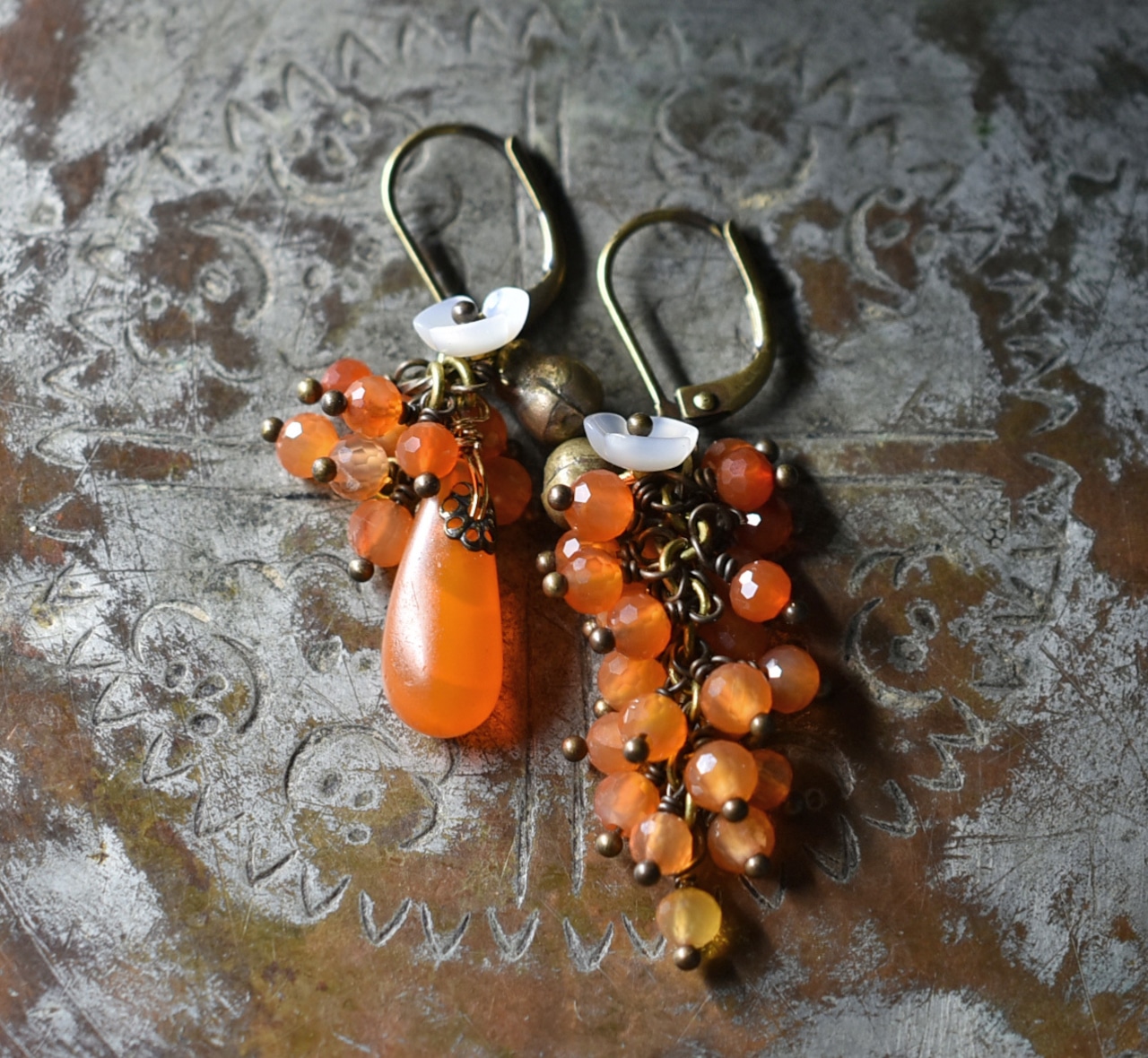 オレンジウエディングビーズ、たわわなカーネリアン、白蝶貝の小花、民族鈴を繋いだピアスです。