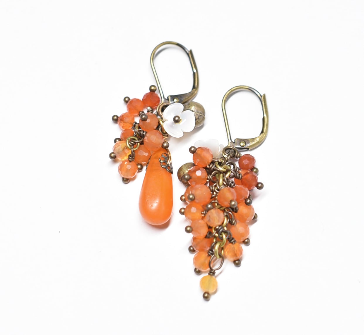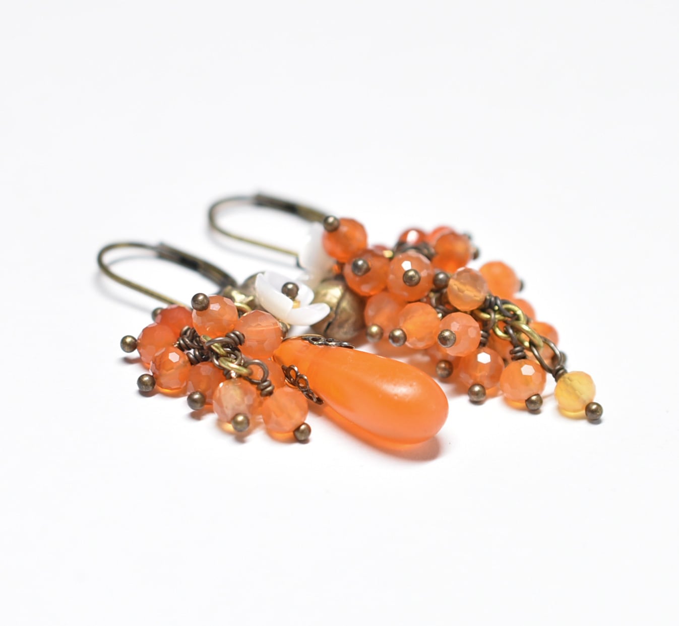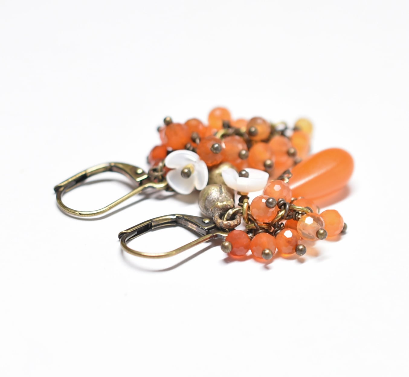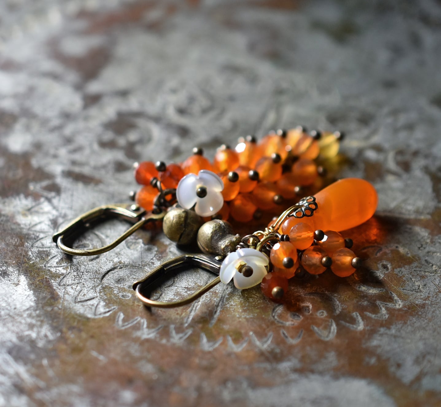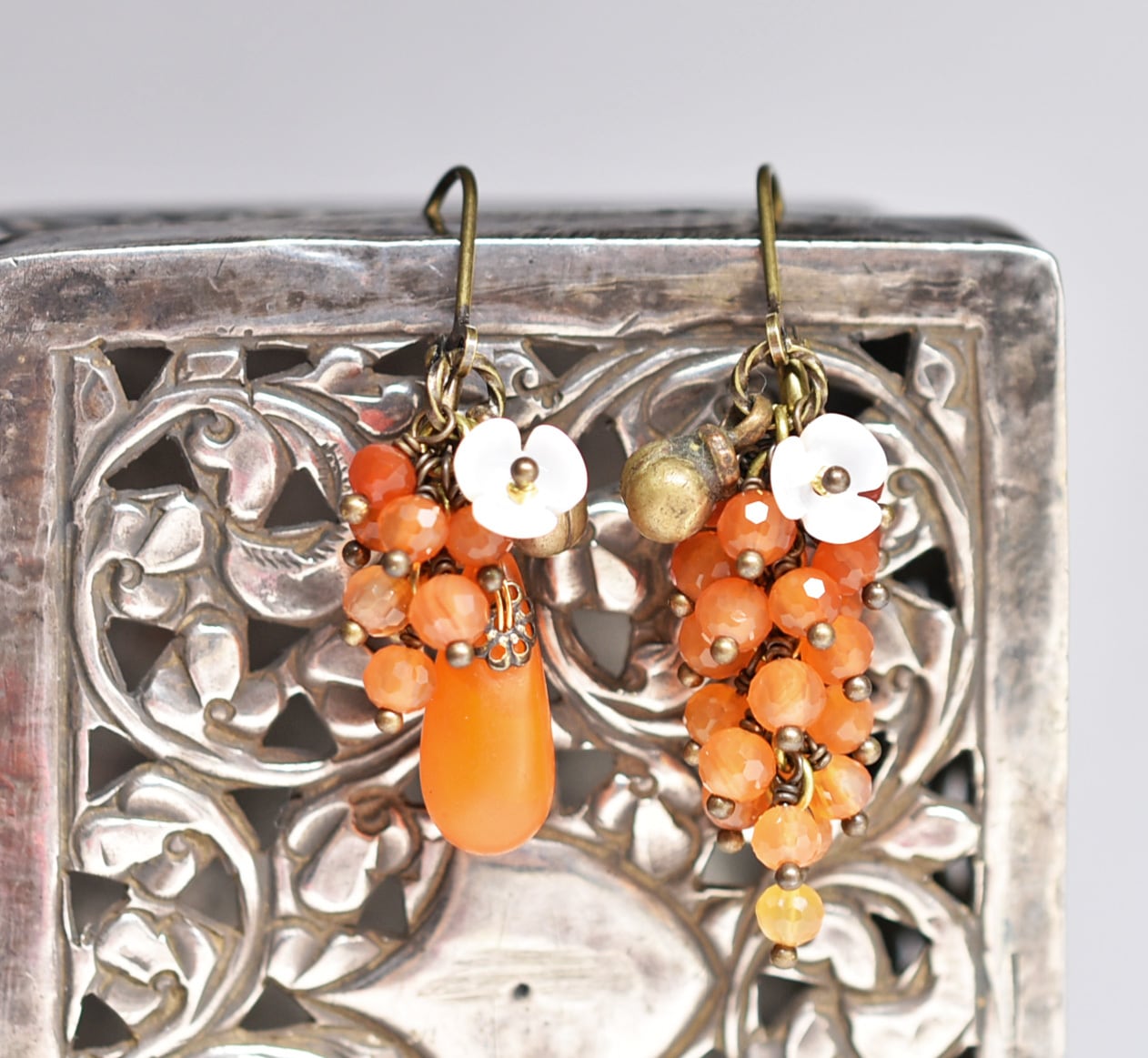 オレンジウエディングビーズ、たわわなカーネリアン、白蝶貝の小花、民族鈴のピアス