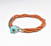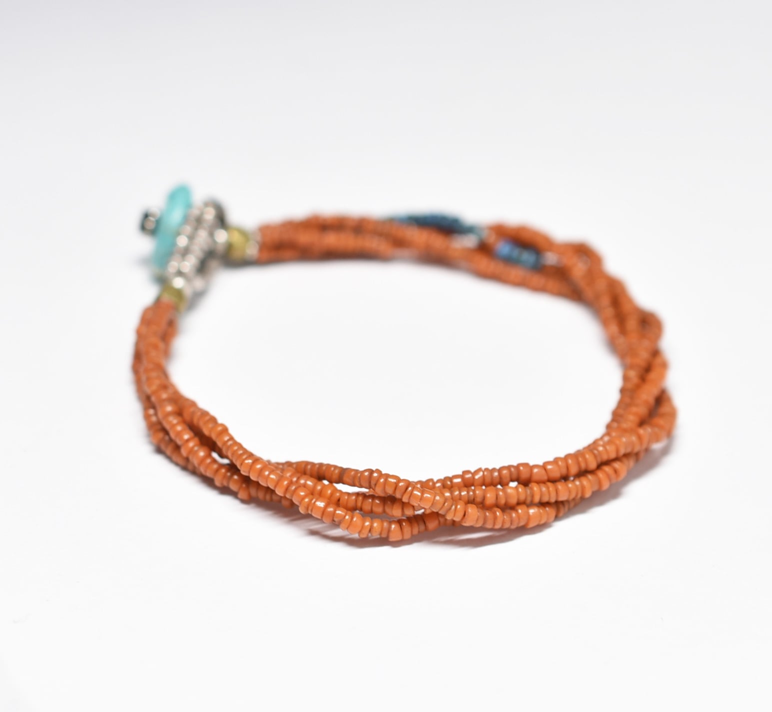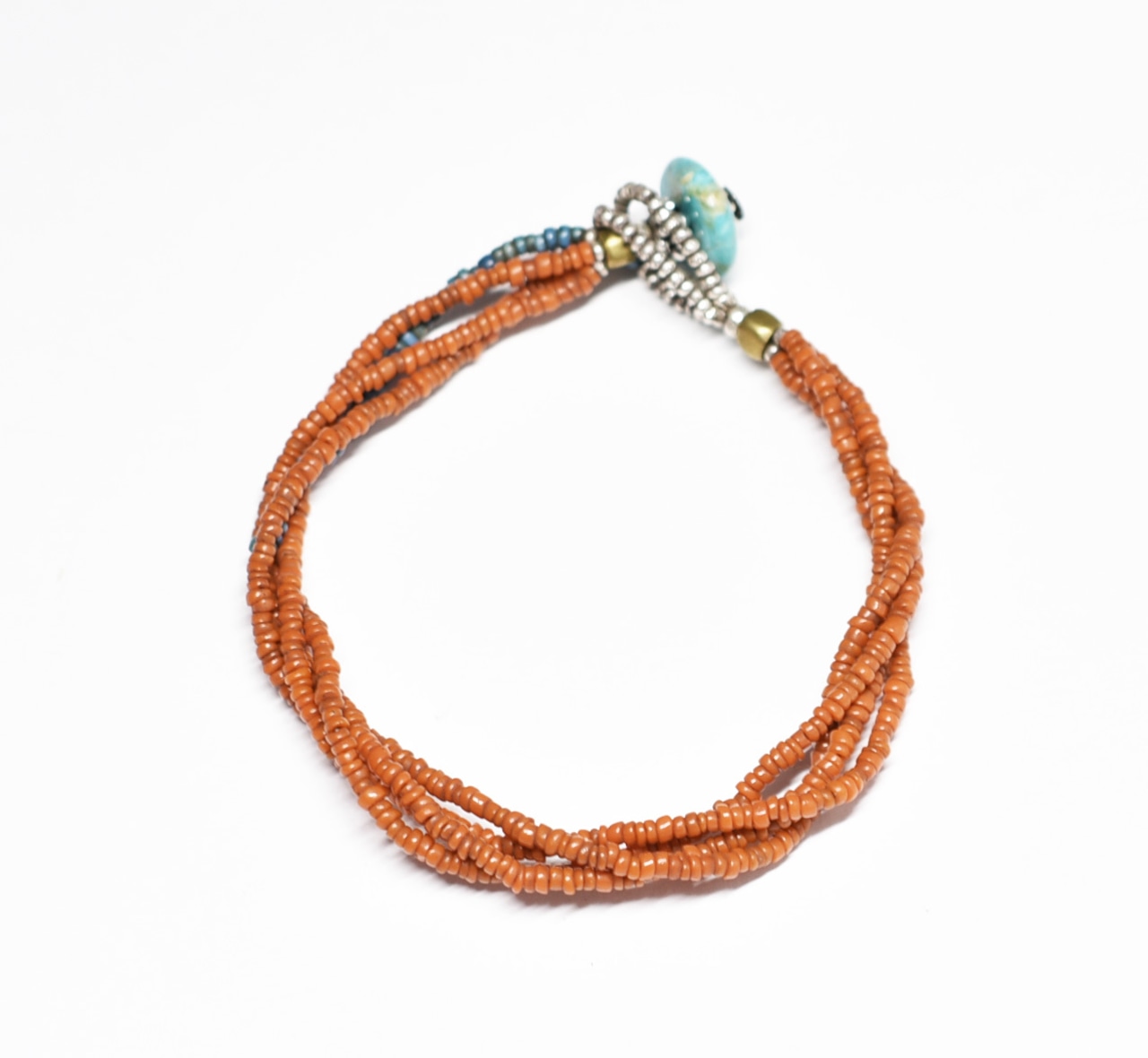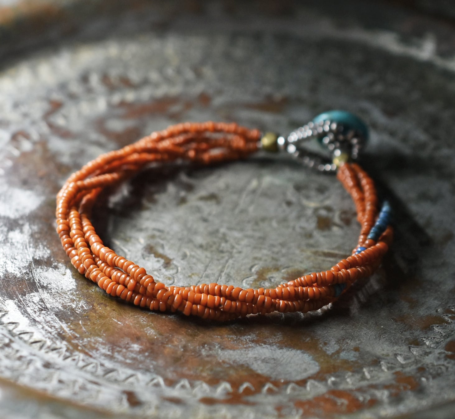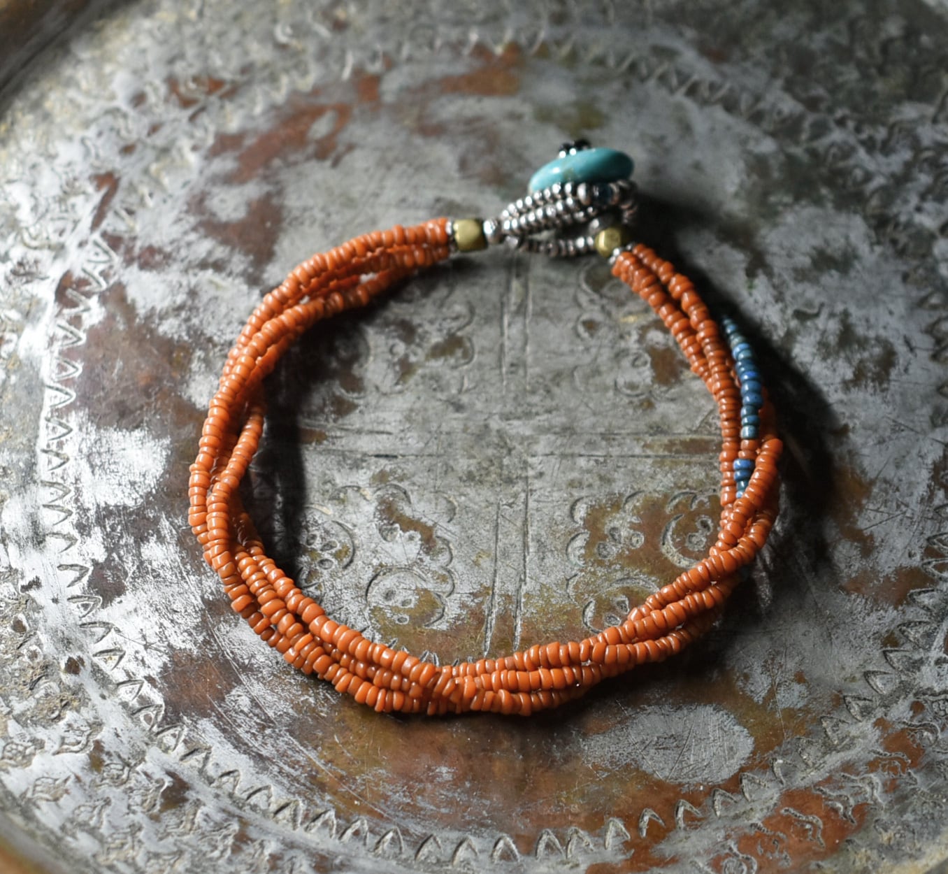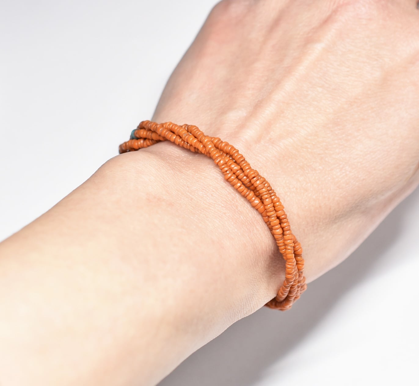 アンティークオレンジ色シードビーズとエメラルドブルーのビーズを4連にしたブレスです。