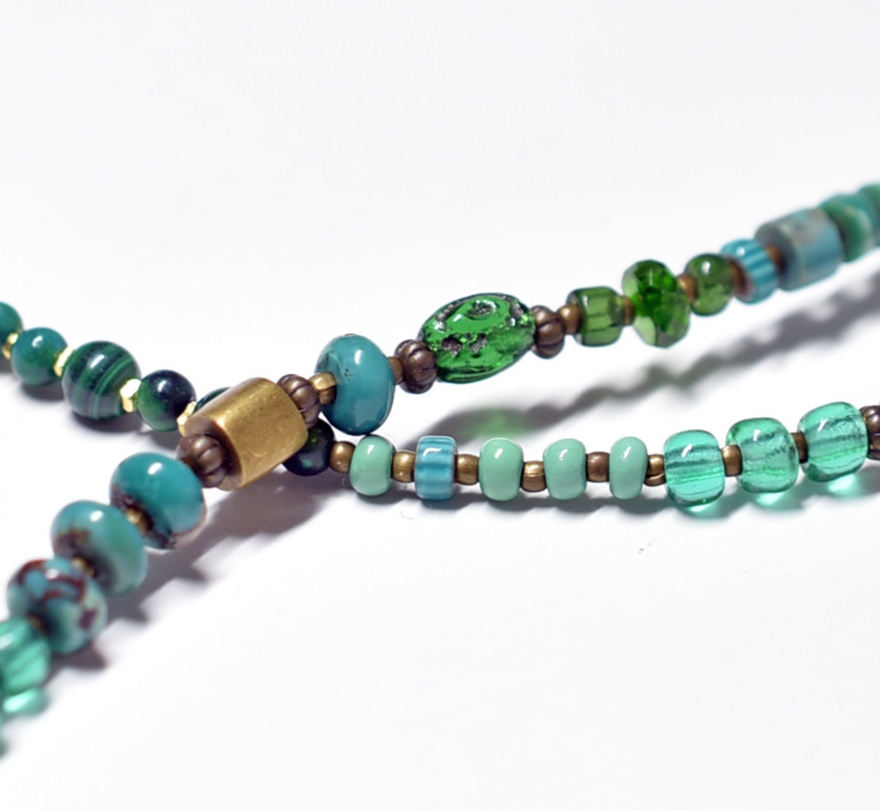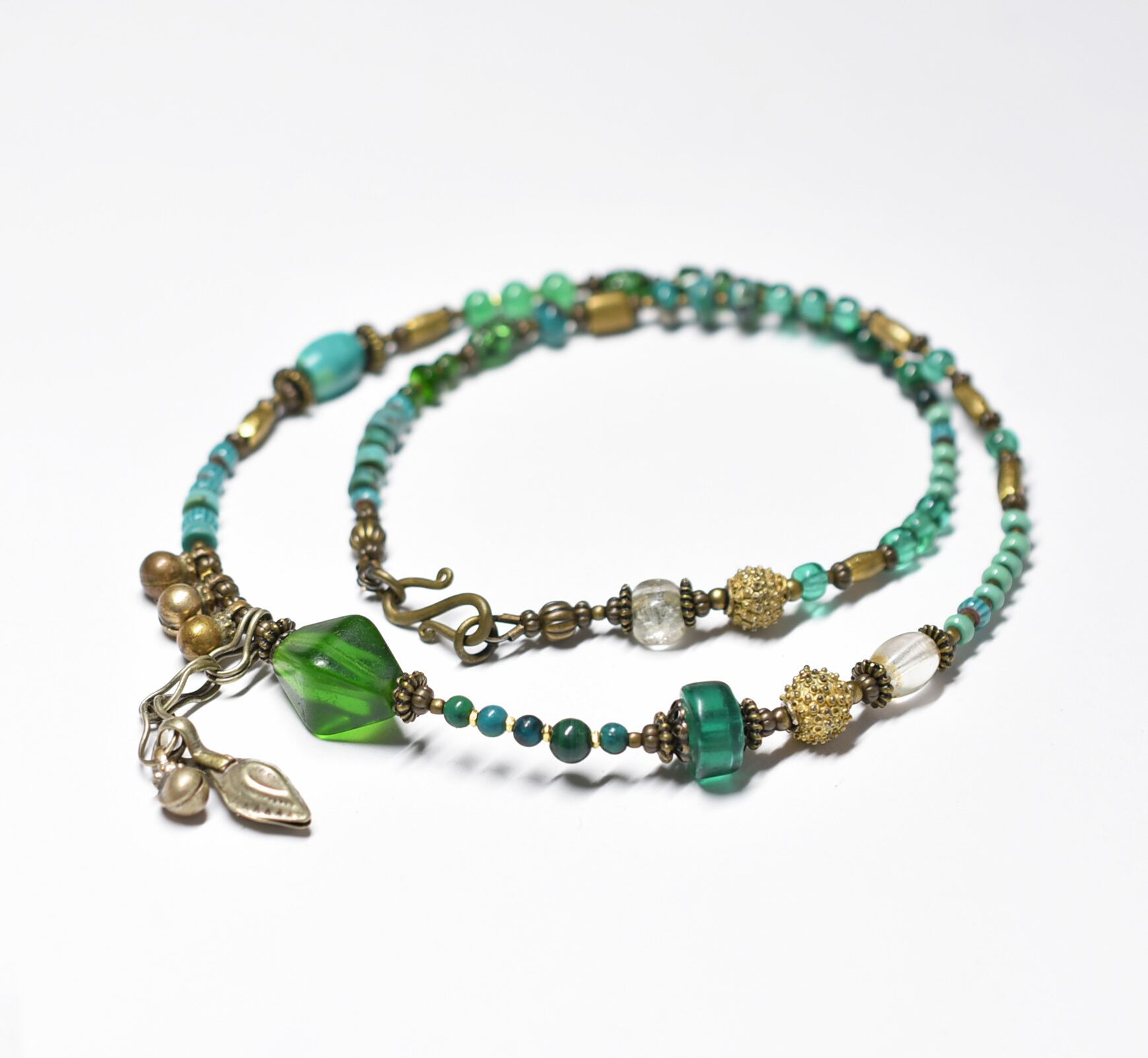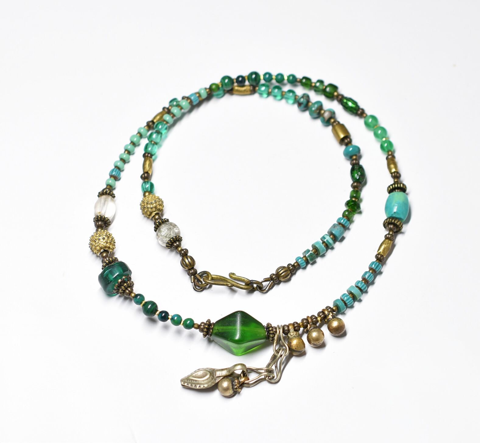 グリーンボヘミアビーズとアフガンパーツ&民族鈴、クリアビーズ、つぶつぶブラス、多彩グリーンビーズ、ターコイズ&クリソコラ&マラカイトのネックレス