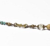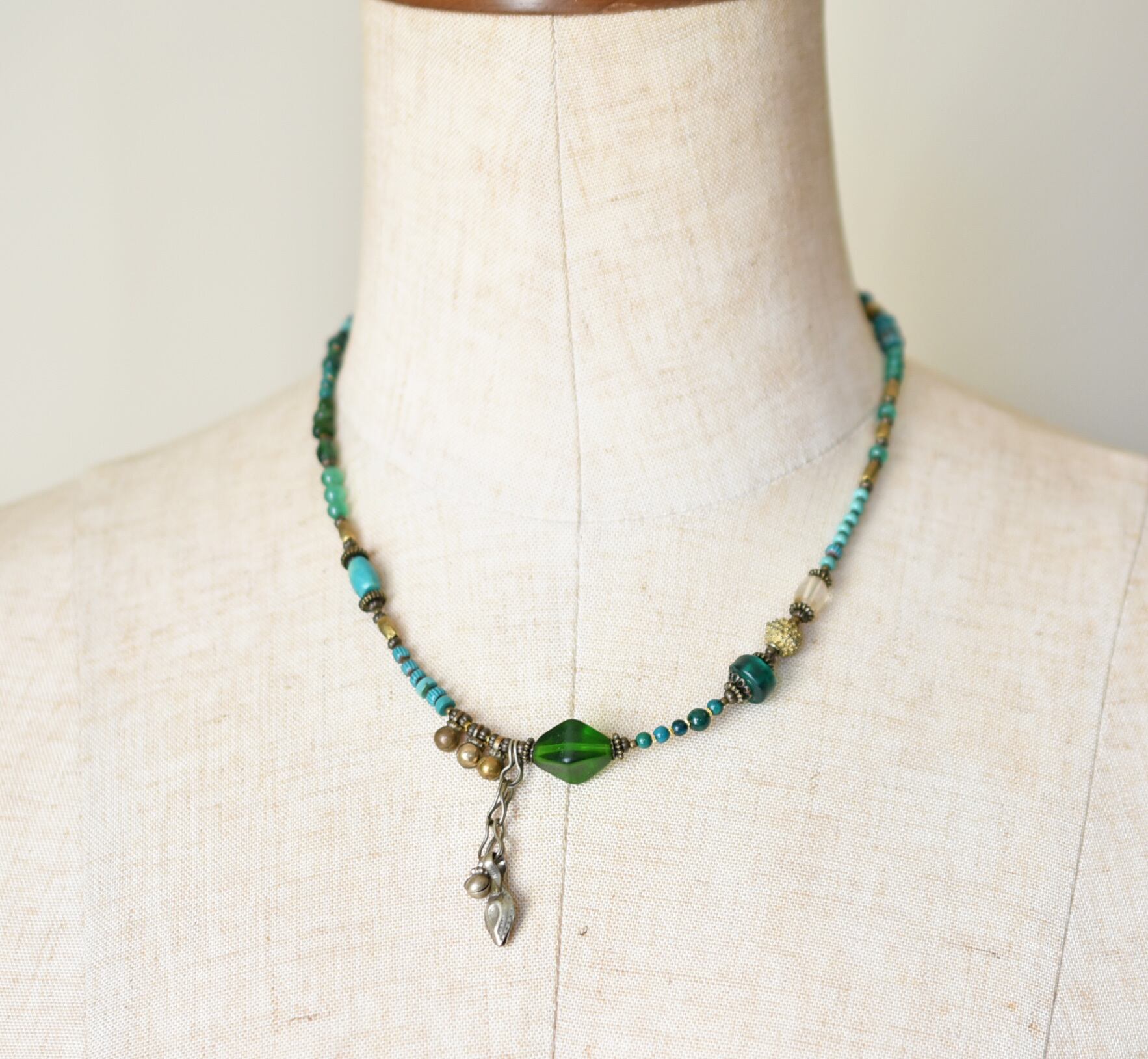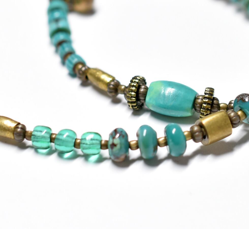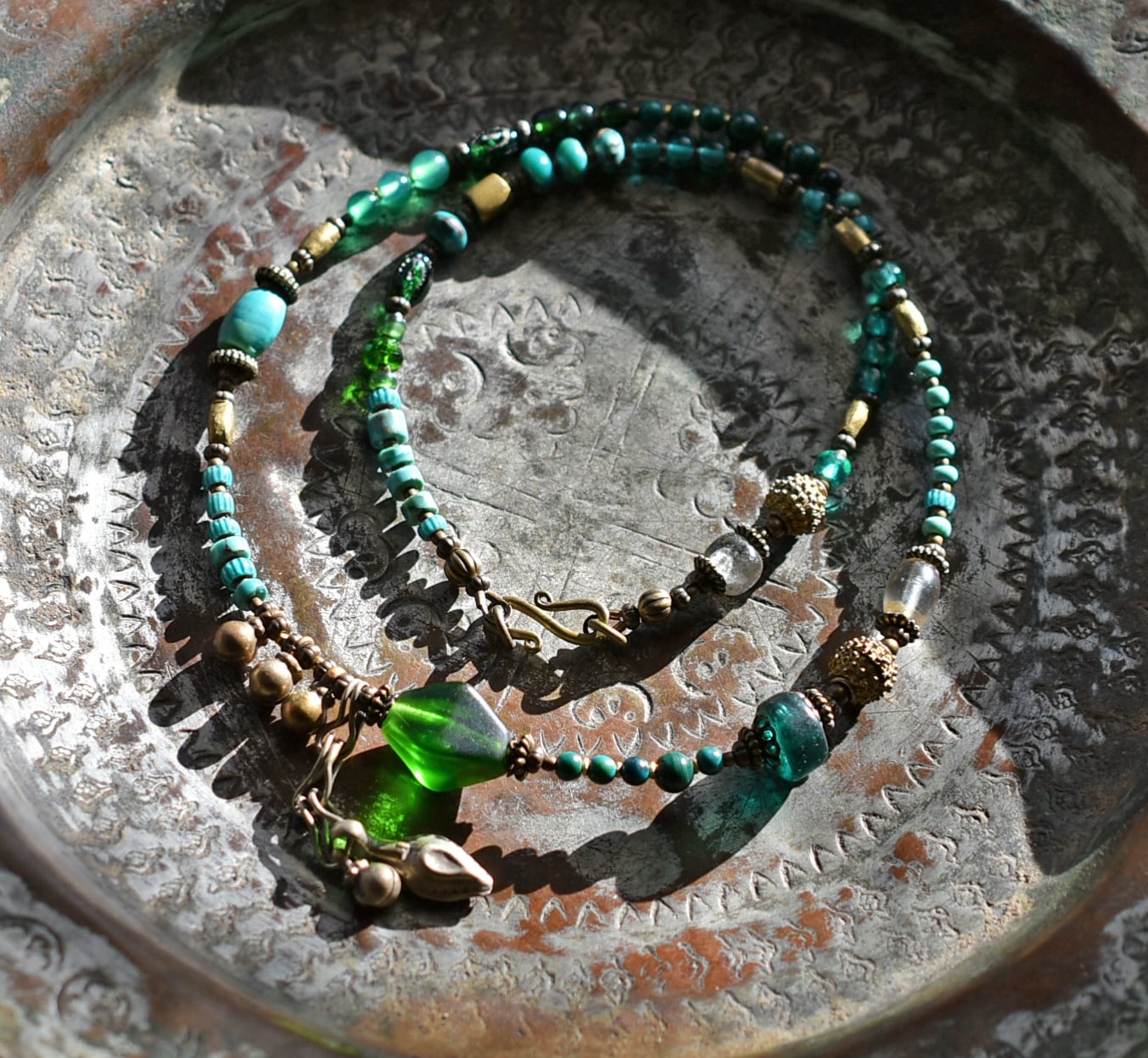 グリーンボヘミアビーズとアフガンパーツ&民族鈴、クリアビーズ、つぶつぶブラス、多彩グリーンビーズ、ターコイズ&クリソコラ&マラカイトのネックレス