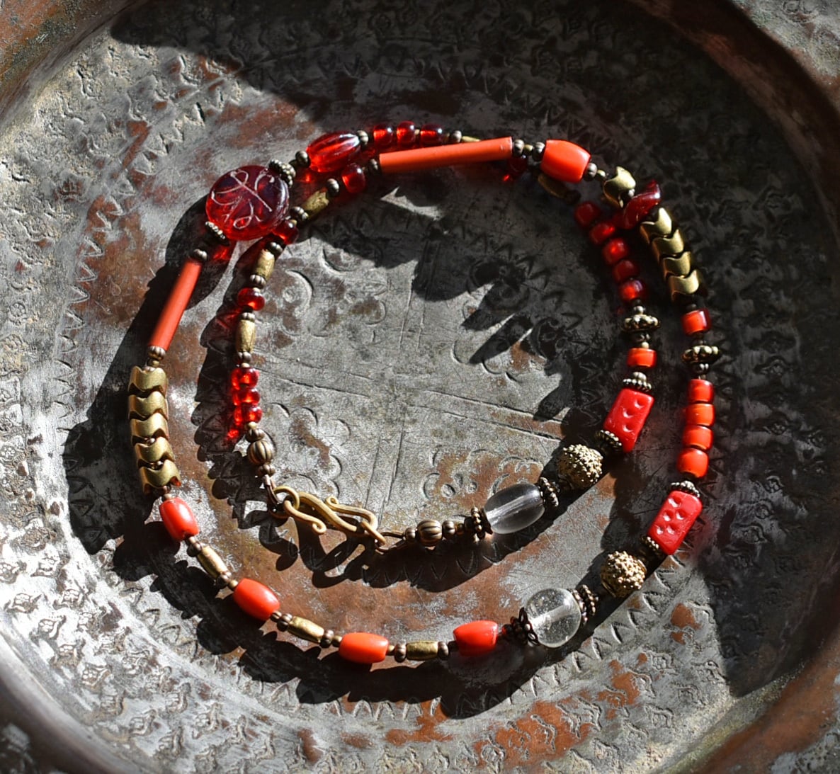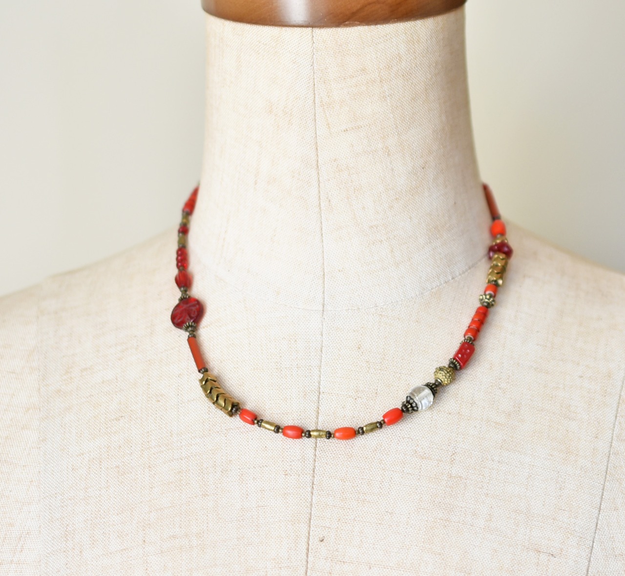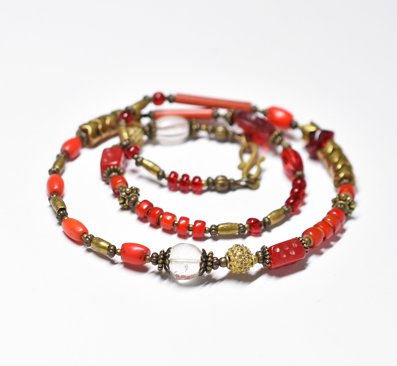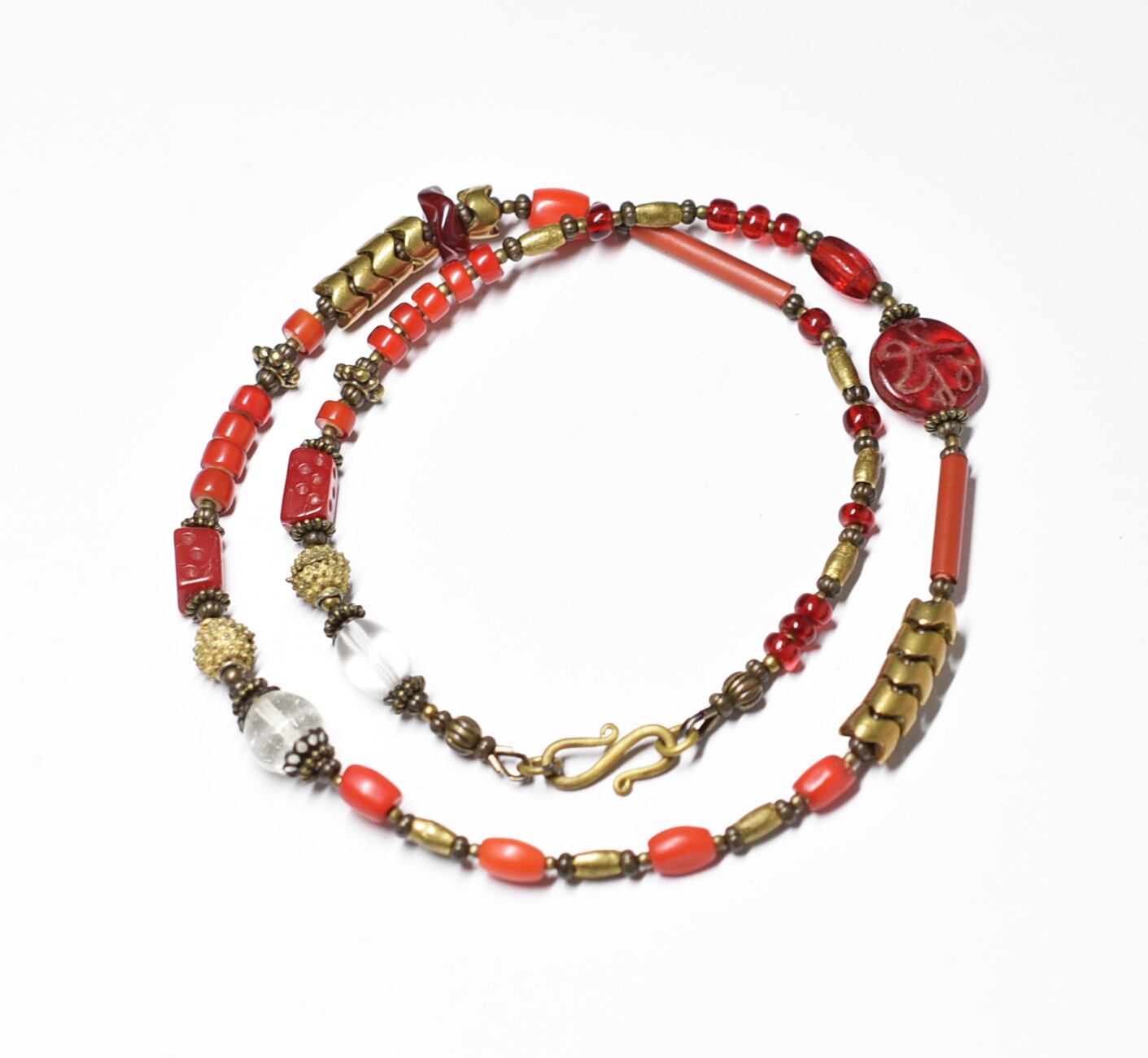 深紅ダイスビーズとクリアビーズ、つぶつぶブラス、グラスコーラル、聖者のビーズ、ホワイトハーツ、スネークブラス、深紅ヴェネチアビーズのネックレス