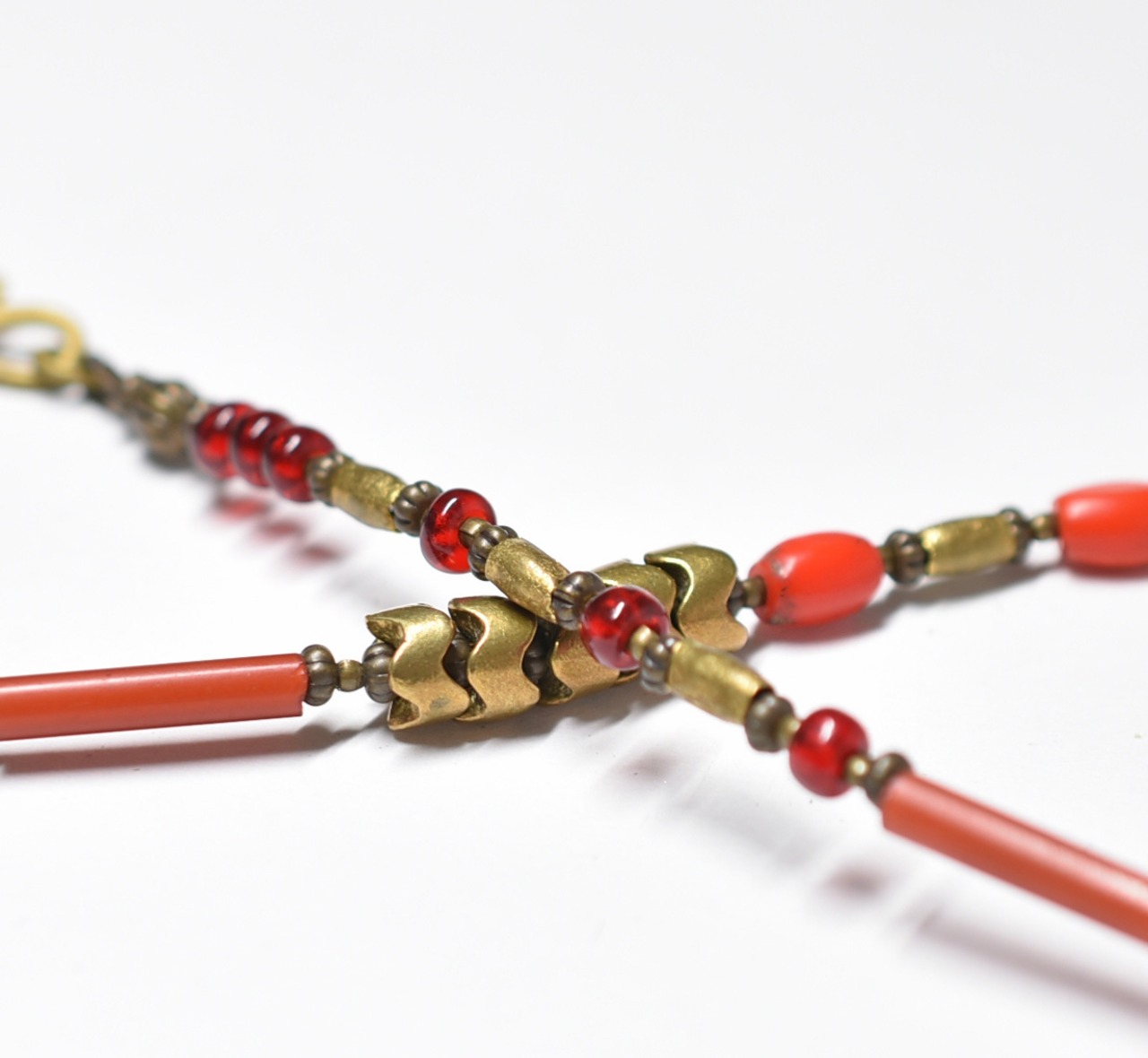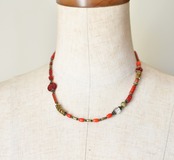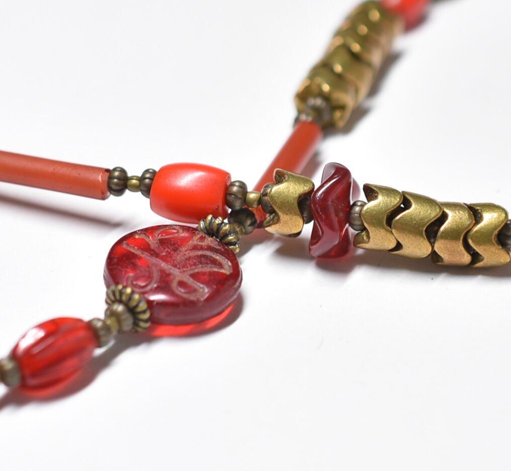 様々なアンティーク、ヴィンテージの赤いビーズが楽しめ、民族間のあるネックレスです。