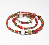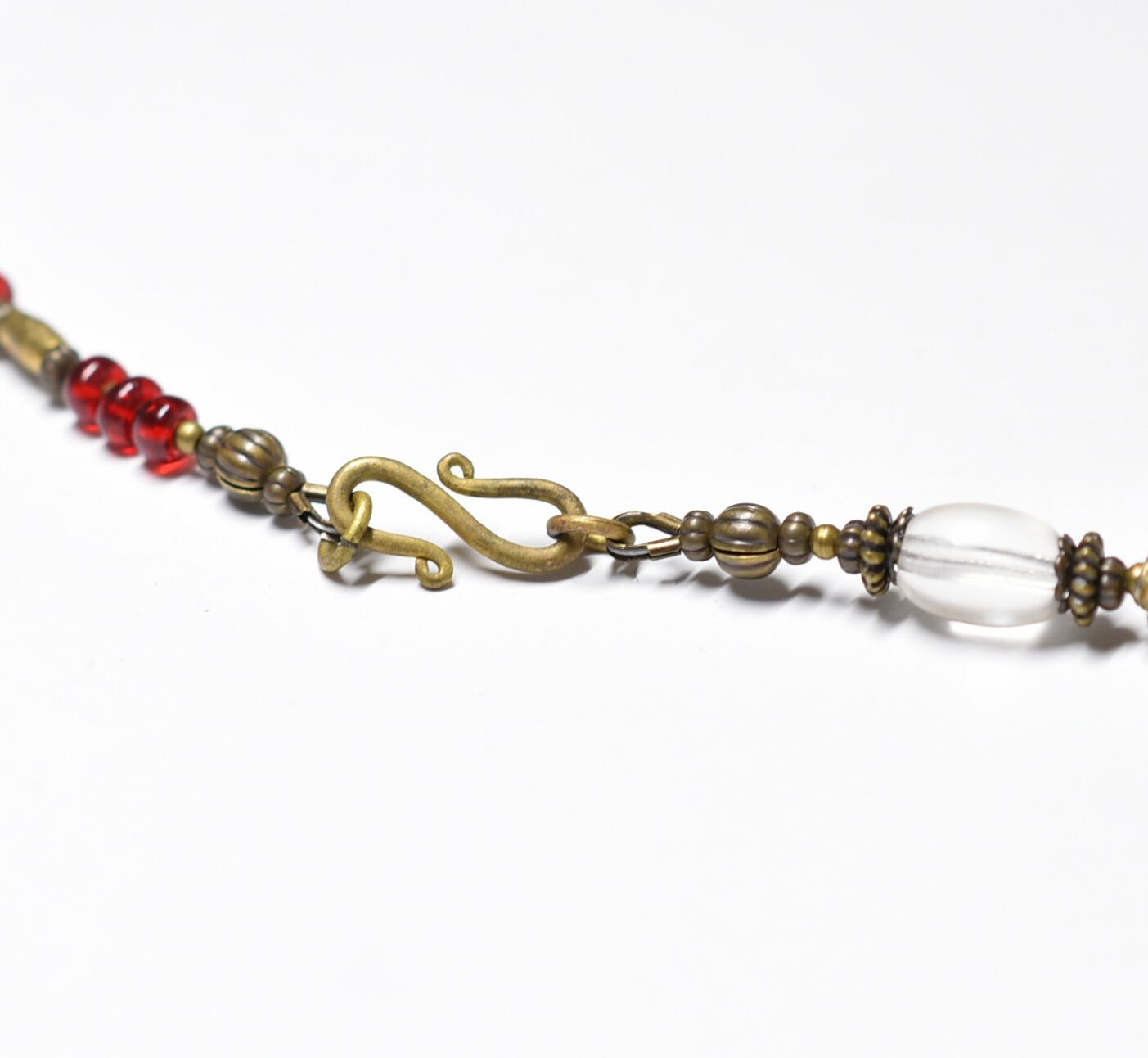 深紅ダイスビーズとクリアビーズ、つぶつぶブラス、グラスコーラル、聖者のビーズ、ホワイトハーツ、スネークブラス、深紅ヴェネチアビーズなどっを繋いだネックレスです。