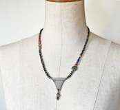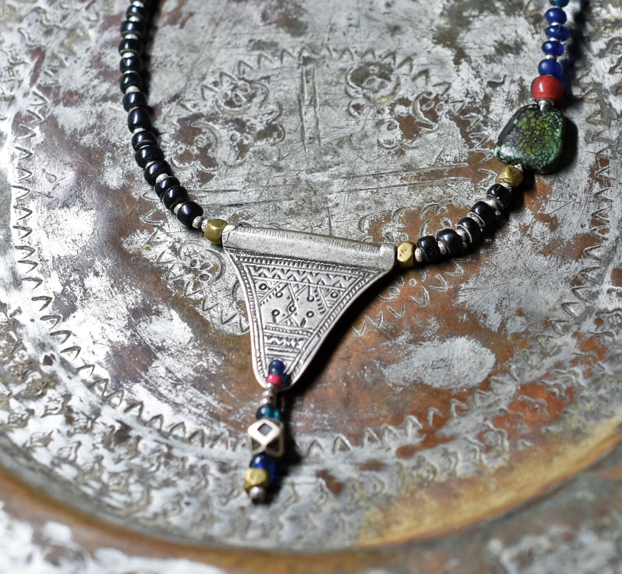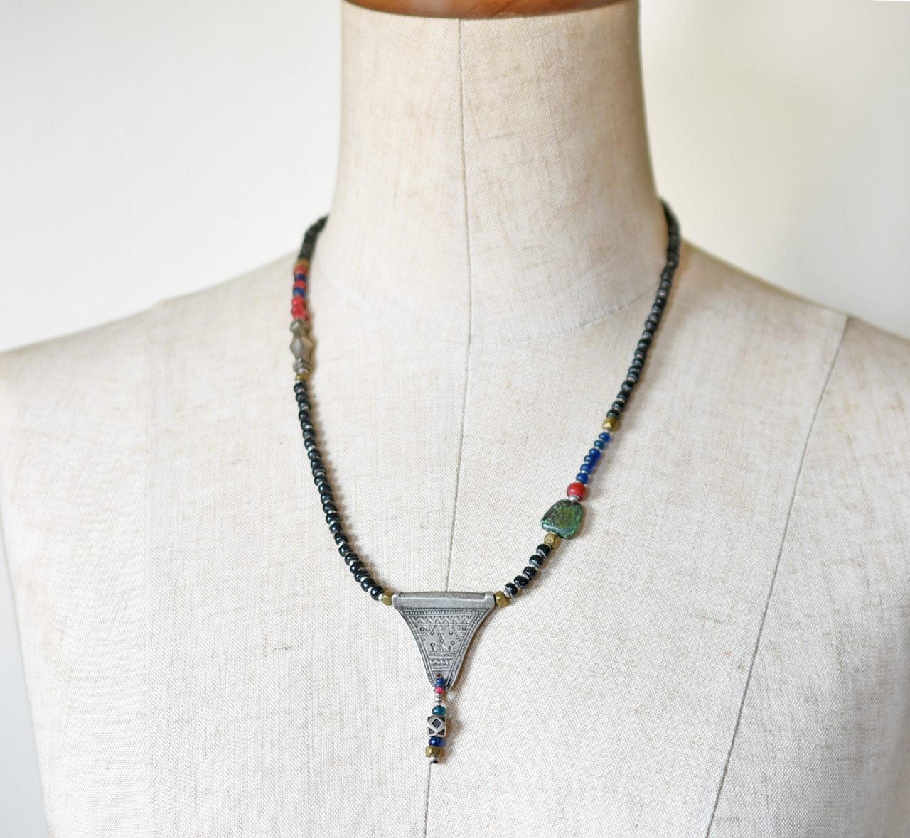 oldトゥアレグシルバーTOPと漆黒アンティoldチベタンターコイズ、漆黒ビーズと金赤ホワイトハーツ、ブルービーズなどを繋いだネックレスです。