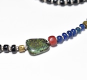 TOP部分の下に繋いだ立方体のビーズ、漆黒ビーズなどの途中に繋いだ少し湾曲したビーズもトゥアレグビーズです。